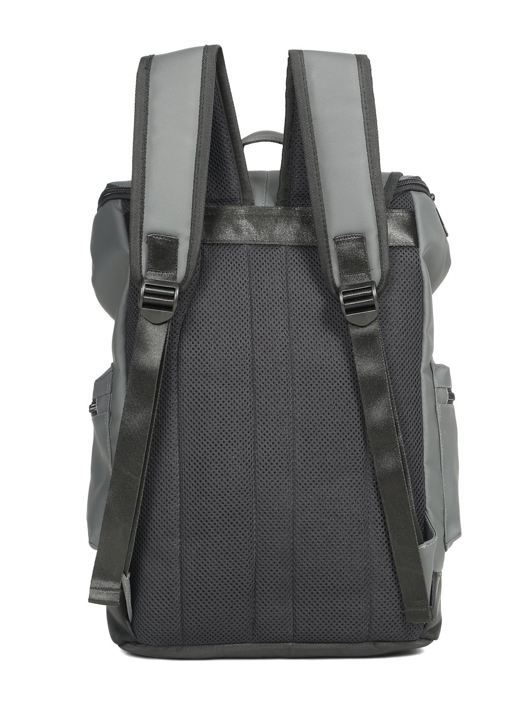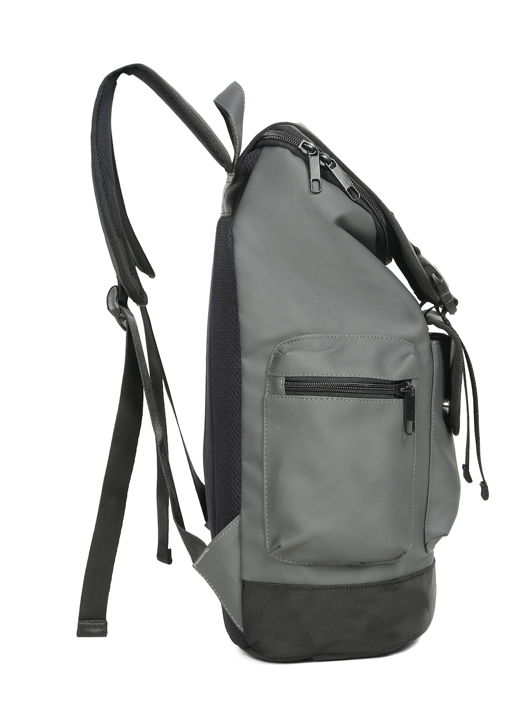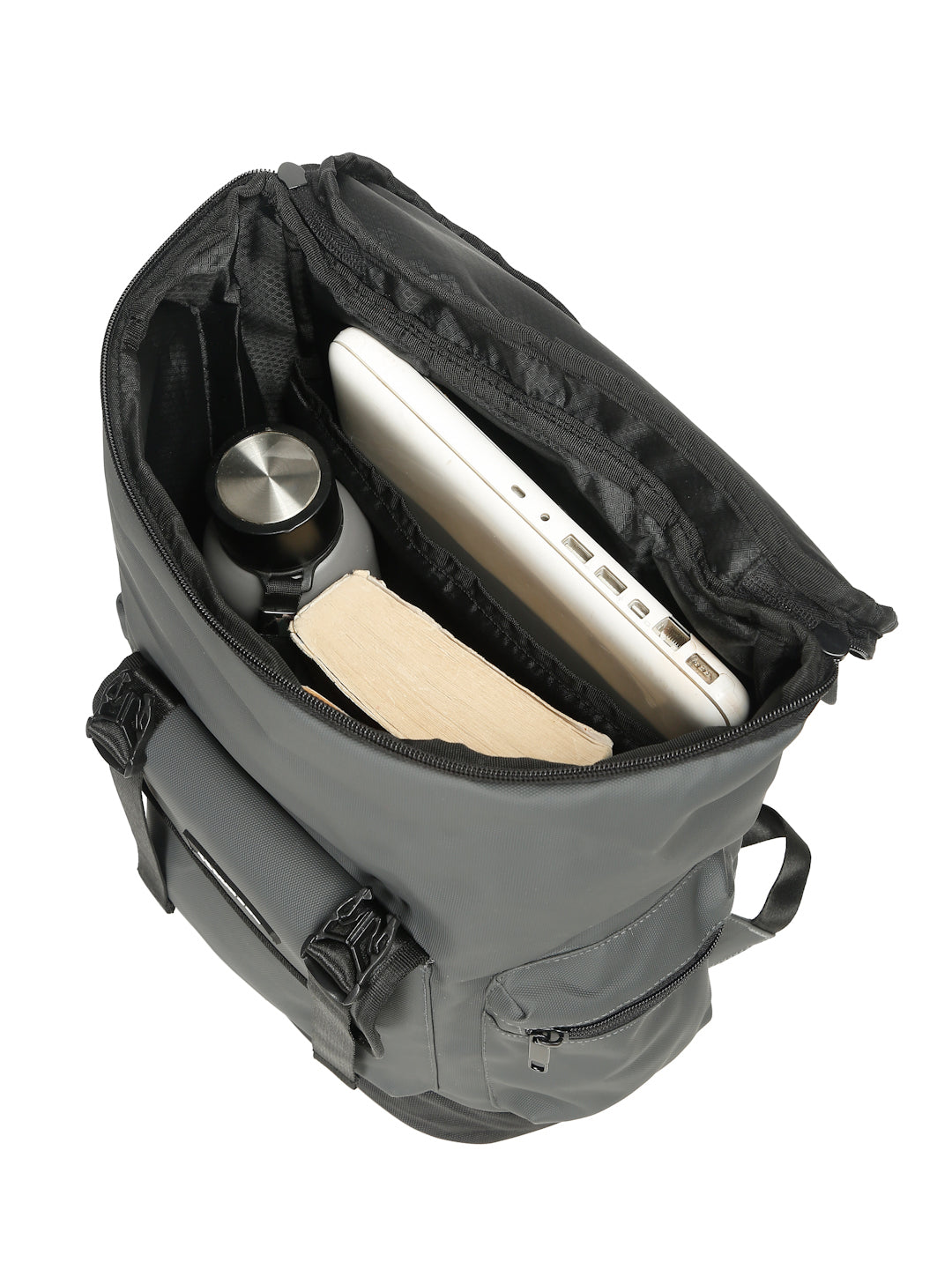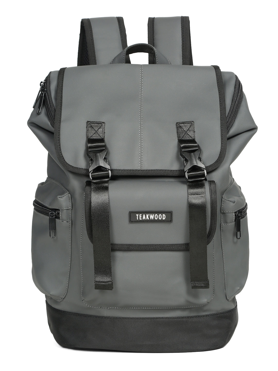 The minimalist grey color with black trims gives the backpack a premium and urban appeal. The flap-over design with utility straps adds to its rugged charm, while the organized compartments keep essentials neatly stored. Closure Type: Dual buckle closure with flap top and zipper underneath, Compartments:
