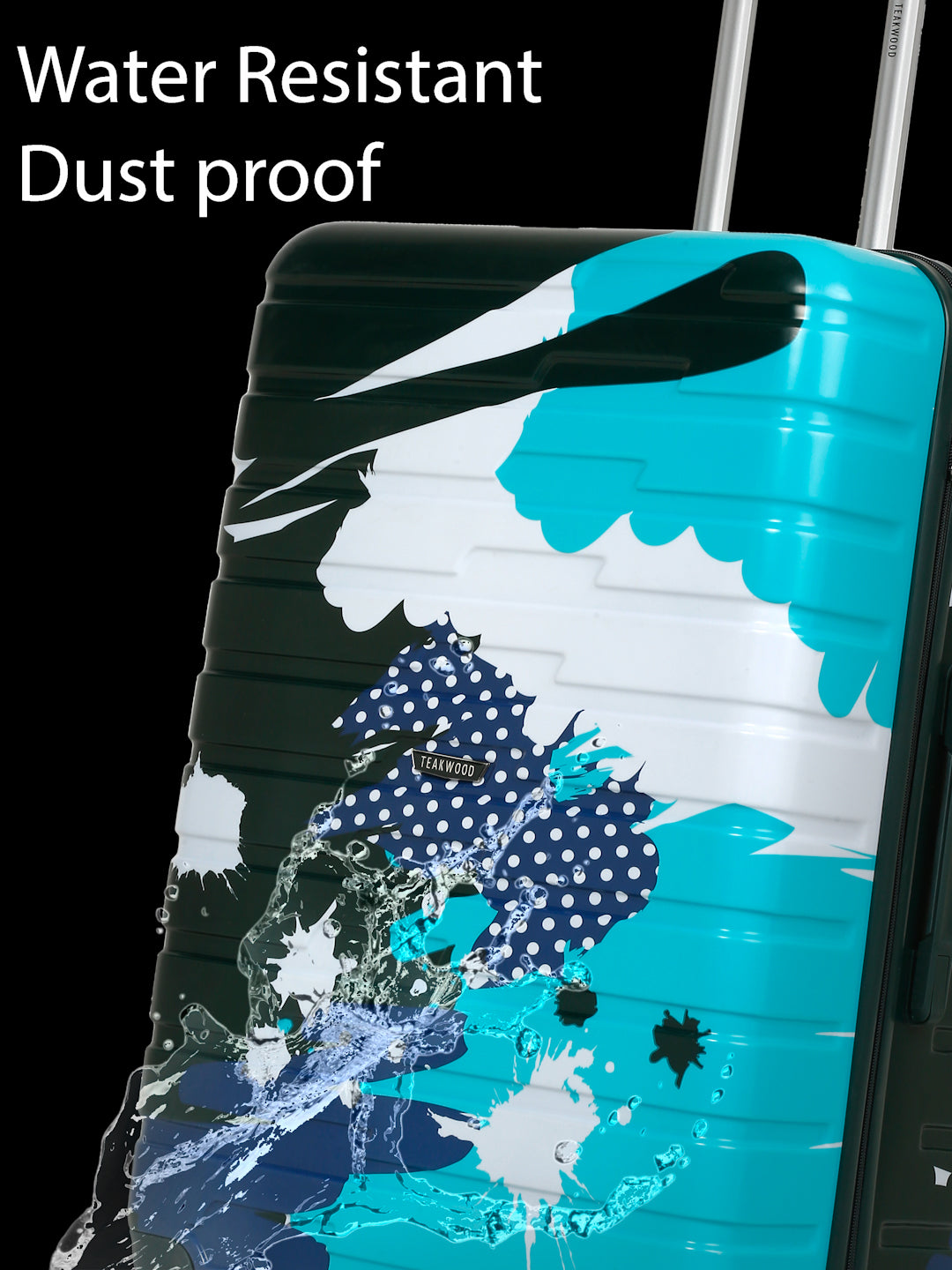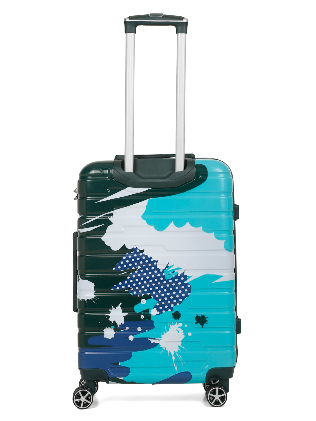 Make a statement while traveling with our Green Shade Abstract Printed Hard Sided Medium Size Trolley Bag with brand logo detail has 54.6 liters capacity, secured with a number lock. It has one main zip compartment, Zip lining with two compression straps, Has a sub-compartment, secured with a zip closure and 2 inner zip pockets. One handle on the top and one on the side, has a retractable handle on the top and eight 360-degree rotatable corner-mounted skate wheels.