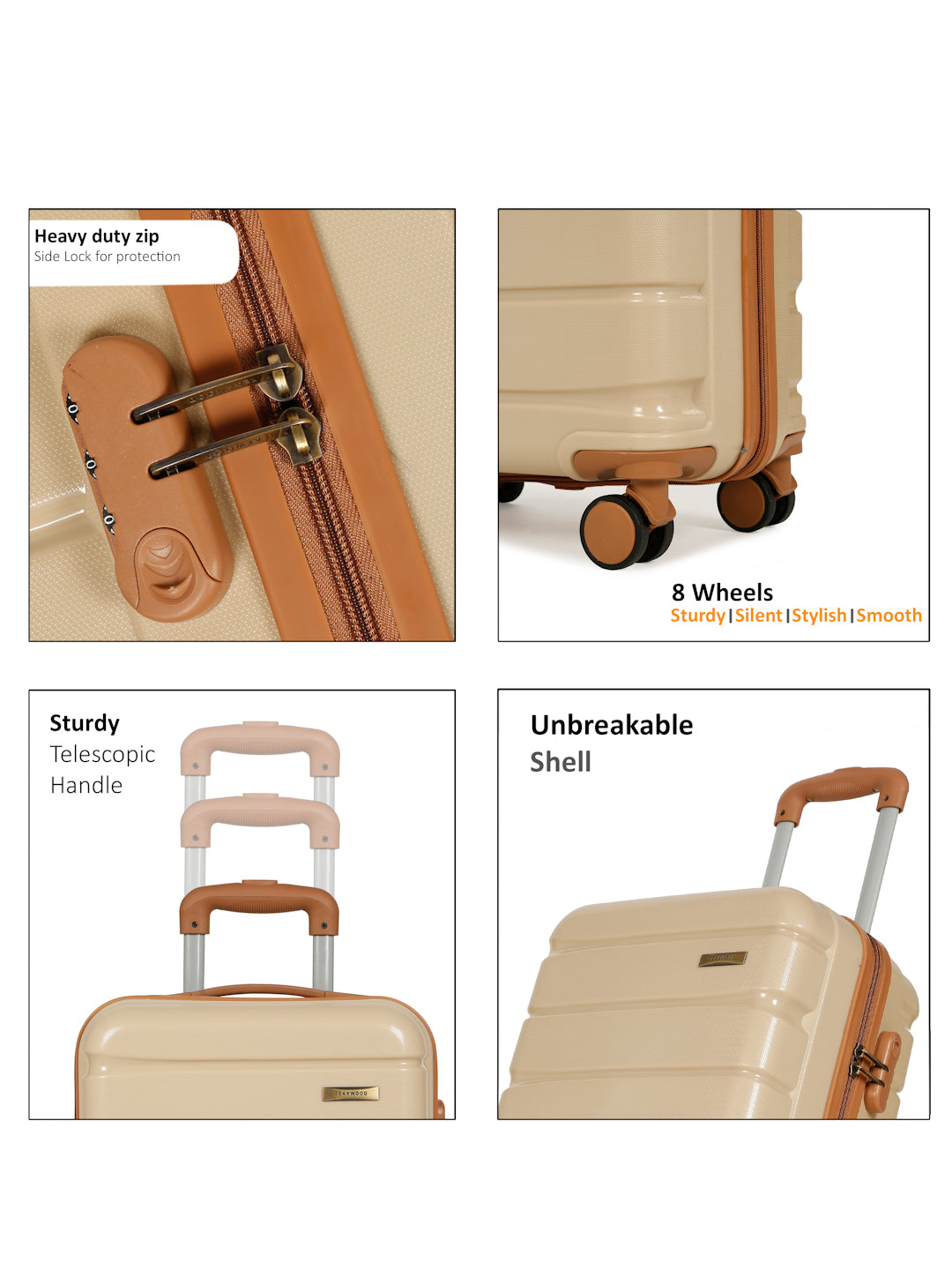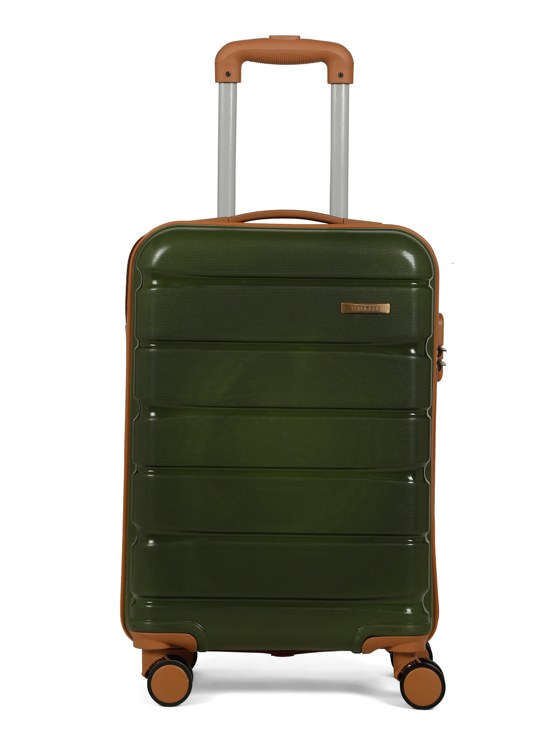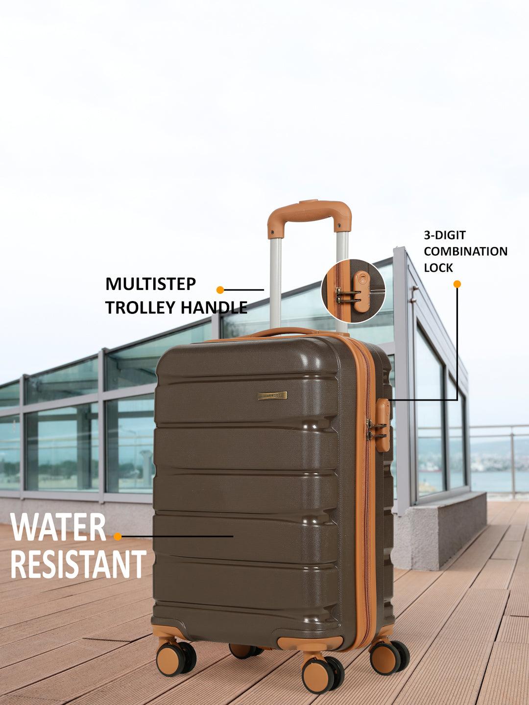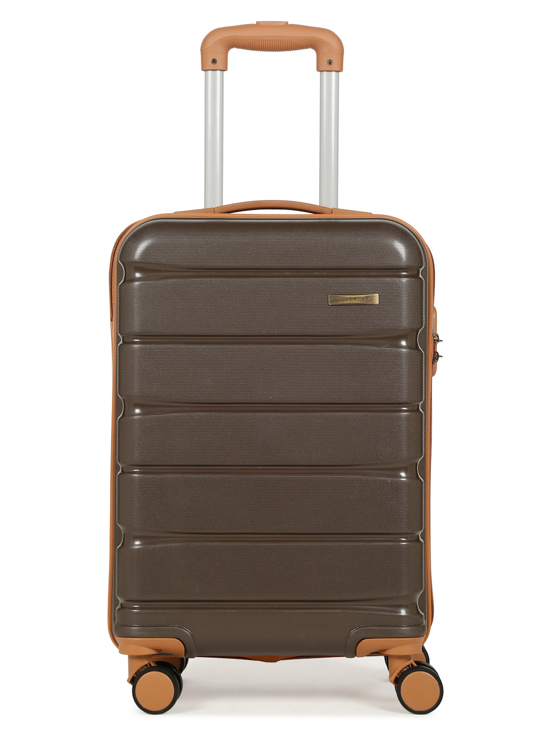 PRODUCT DETAILS: This Teakwood textured hard-sided cabin-sized trolley bag secured with a number lock One handle on the top and a retractable handle on the top Eight 360-degree rotatable corner-mounted skate wheels One main zip compartment Zip lining with two compression straps Has a sub-compartment, secured with a zip closure Warranty: 2 Years Warranty provided by brand/manufacturer