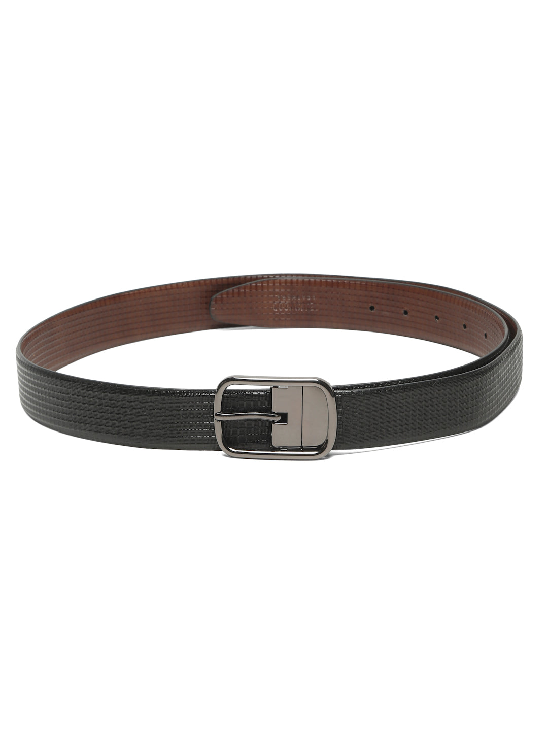 This teakwood leather texture finish men's leather belt features a stylish textured black outer surface with a smooth brown inner lining. It is crafted from high-quality genuine leather for durability and comfort. The black tone metal tang buckle adds a sleek touch, making it a perfect accessory for both formal and casual outfits.