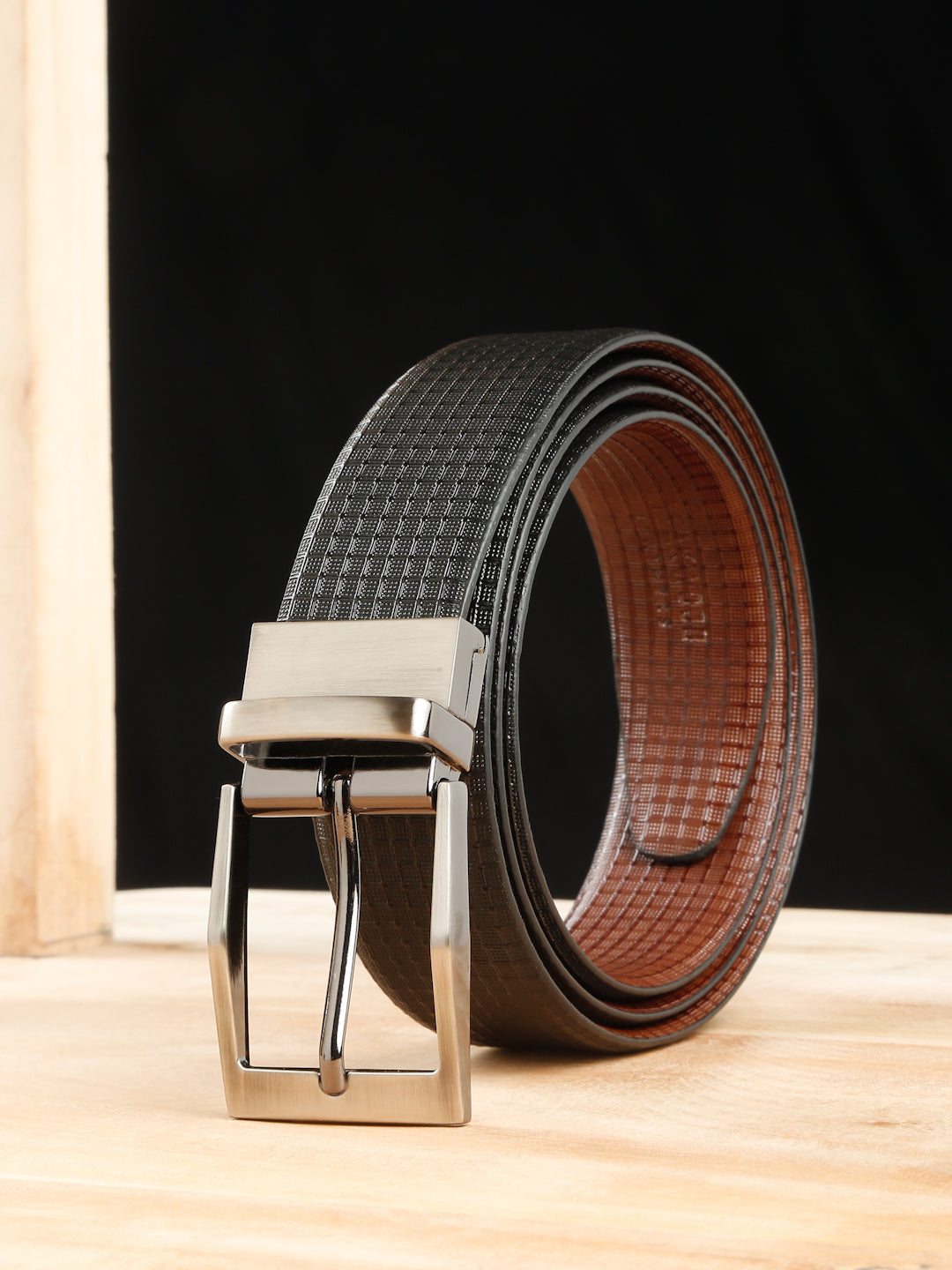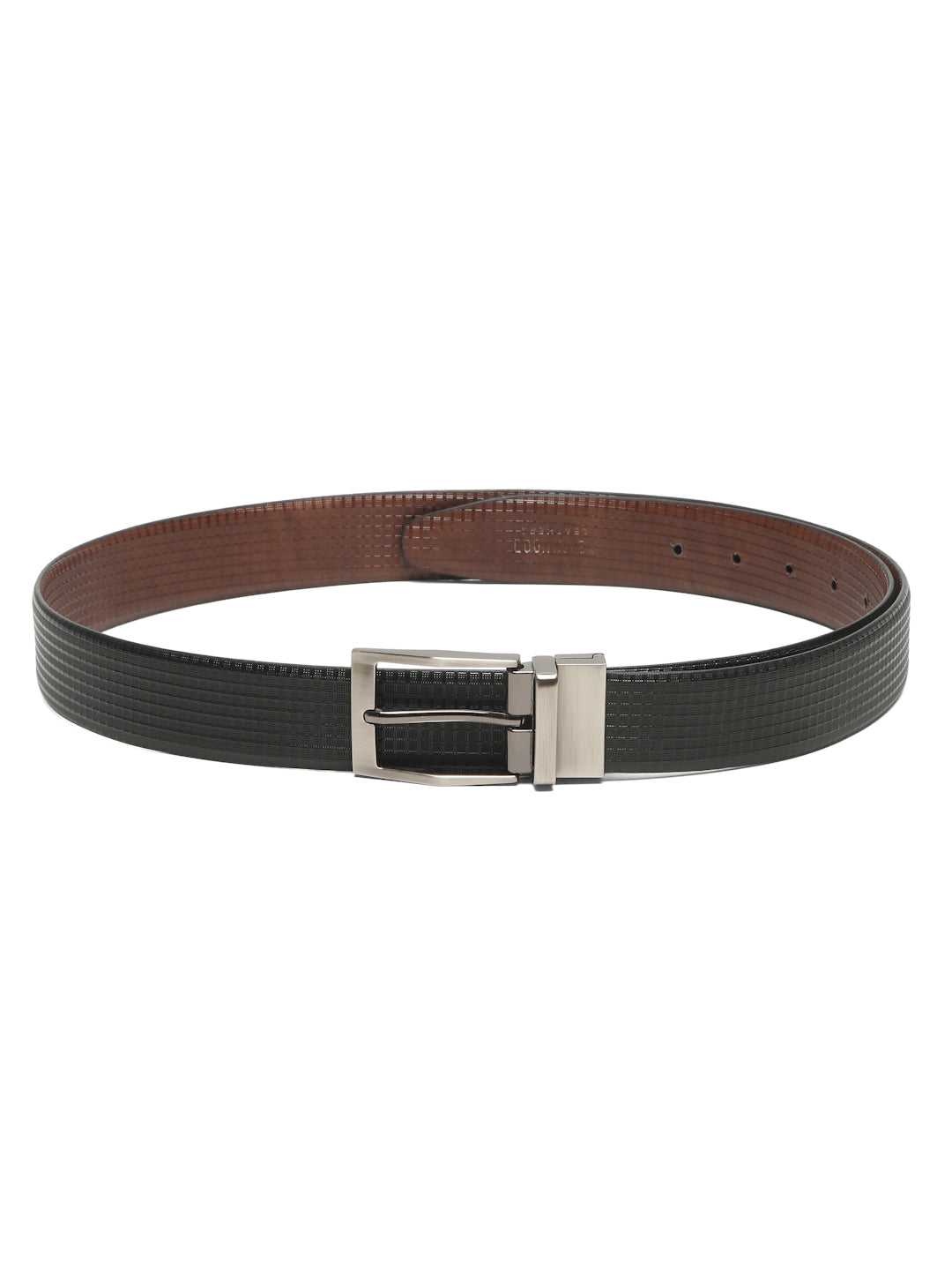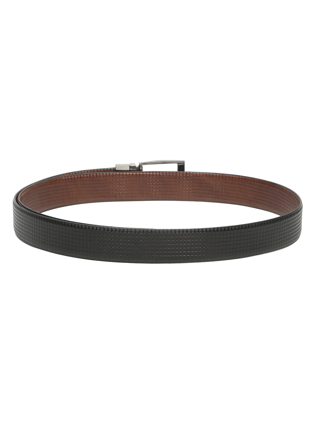 This teakwood leather texture finish men's leather belt features a stylish textured black outer surface with a smooth brown inner lining. It is crafted from high-quality genuine leather for durability and comfort. The silver tone metal tang buckle adds a sleek touch, making it a perfect accessory for both formal and casual outfits.