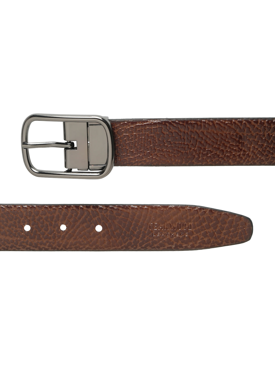 This teakwood leather men's leather belt features a stylish textured black outer surface with a smooth brown inner lining. It is crafted from high-quality genuine leather for durability and comfort. The black-tone metal tang buckle adds a sleek touch, making it a perfect accessory for both formal and casual outfits.
