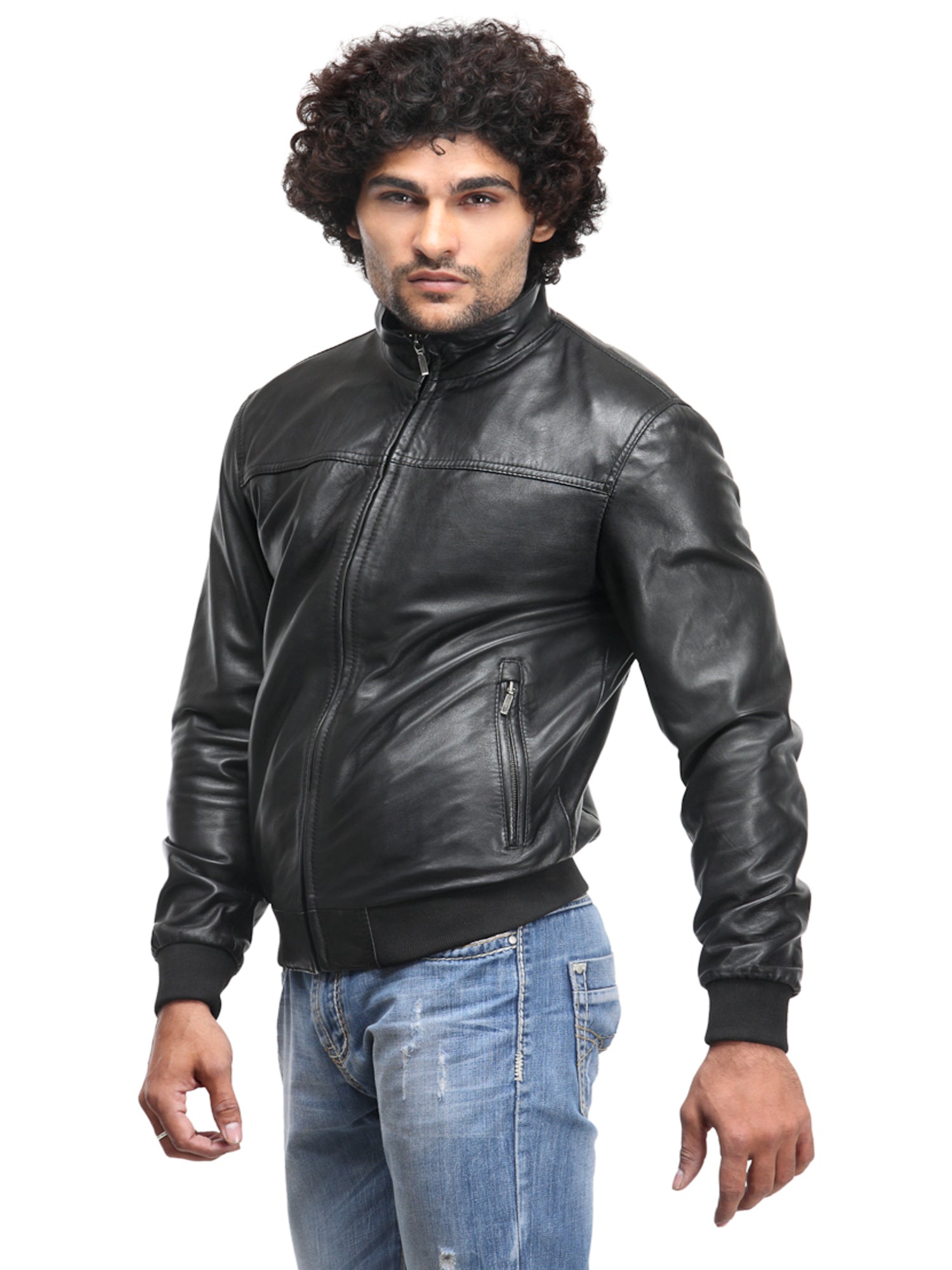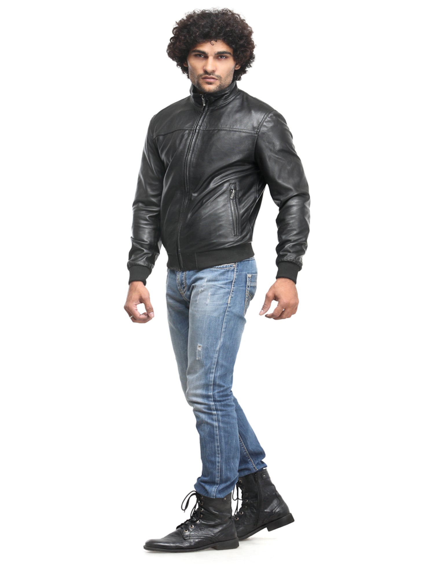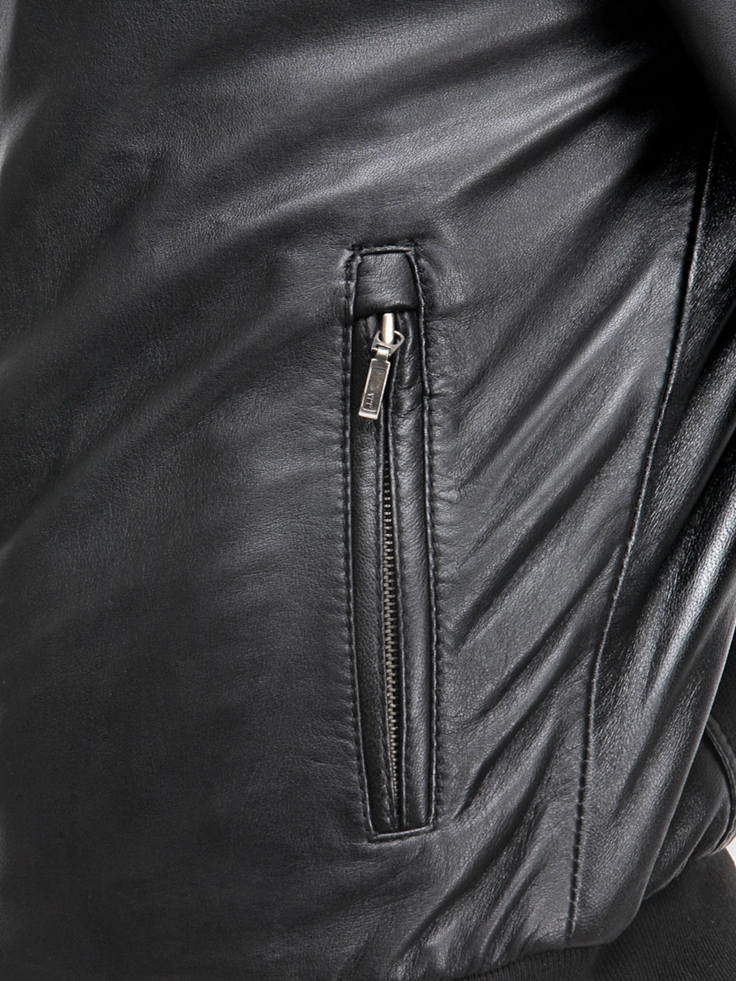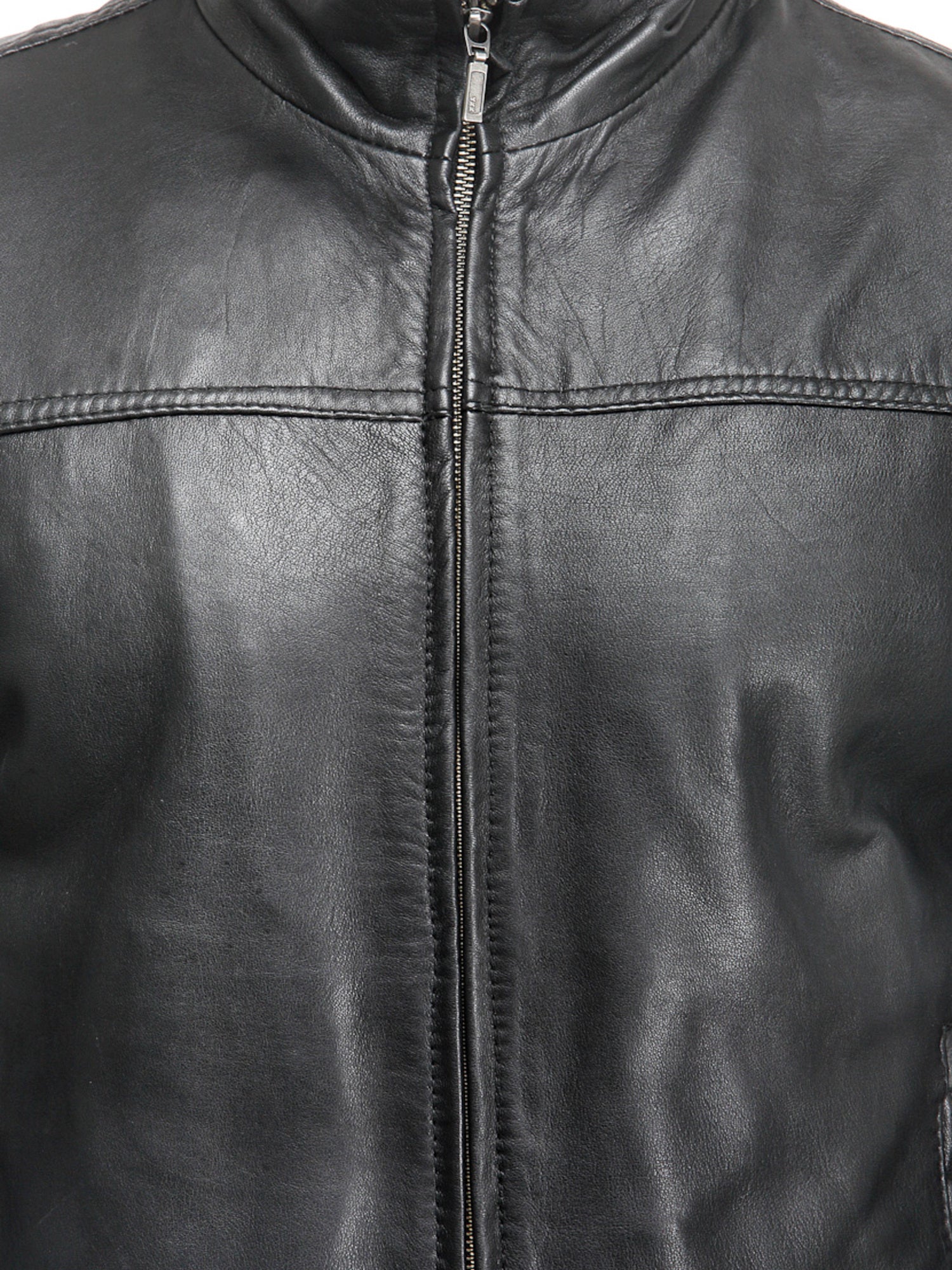 Black leather jacket with stitched detail throughout, has a mock collar, long sleeves with ribbed hems, a full zip closure on the front, a zip pocket on either side side of the waist, a yoke on the front and back, ribbed hem