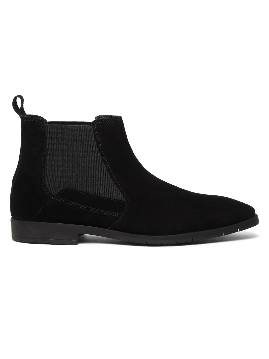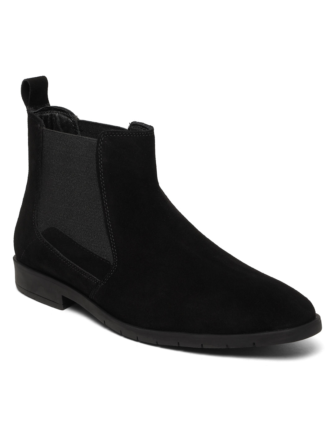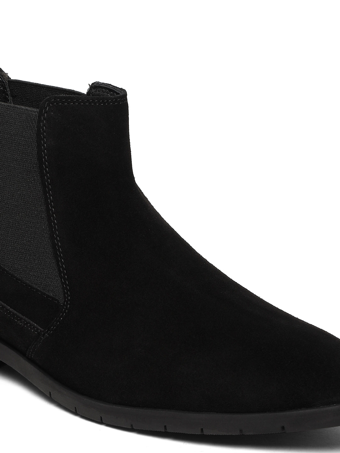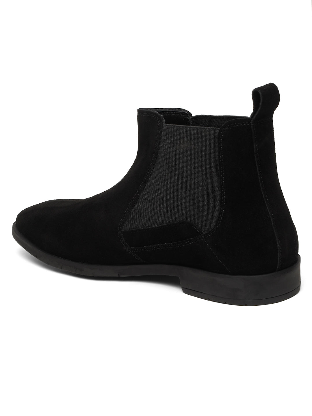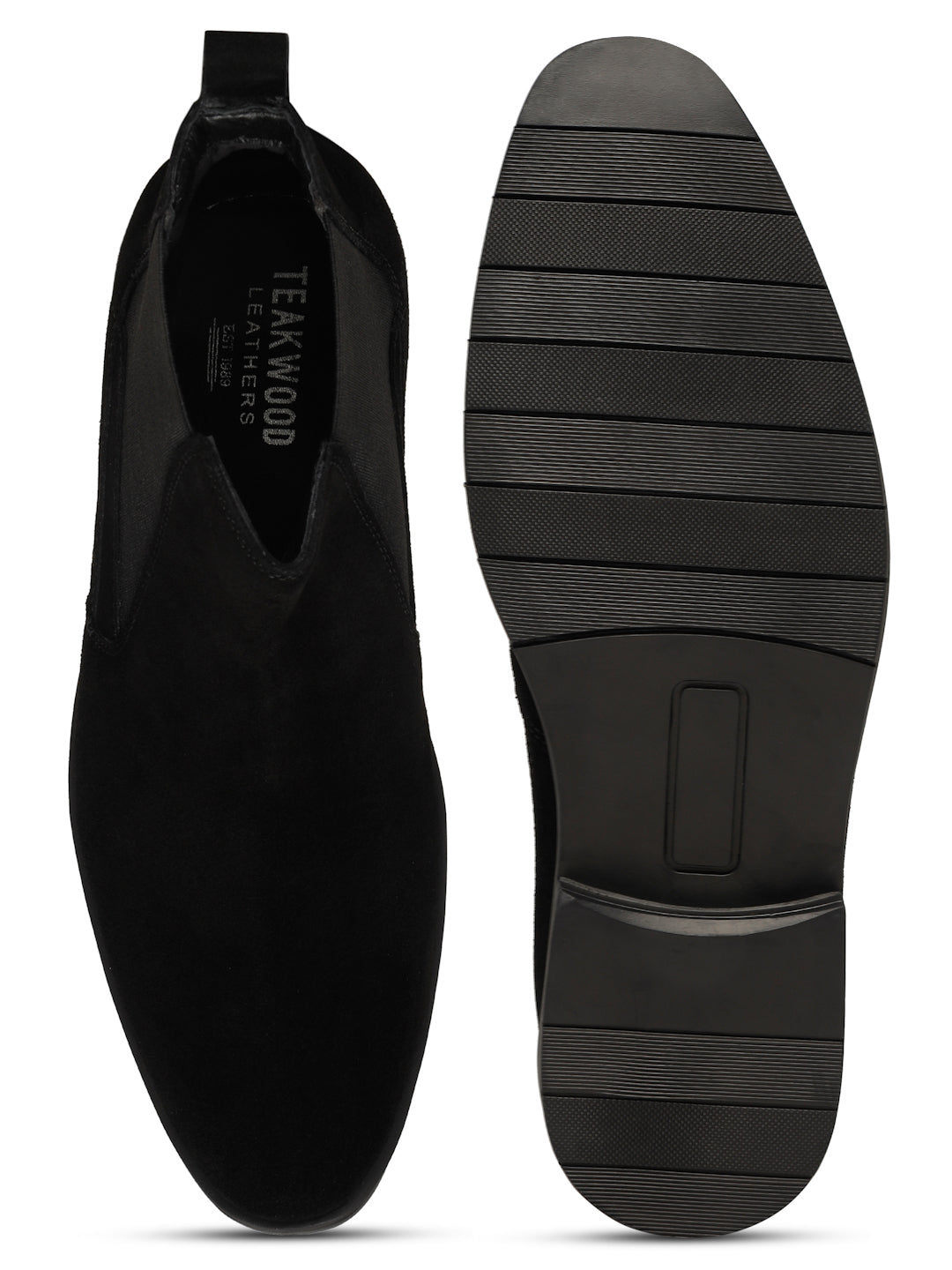This Teakwood Leathers A pair of black Chelsea boots with High-quality suede leather for a soft and elegant finish with round toe, mid-top Chelsea boot style with elastic side panels and a pull tab for easy on and off, leather upper, Soft cushioned insole for all-day comfort, has Textured and patterned TPR outsole, has block-heeled