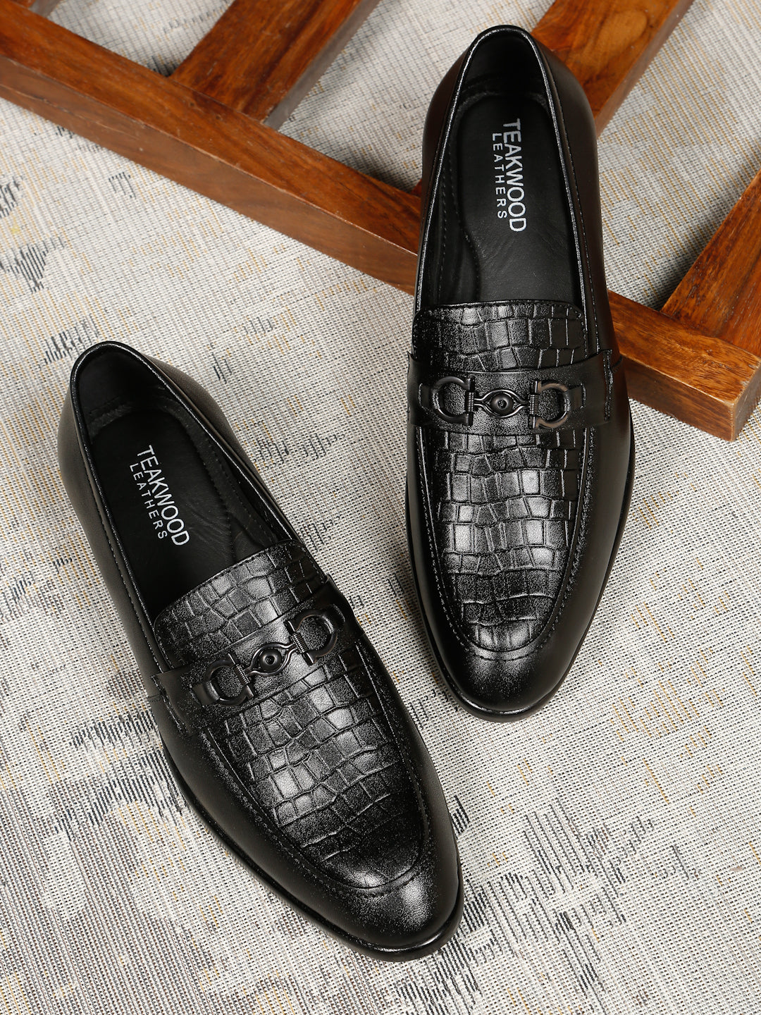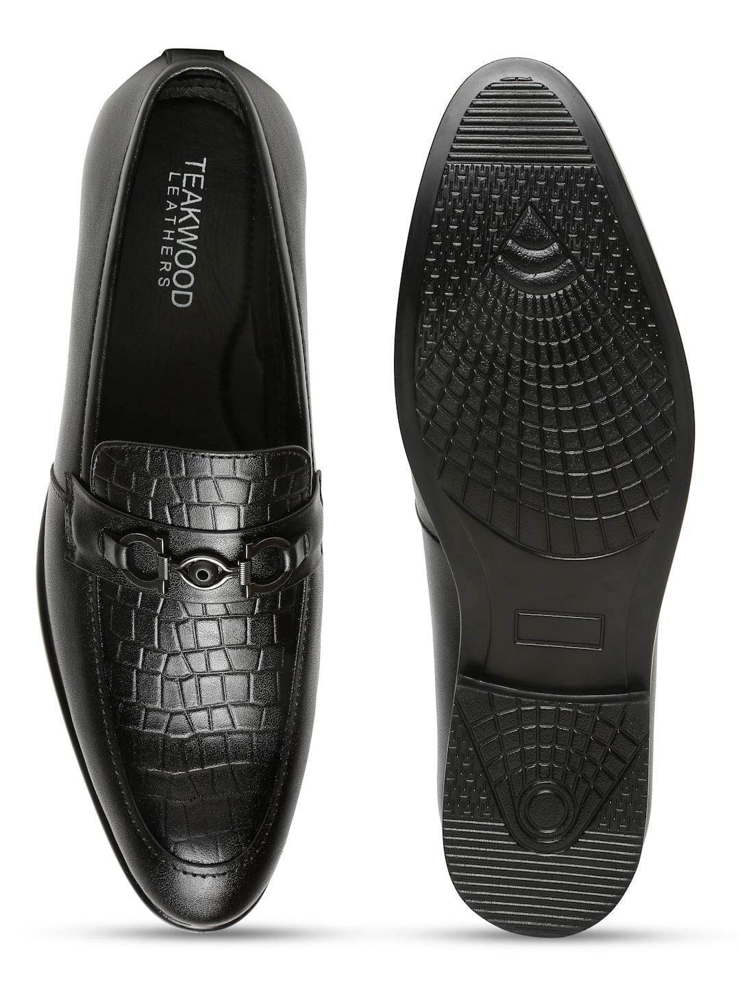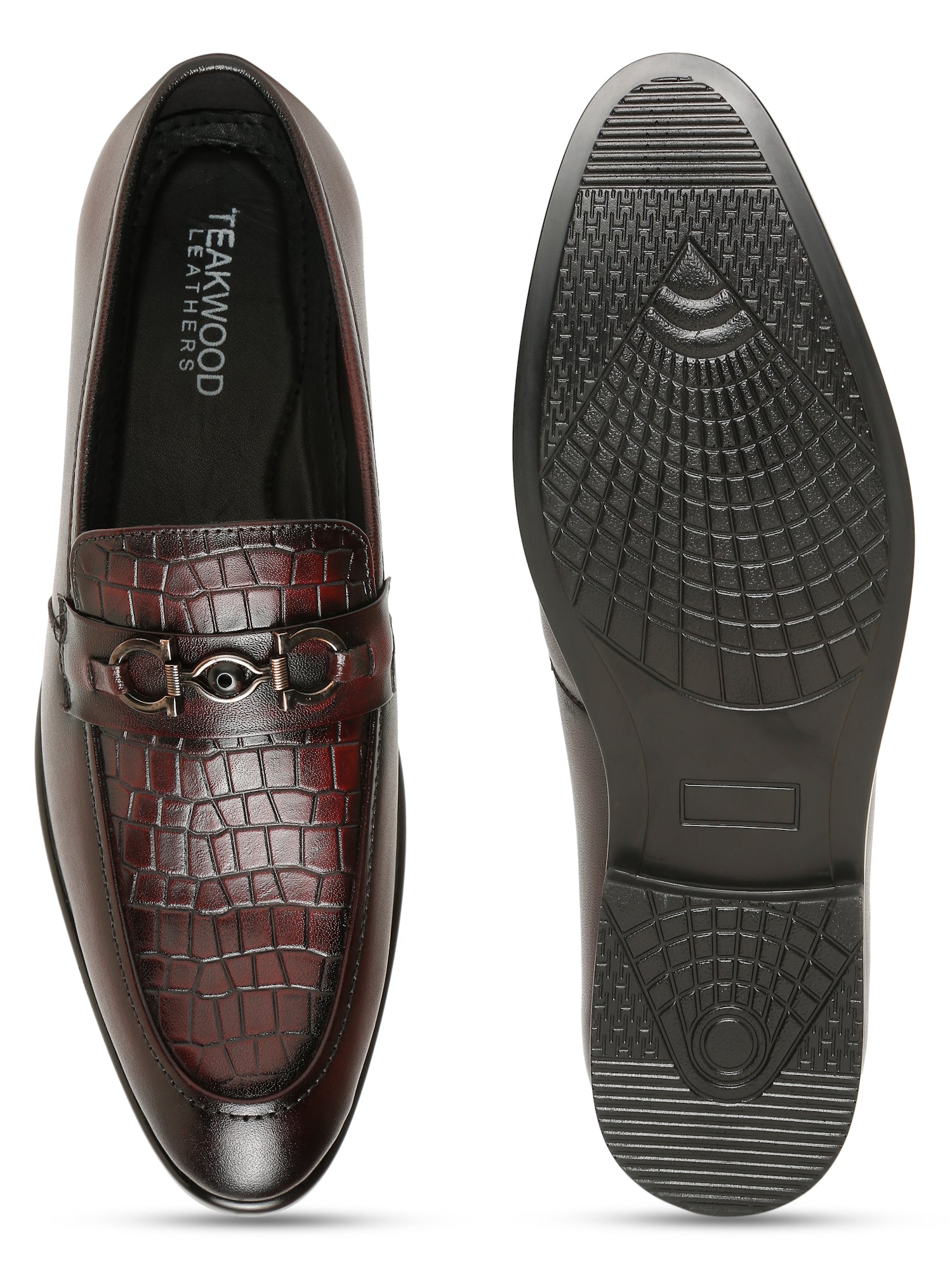 This pair of Teakwood Leather slip-on loafer crafted from softy leather for a supple and premium feel. The croc-textured upper adds a stylish twist, while the bit detail enhances the formal appeal. A lightweight PU sole offers durability and flexibility, making them ideal for long hours of wear. Whether paired with formal trousers or chinos, these slip-on loafers provide a perfect blend of style, comfort, and functionality—suitable for both office meetings and after-hours events.