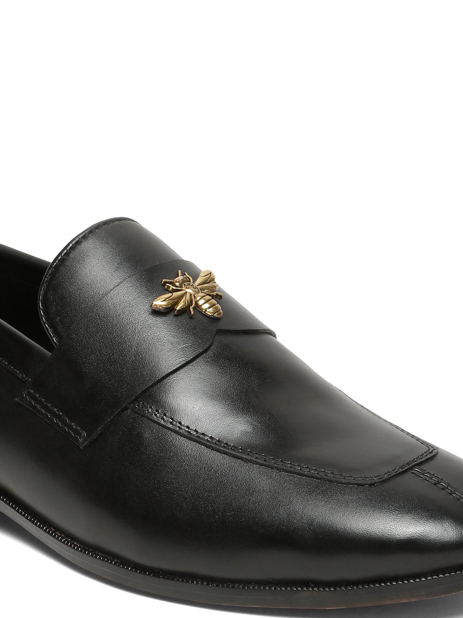 This pair of Teakwood Leather slip-on loafer crafted from genuine leather, featuring a sleek silhouette and a striking metallic bee embellishment on the vamp. Crafted from premium genuine leather, these loafers are designed to turn heads at formal events, parties, or stylish evenings out. Designed for those who appreciate detail, the handmade sole offers a luxurious finish with strong durability, while the EVA insole delivers lightweight cushioning and all-day comfort.