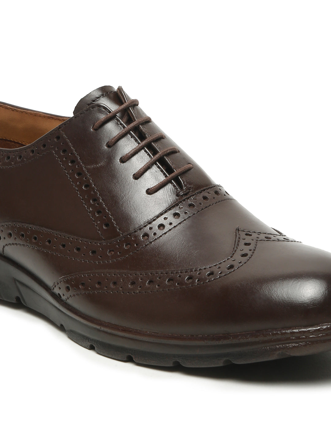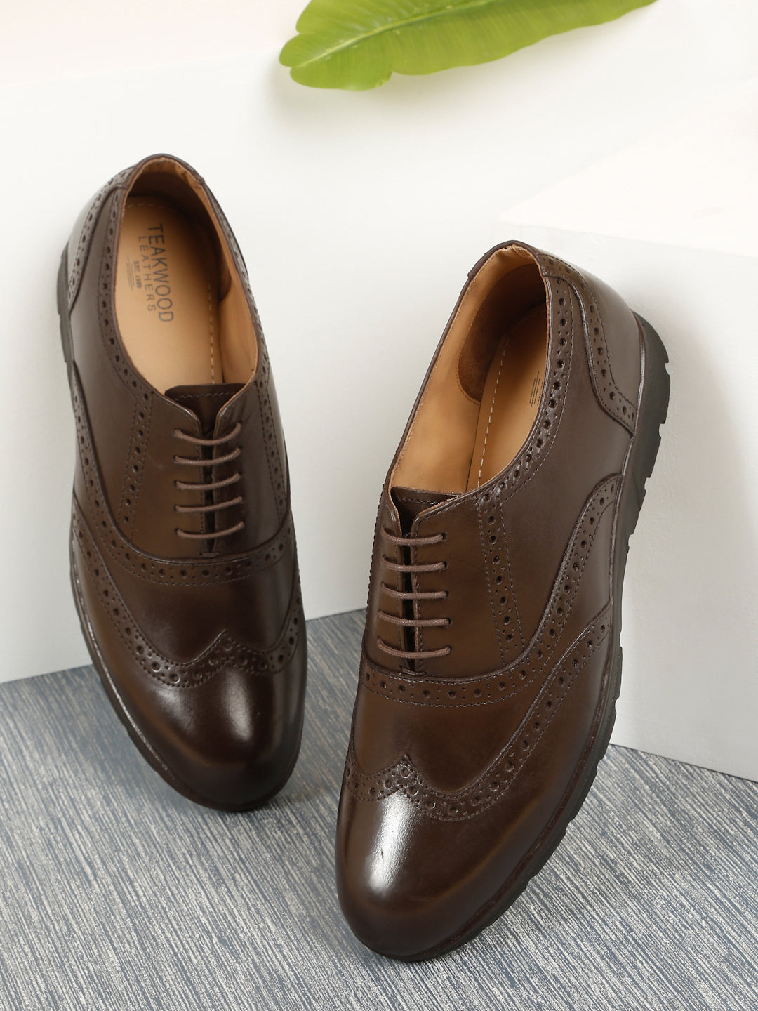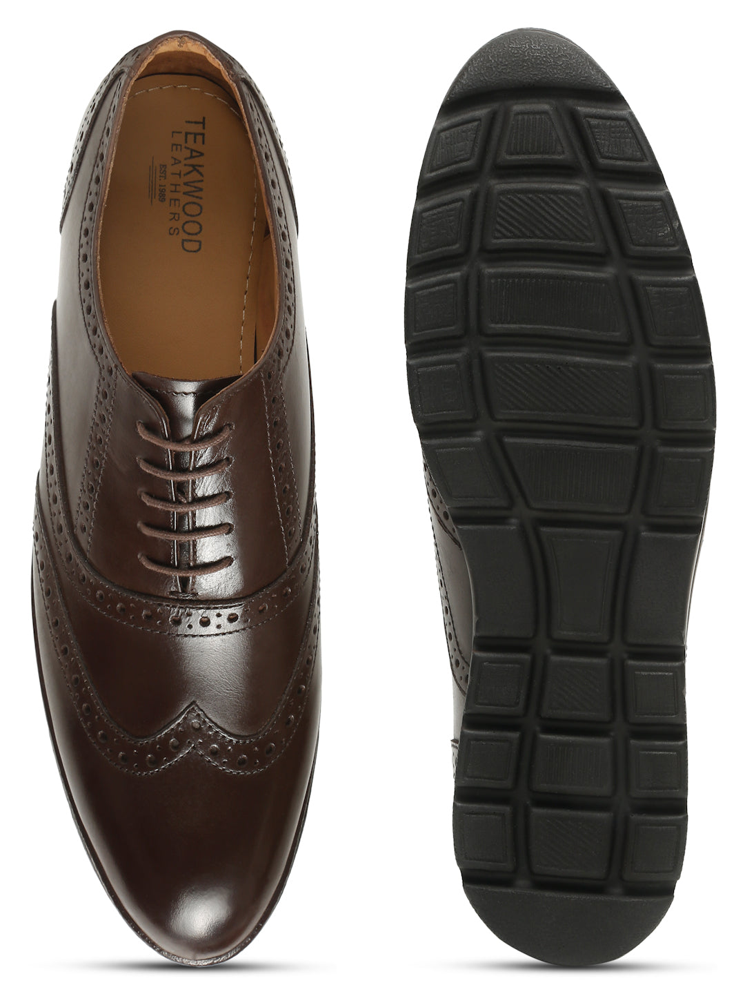 Introducing A pair of Teakwood Men Genuine leather upper with intricate brogue detailing for a classic, polished look. These shoes feature a polished brown finish and classic brogue detailing, adding sophistication to your formal wardrobe. Durable PU sole for exceptional grip and flexibility. Lace-up closure with wingtip accents for a timeless aesthetic. Suitable for professional, business, and formal events.