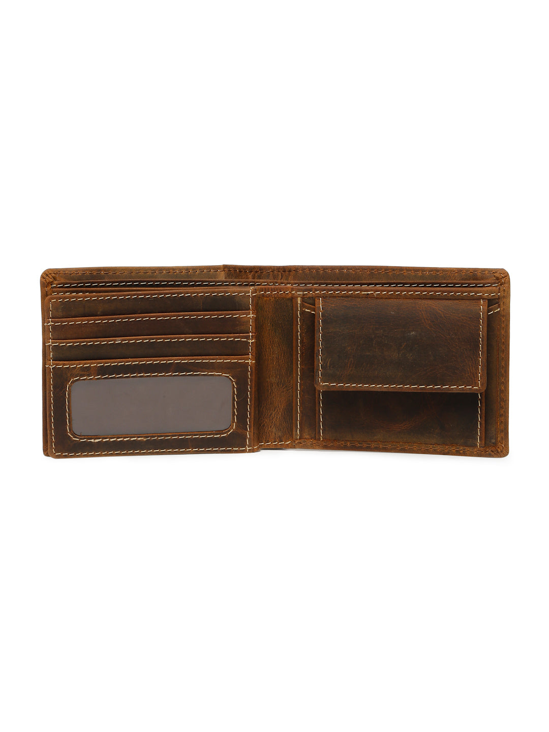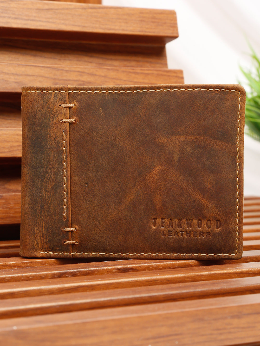 This Teakwood Leather men's wallet made from fine-quality leather in a brown shade, It has 2 main cash compartments, 1 coin pocket with snap button closure, 6 card slots, 1 ID flap with transparent window. A sophisticated pick for the modern man who values durability, smart design, and understated style.