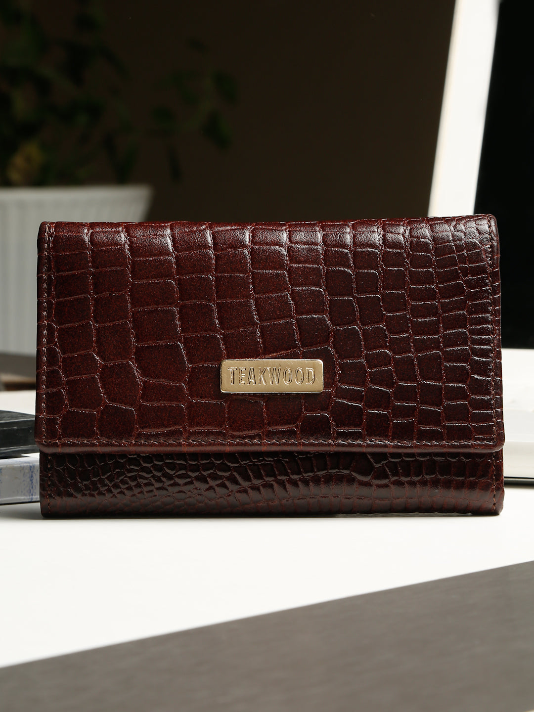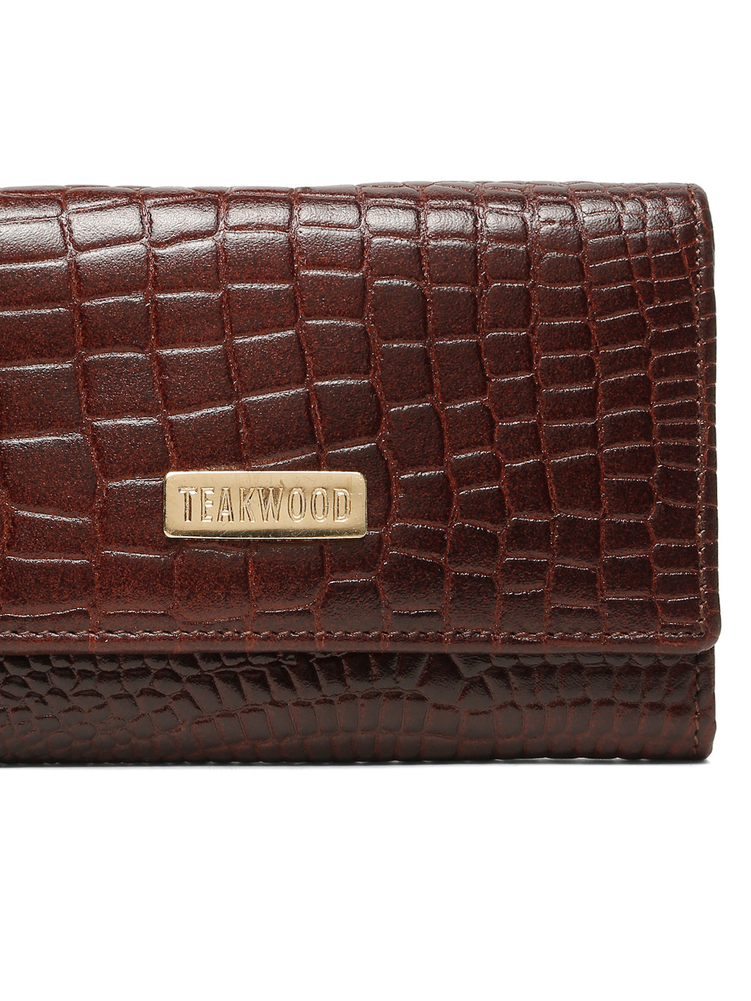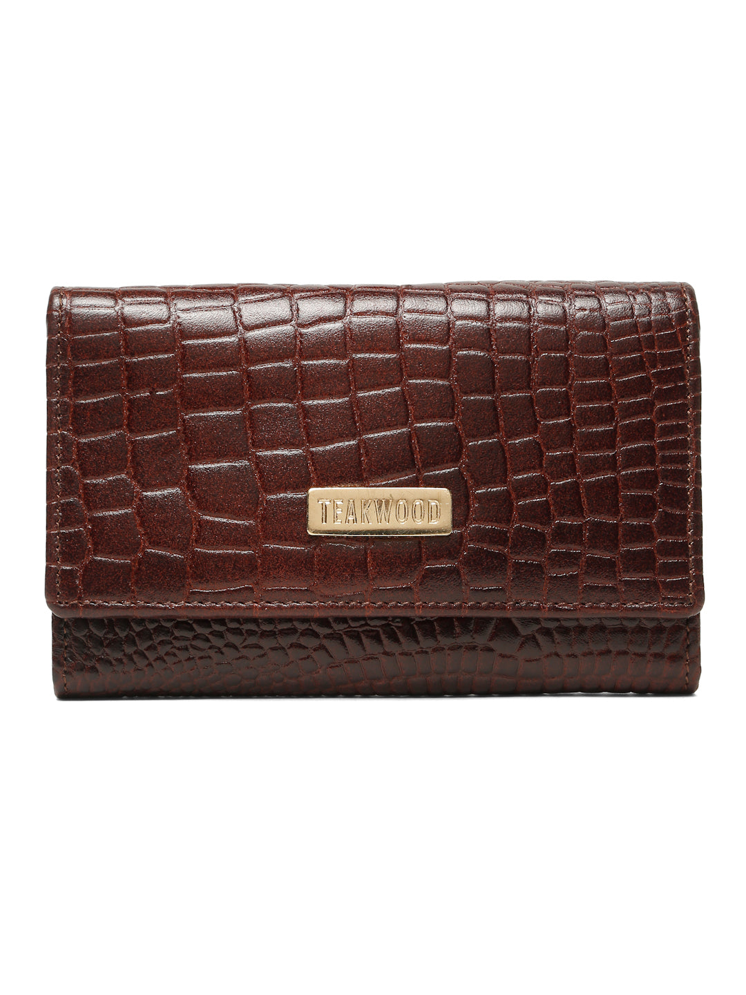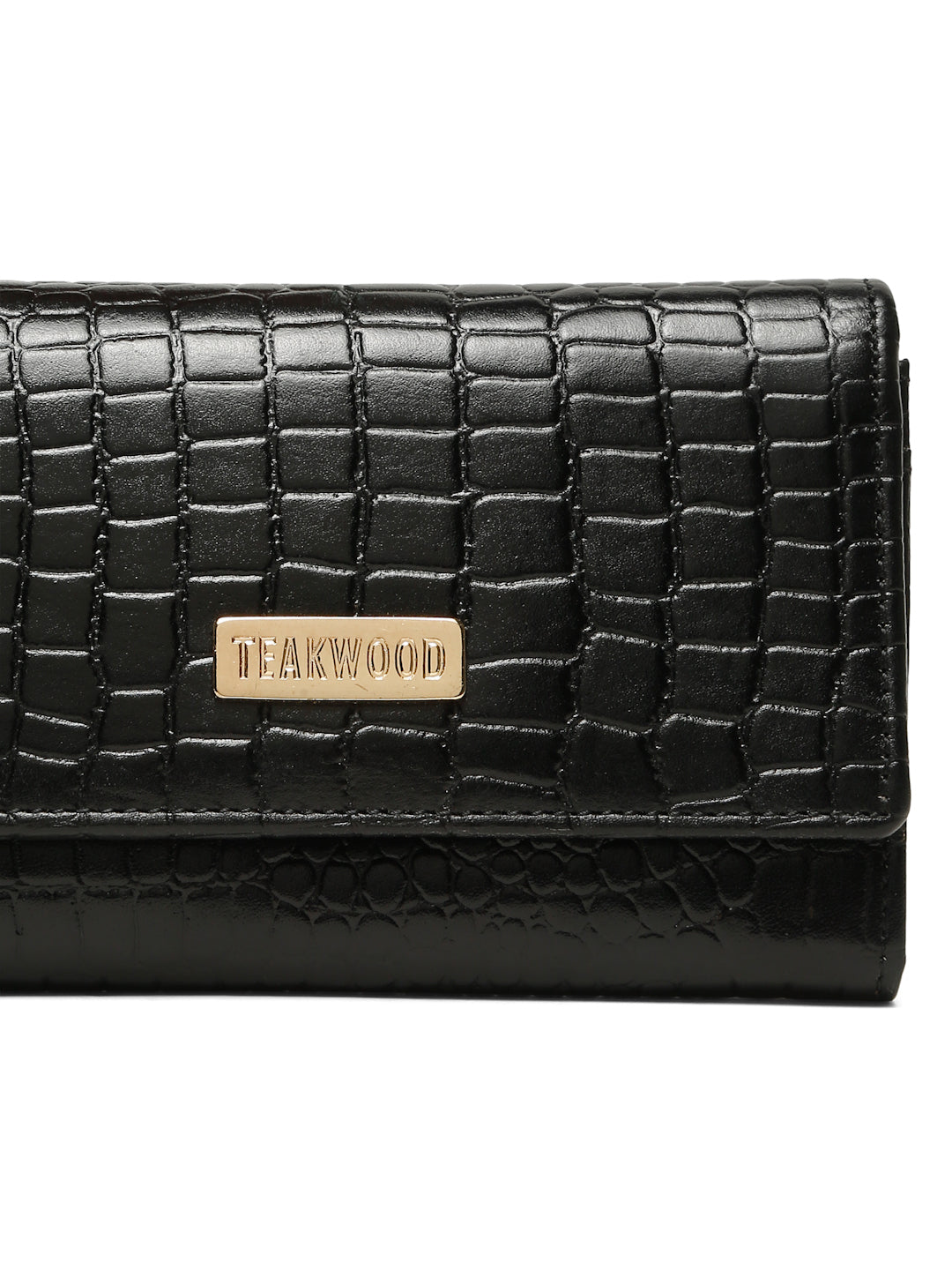 This is a premium black croc-textured wallet from Teakwood, featuring a sleek and elegant design. The gold brand plate enhances its luxurious aesthetic, making it suitable for both casual and formal settings. With its stylish exterior and practical structure, it is ideal for someone who wants a classy accessory that combines fashion and functionality.