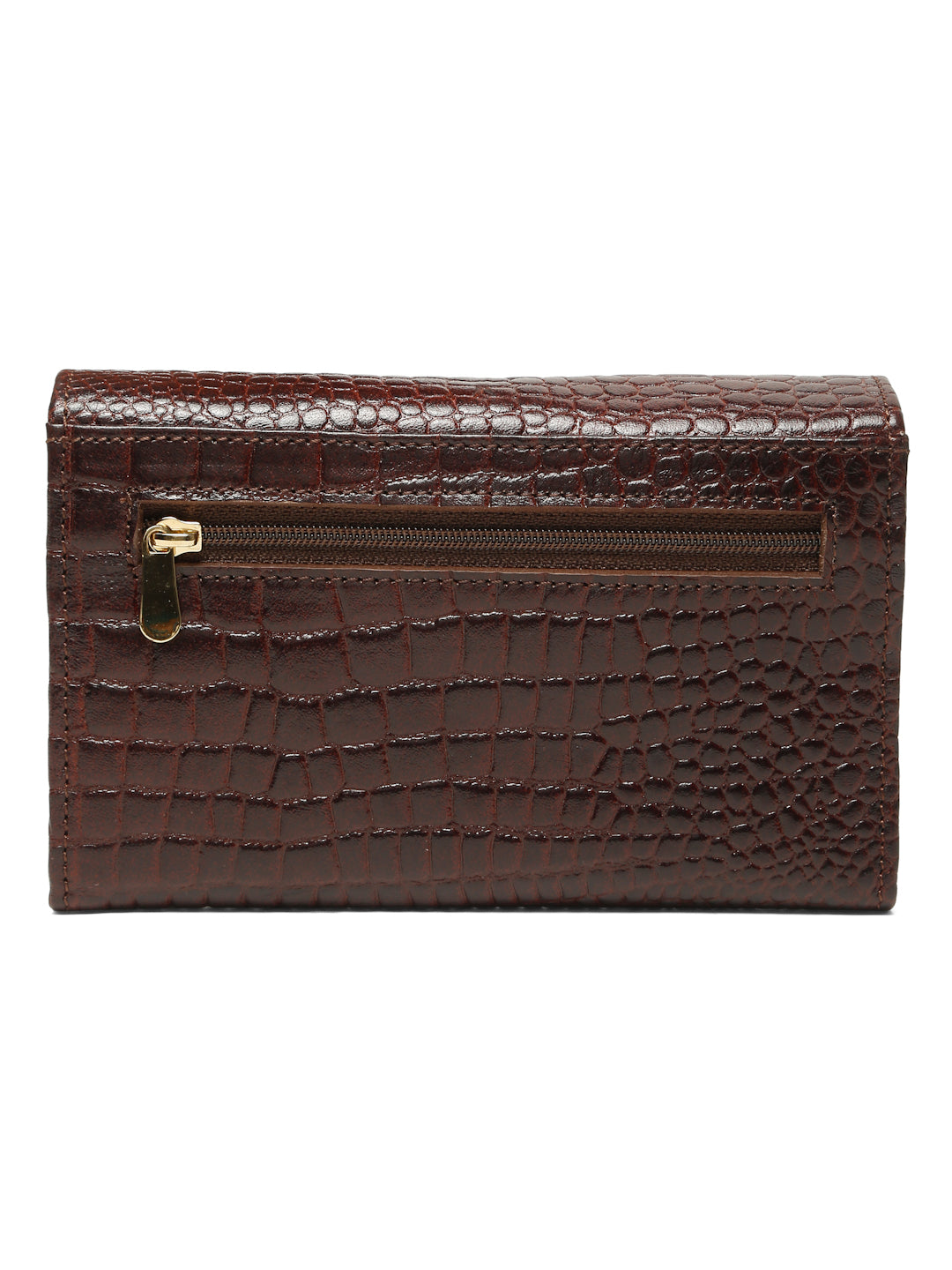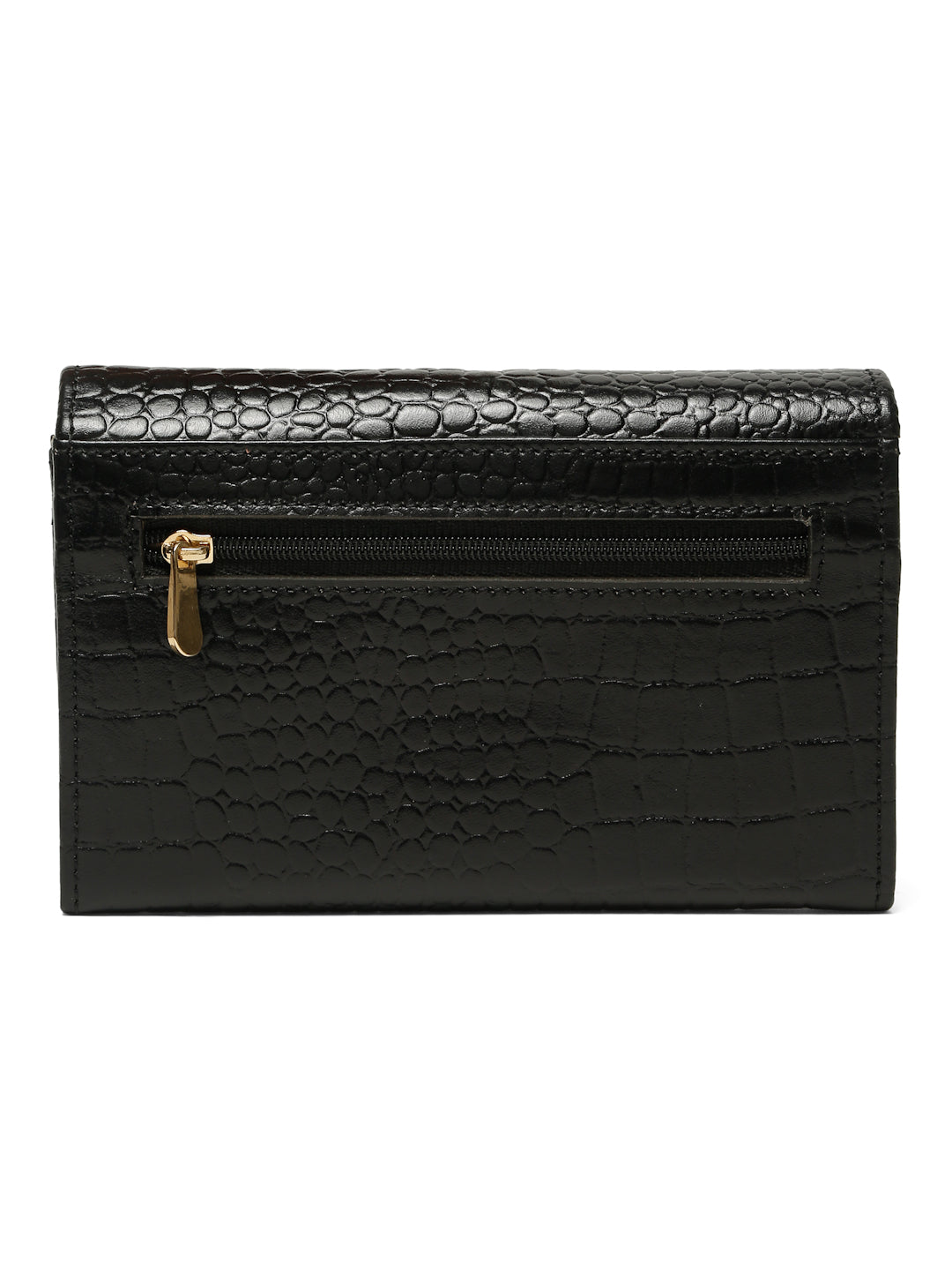 The wallet appears to be made of black genuine leather with an embossed croco texture. Shiny, textured reptile-pattern finish giving it a premium look. Rectangular, clutch-style wallet suitable for daily or formal use. Spacious enough to hold currency notes, cards, coins, and small essentials. Ideal for women looking for a stylish yet practical accessory.