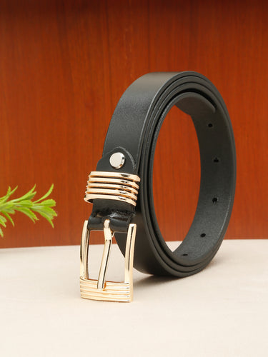 Women Black Leather Belt With Asymmetrical Gold Buckle