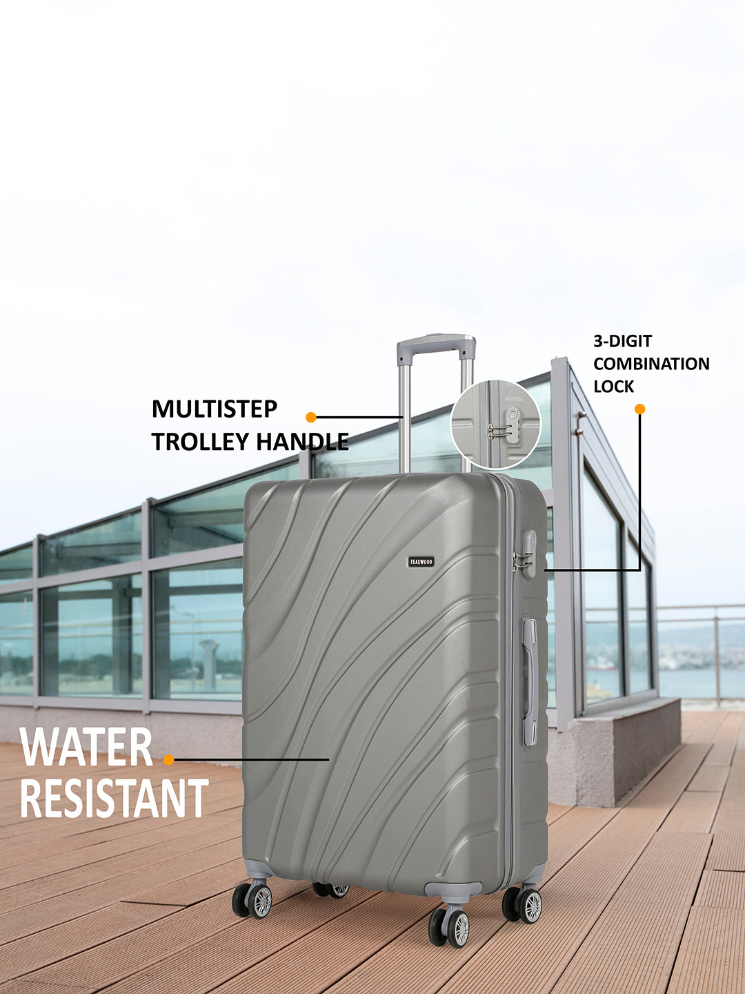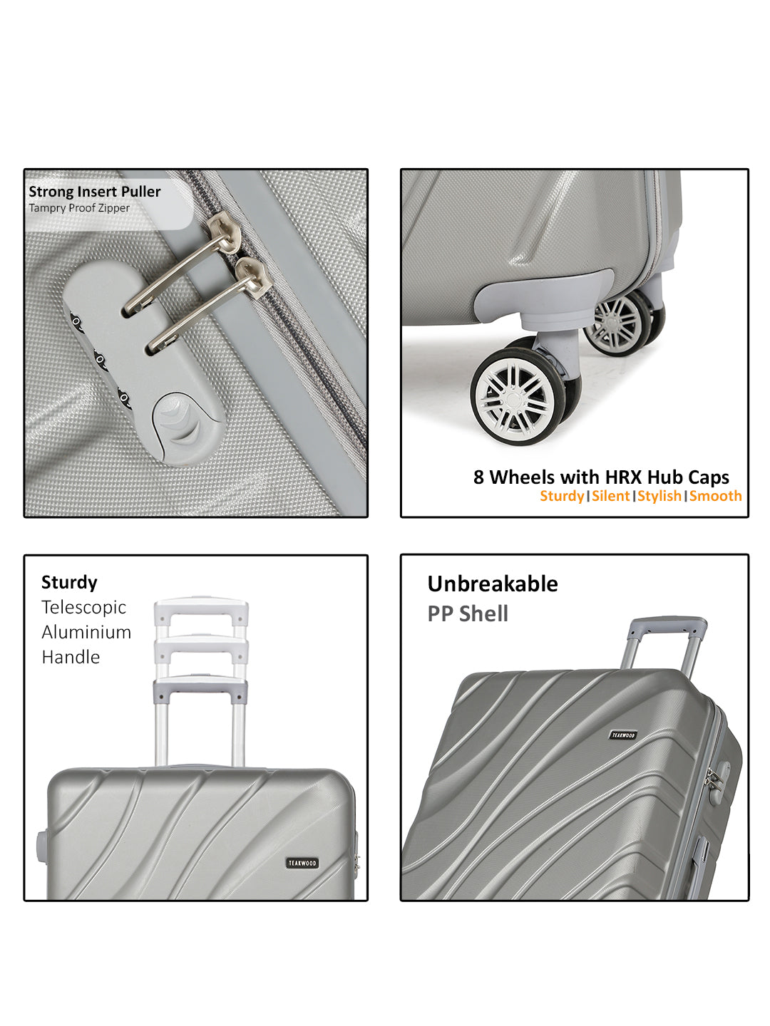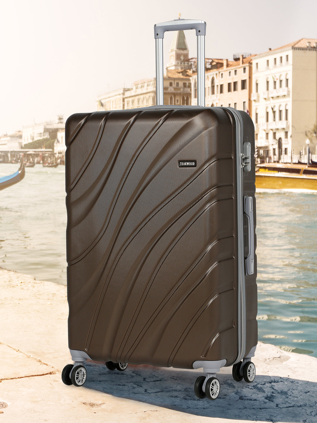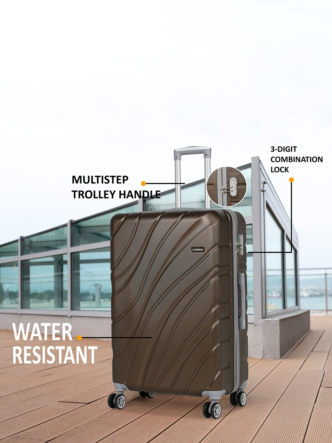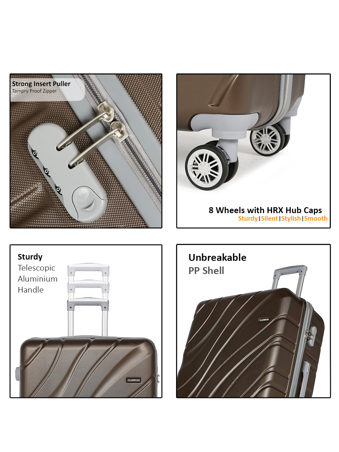 PRODUCT DETAILS: This Teakwood textured hard-sided cabin-sized trolley bag secured with a number lock One handle on the top and a retractable handle on the top Eight 360-degree rotatable corner-mounted skate wheels One main zip compartment Zip lining with two compression straps Has a sub-compartment, secured with a zip closure Warranty: 2 Years Warranty provided by brand/manufacturer