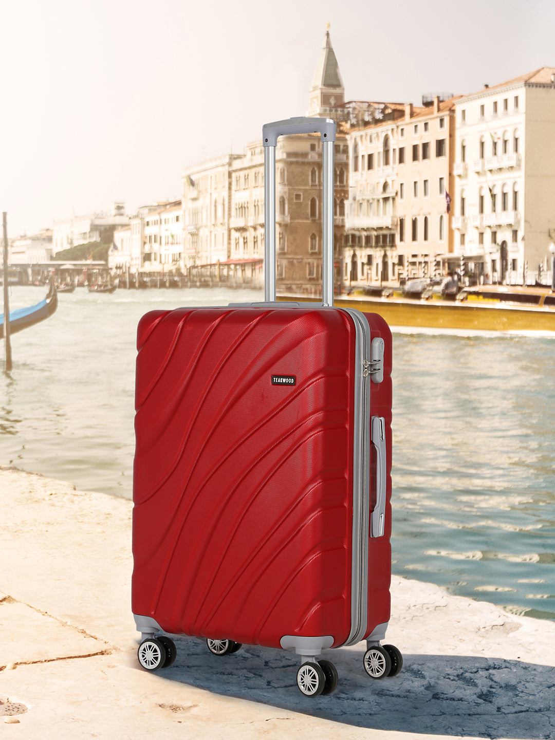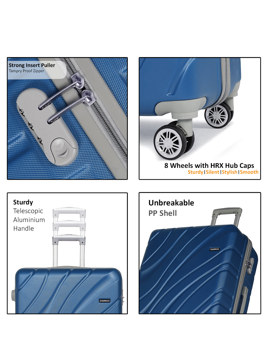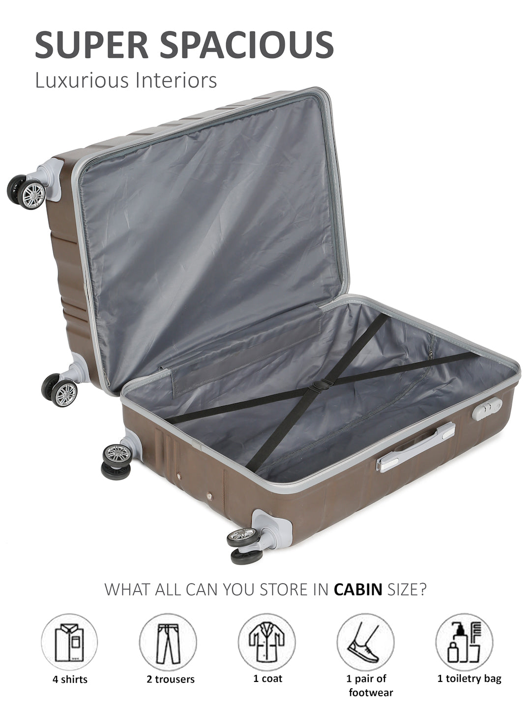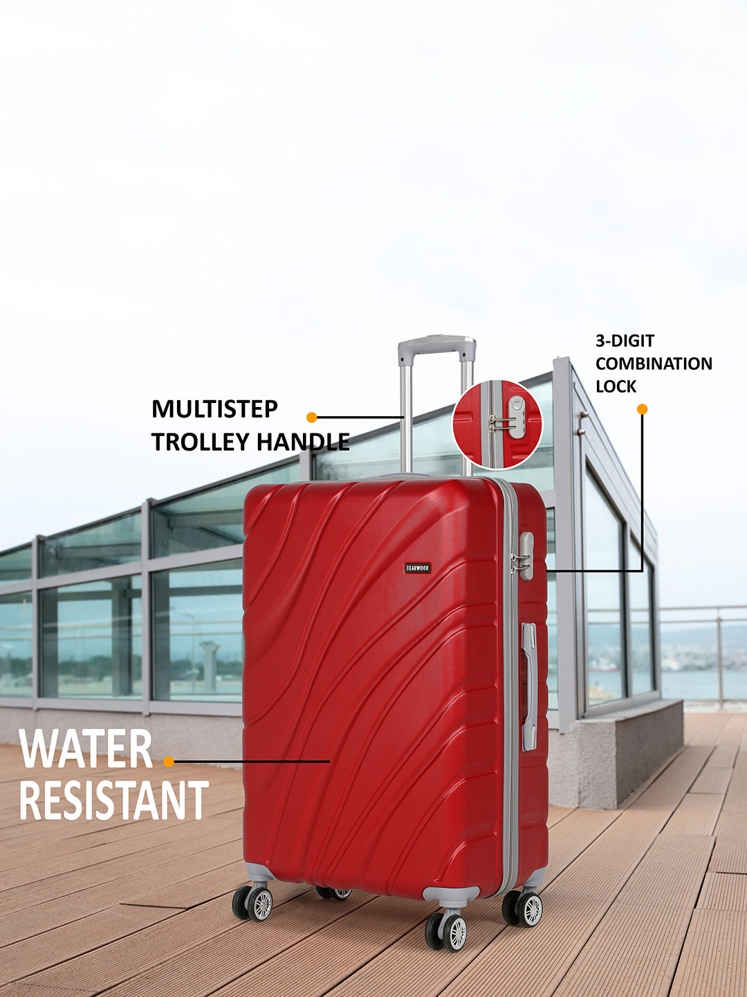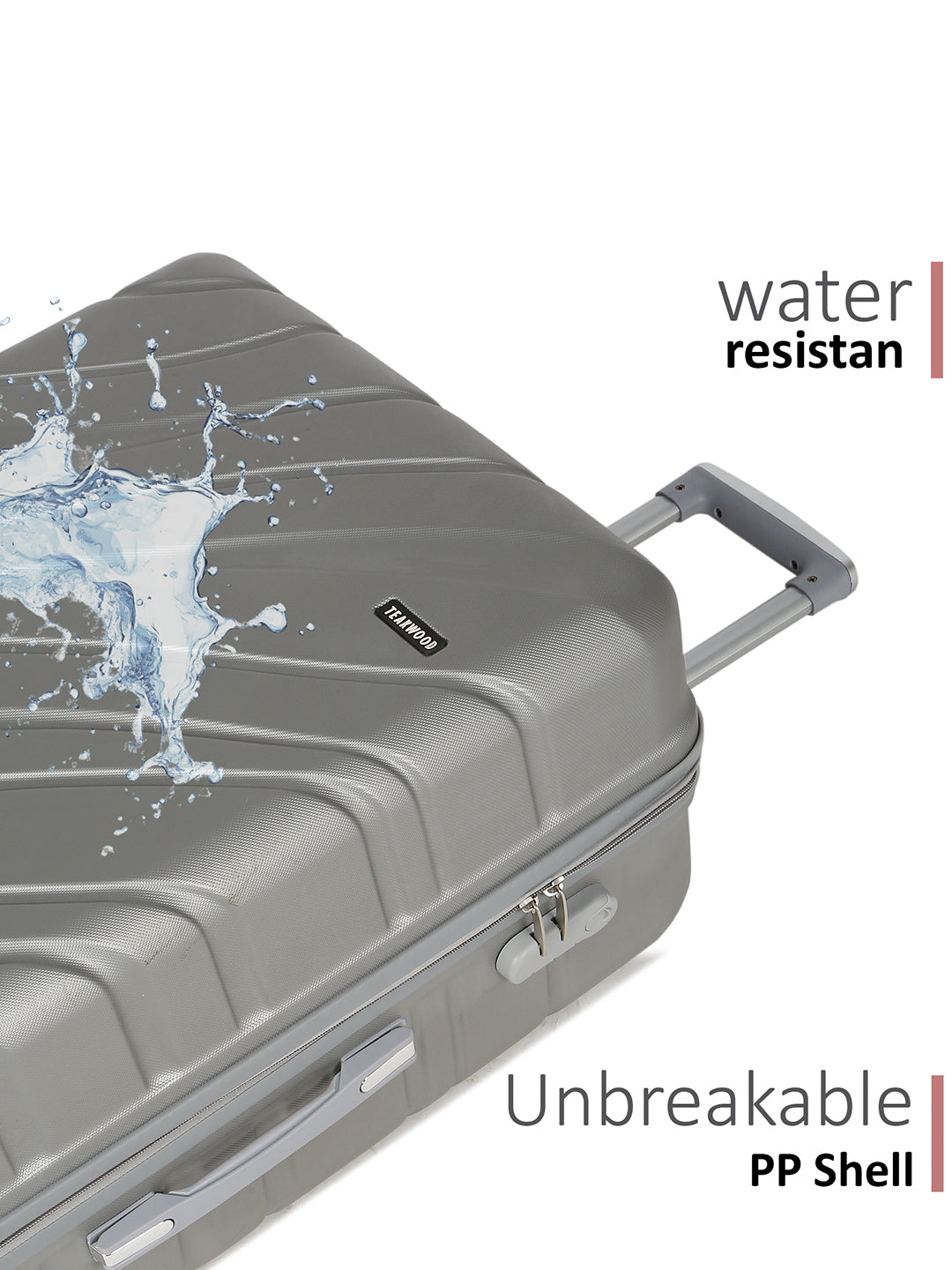 PRODUCT DETAILS: This Teakwood textured hard-sided cabin-sized trolley bag secured with a number lock One handle on the top and a retractable handle on the top Eight 360-degree rotatable corner-mounted skate wheels One main zip compartment Zip lining with two compression straps Has a sub-compartment, secured with a zip closure Warranty: 2 Years Warranty provided by brand/manufacturer