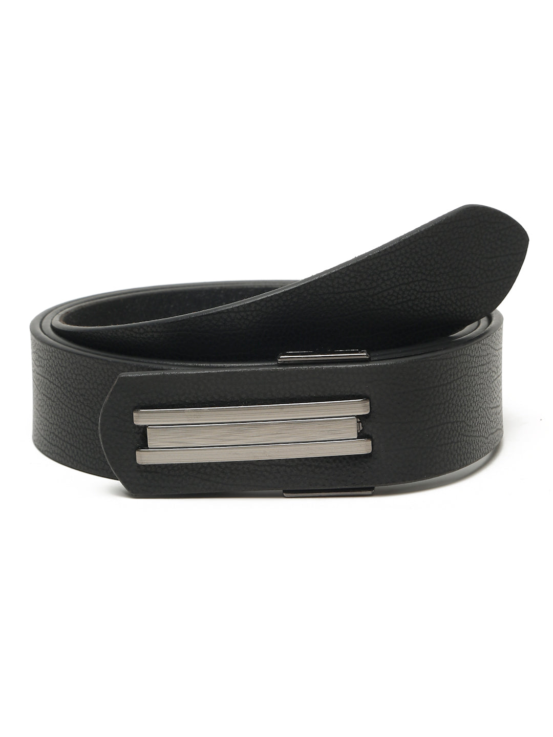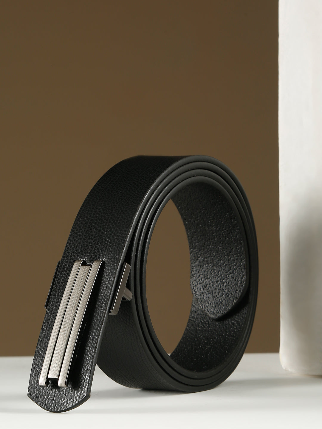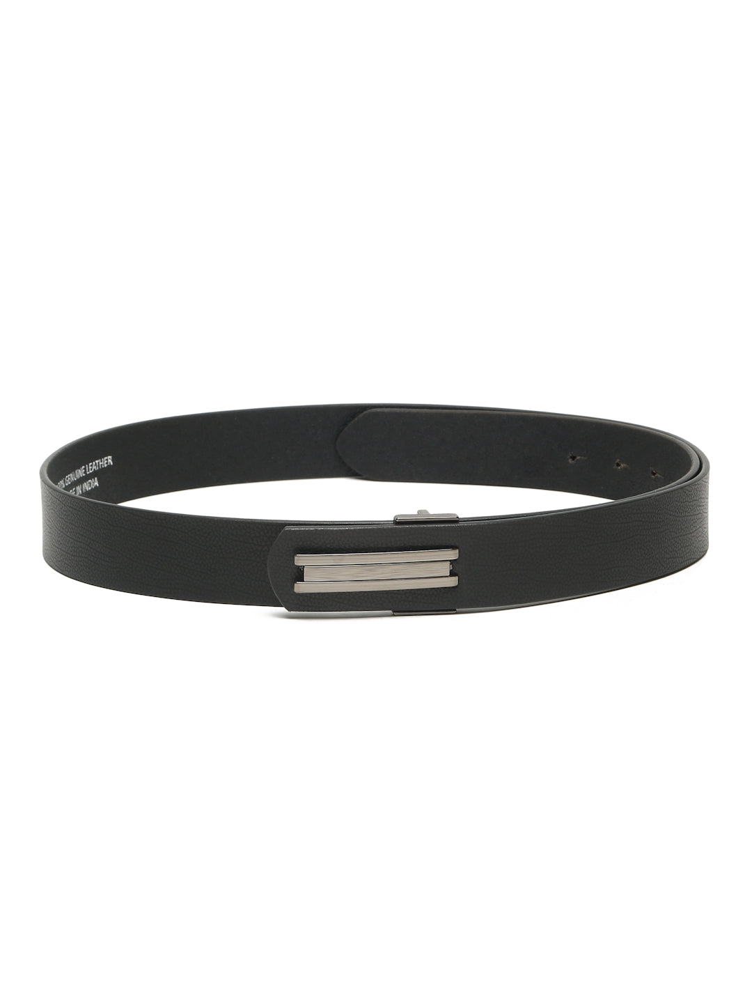 This Teakwood Leather Belt Crafted from black Genuin leathe This texture is highly durable, resistant to scratching, and provides a sophisticated matte-like finish compared to smooth leather.A contemporary triple-bar clip buckle in a brushed silver finish. This design is "pin-less," typically utilizing a clamping or friction-based mechanism which offers a sleeker, hardware-focused look.