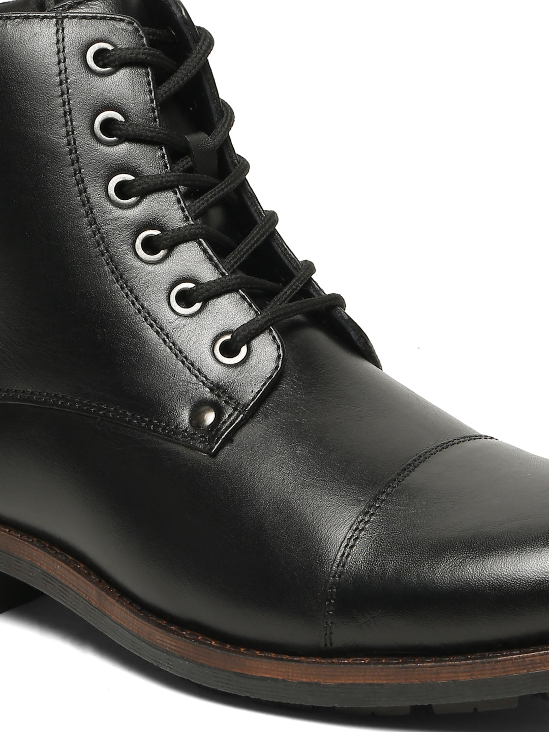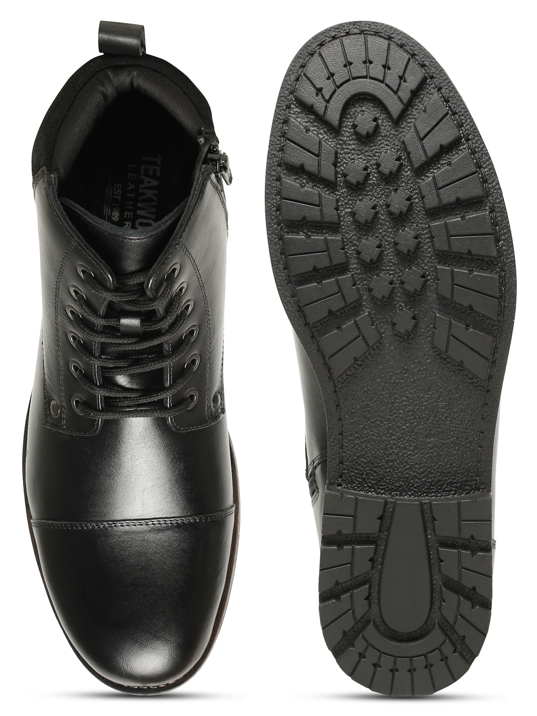 These Teakwood black U shape-toe boots blend sophistication with rugged charm. Crafted with smooth Genuine leather, they offer a polished and premium appearance. The lace-up system provides a snug fit, while the side zipper makes wearing them effortless. A padded collar enhances comfort, and the durable rubber sole ensures stability and long-term wear. With their stylish U shape-toe detailing and modern silhouette, these boots are perfect for men seeking a classy yet versatile footwear option.
