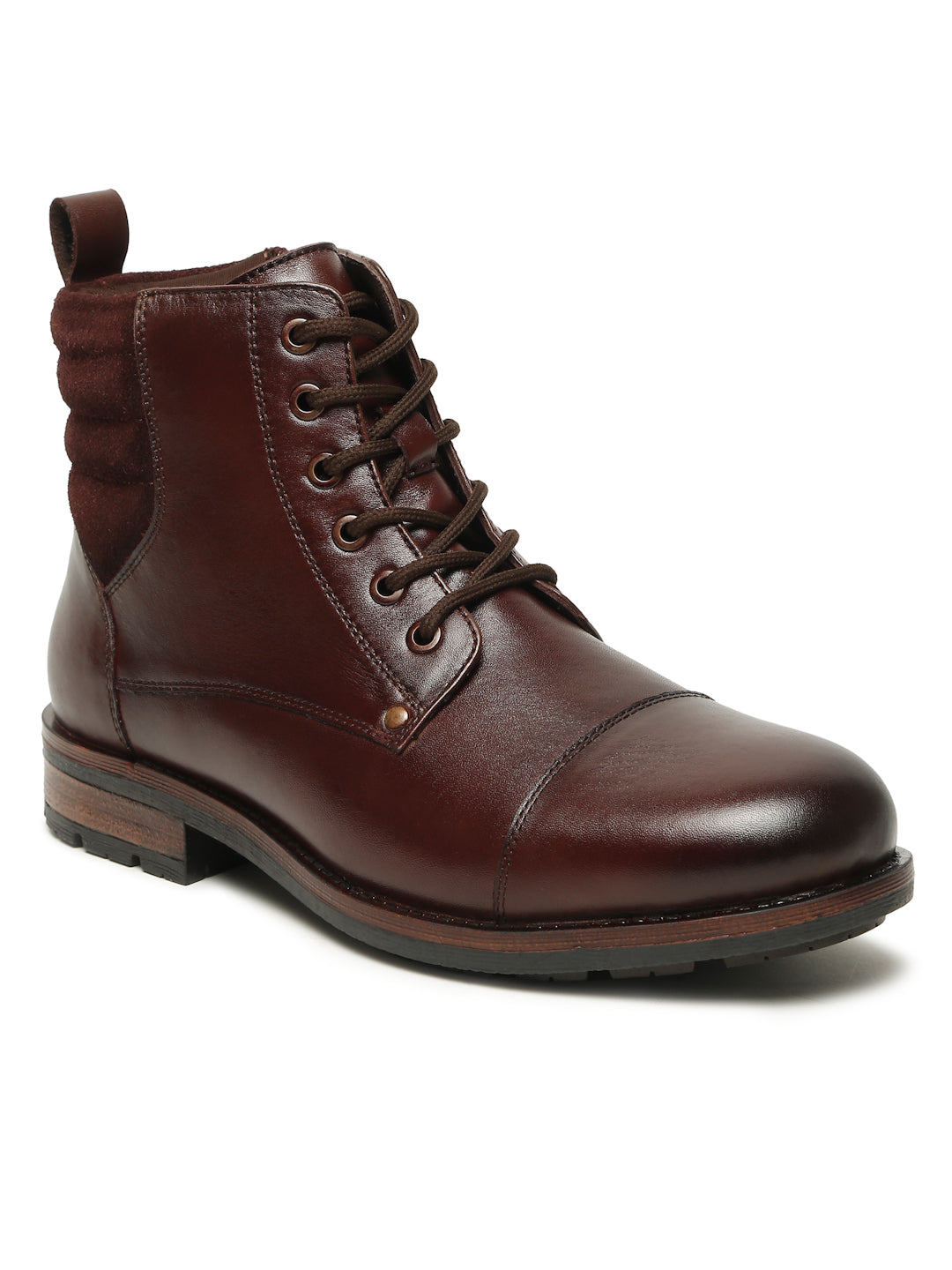 Premium smooth Genuine leather with a polished finish , and use Padded collar Provides ankle support and cushioning. Lace-up closure with metal eyelets, Side zipper in boot for easy wearing and Reinforced stitching for durability in daily or rough use.,Contrast white stitching adds a rugged, stylish touch,Durable anti-slip rubber sole,Slightly elevated heel for better grip and posture,Smooth leather finish paired with suede-like panels gives a bold, premium, Suitable for office wear, party wear, casual outings, and bike rides.