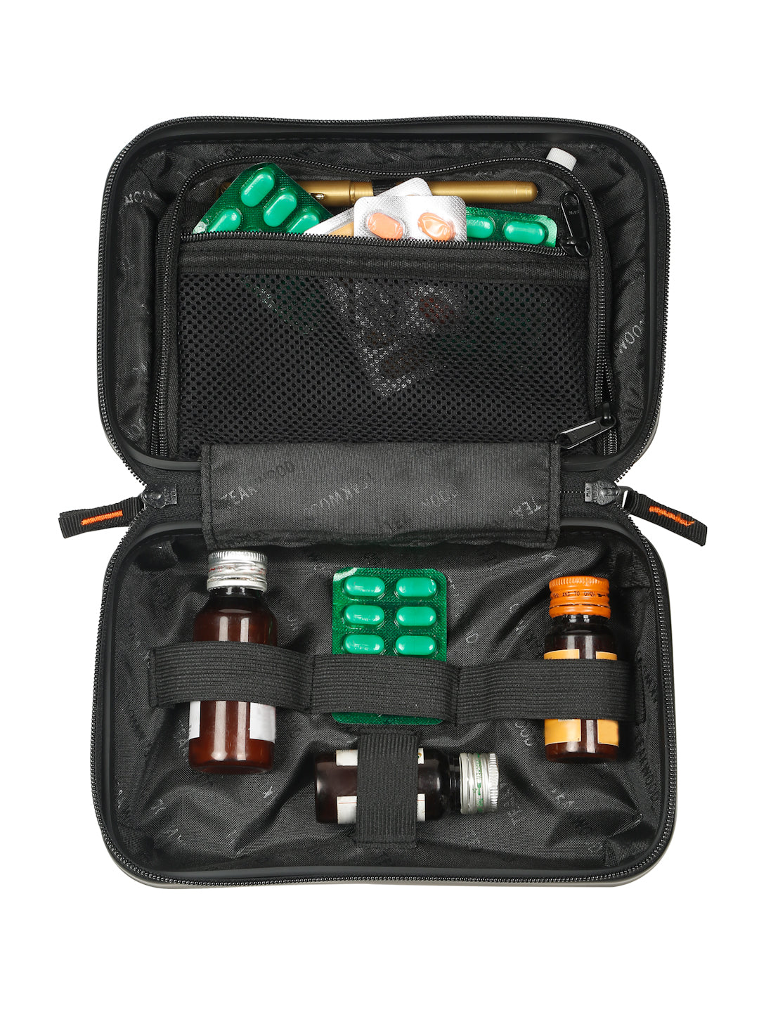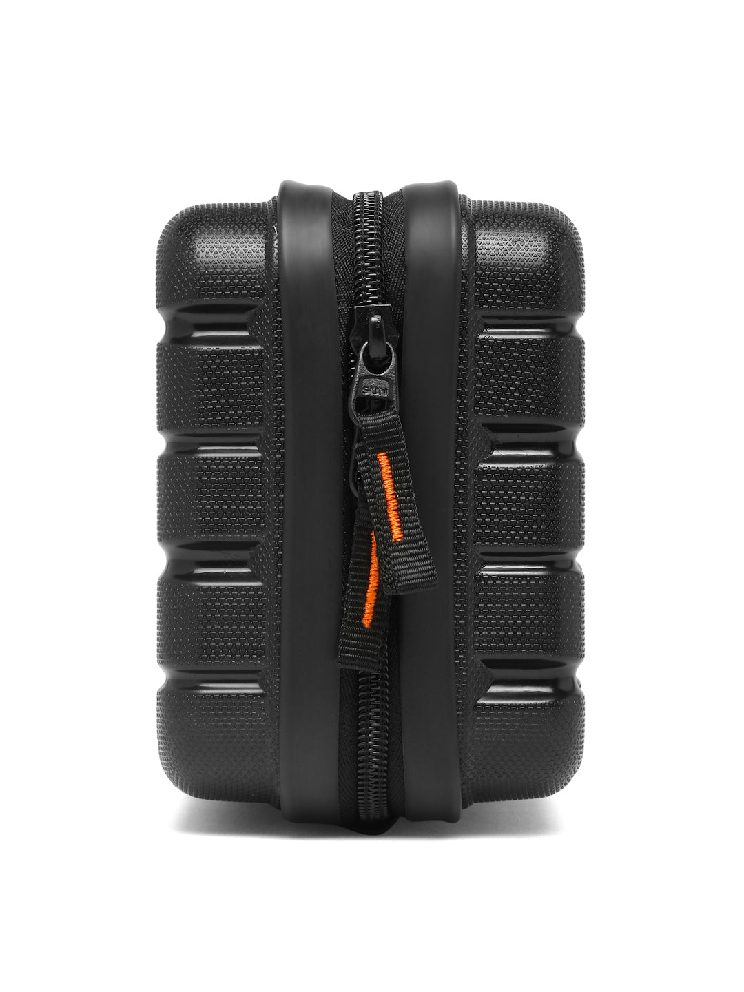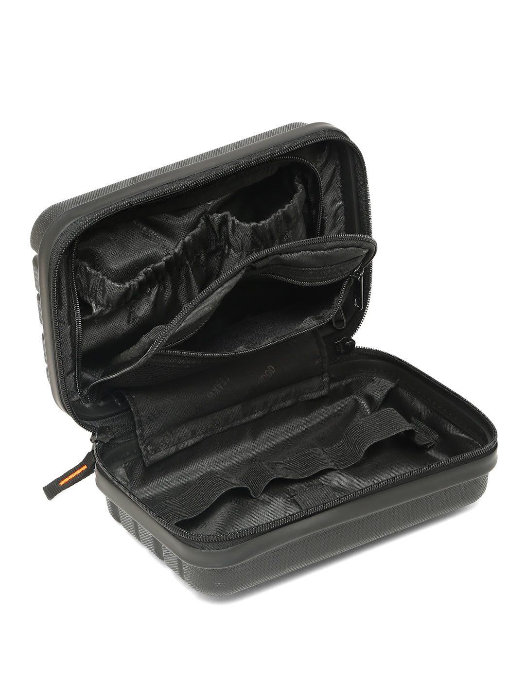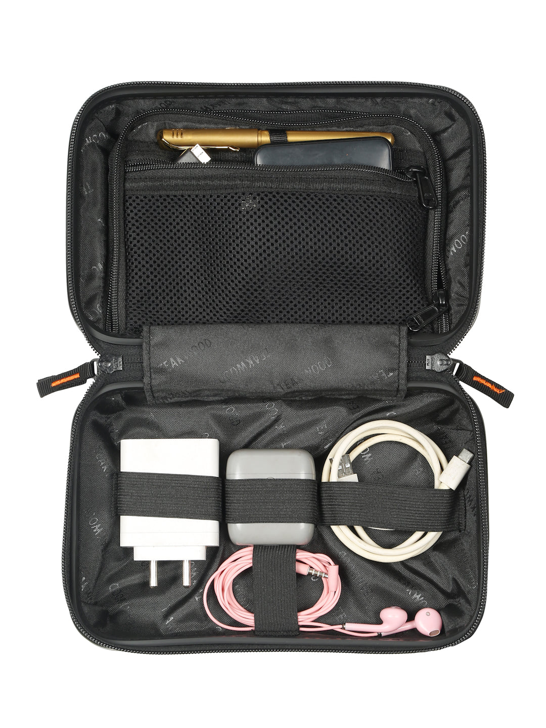 A small, rectangular hard-shell organizer case designed for travel and daily use. The case has ribbed exterior with a smooth, durable finish and a zipper closure. A black interior with multiple compartments. The top section includes a zippered mesh pocket holding small items such as a pen and a slim electronic device. The bottom section has elastic straps that securely hold a wall charger, a charging case, a USB cable, and wired earphones. The layout keeps all items separated and neatly arranged.