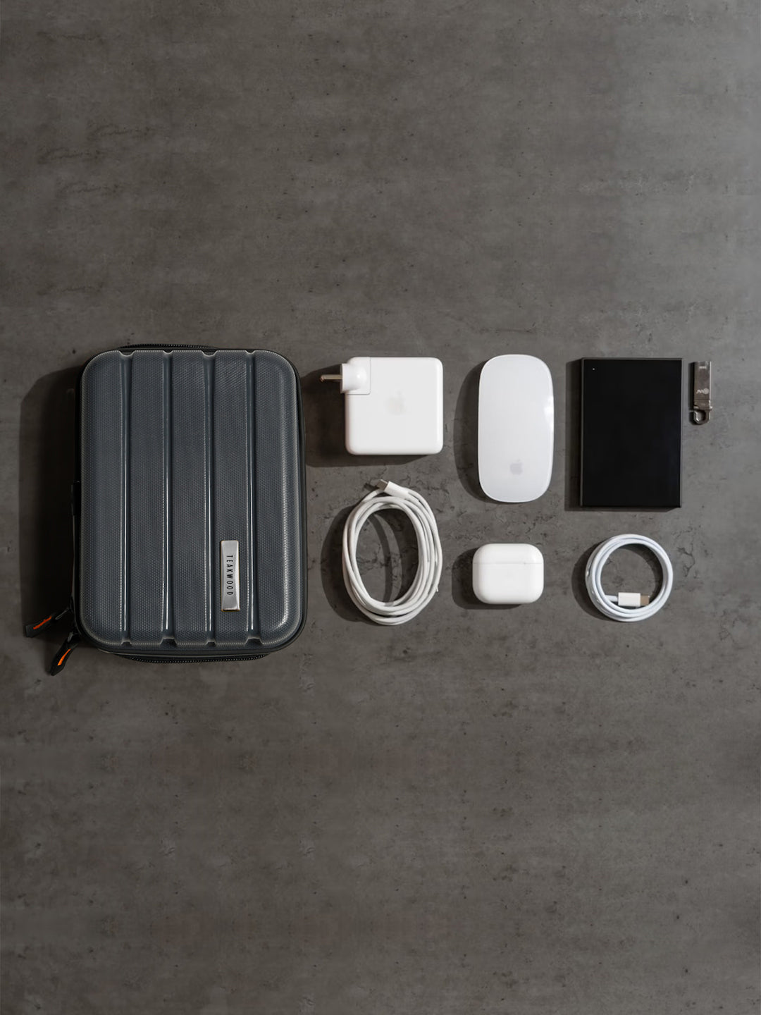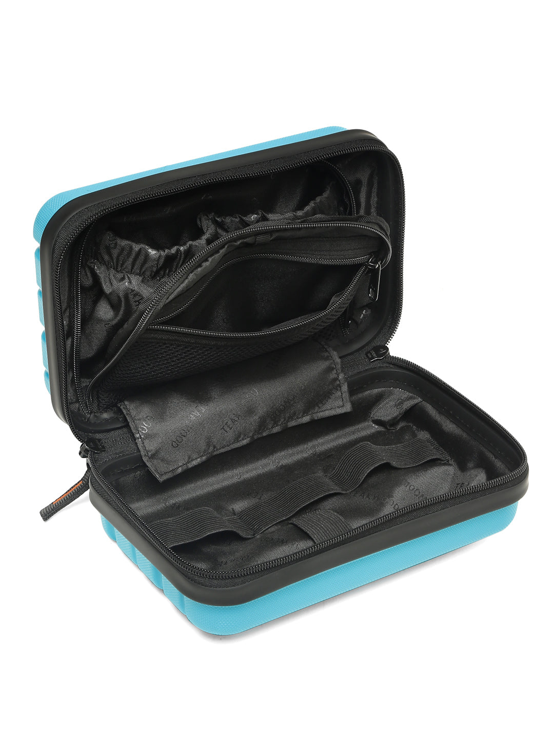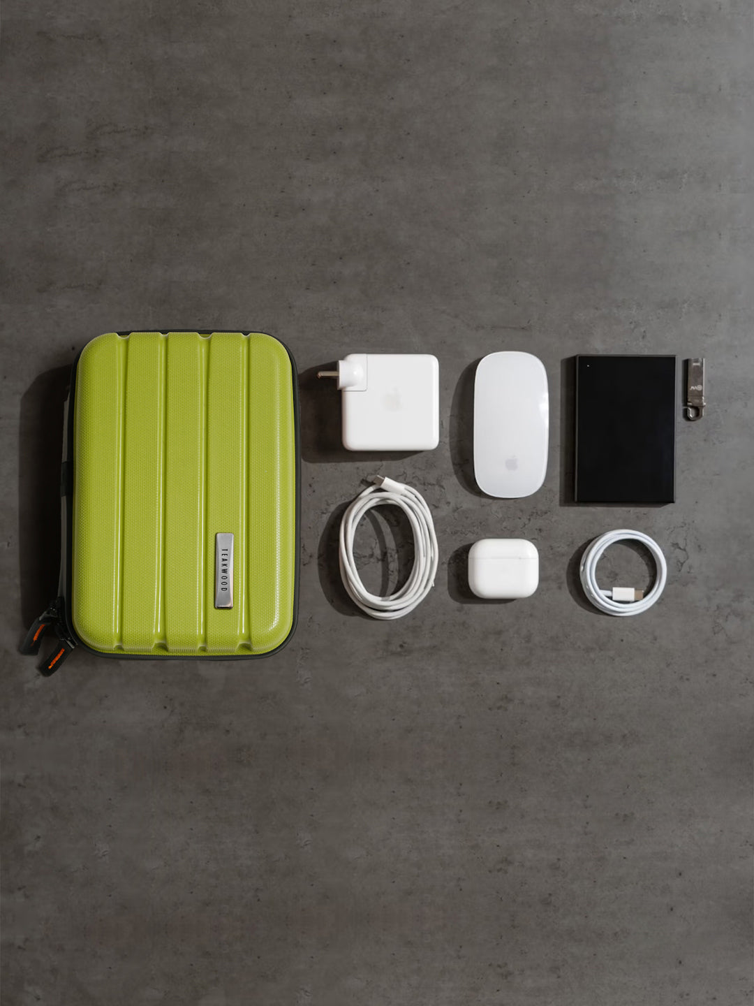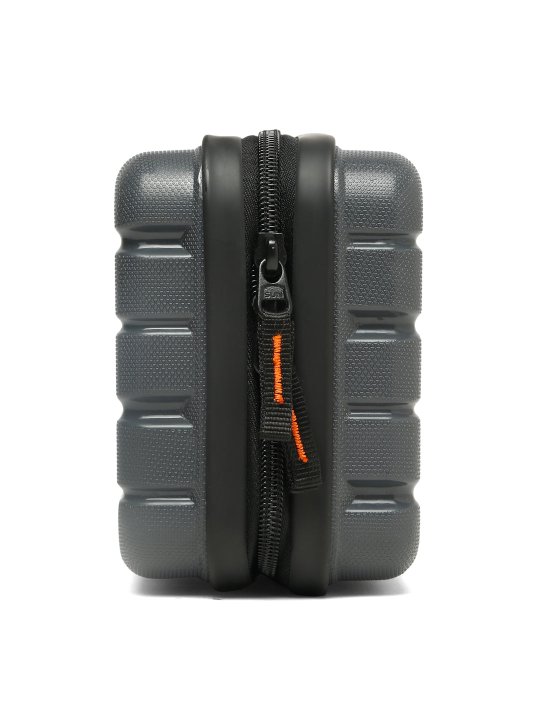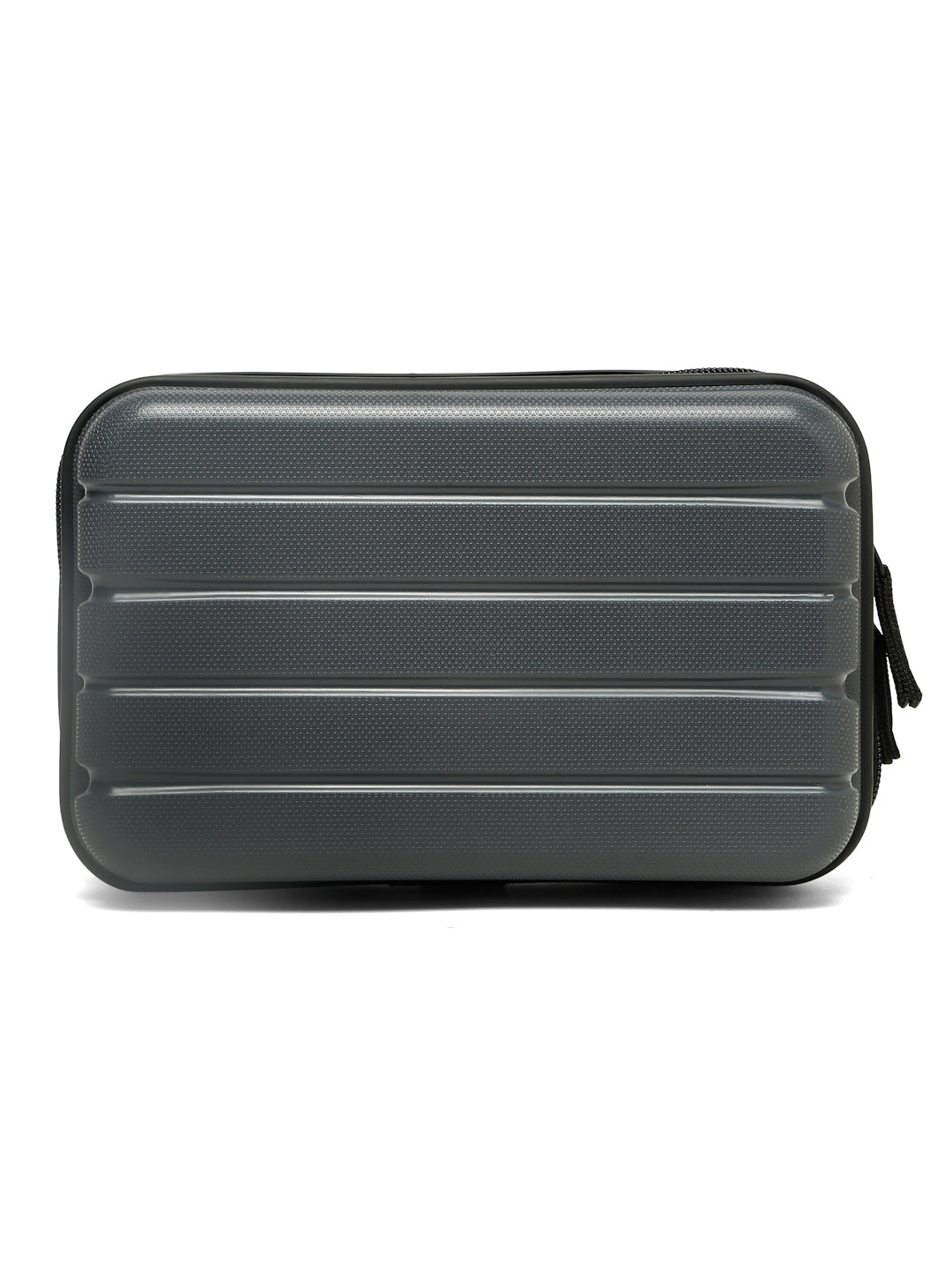A small, rectangular hard-shell organizer case designed for travel and daily use. The case has ribbed exterior with a smooth, durable finish and a zipper closure. A black interior with multiple compartments. The top section includes a zippered mesh pocket holding small items such as a pen and a slim electronic device. The bottom section has elastic straps that securely hold a wall charger, a charging case, a USB cable, and wired earphones. The layout keeps all items separated and neatly arranged.