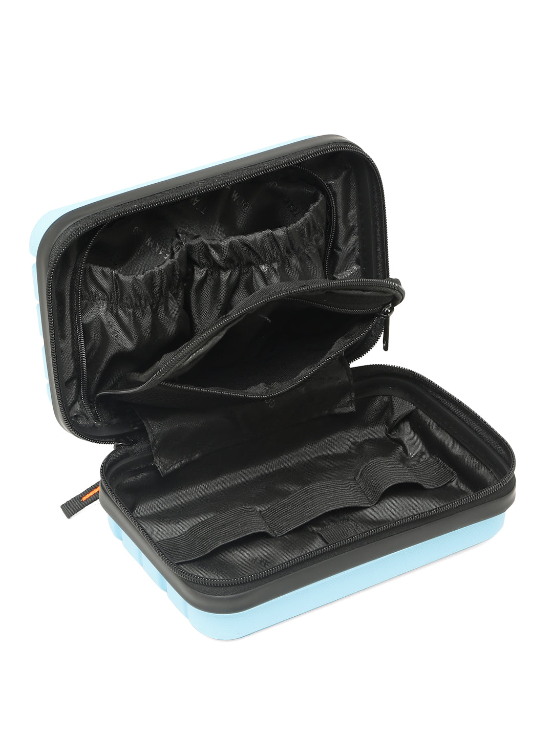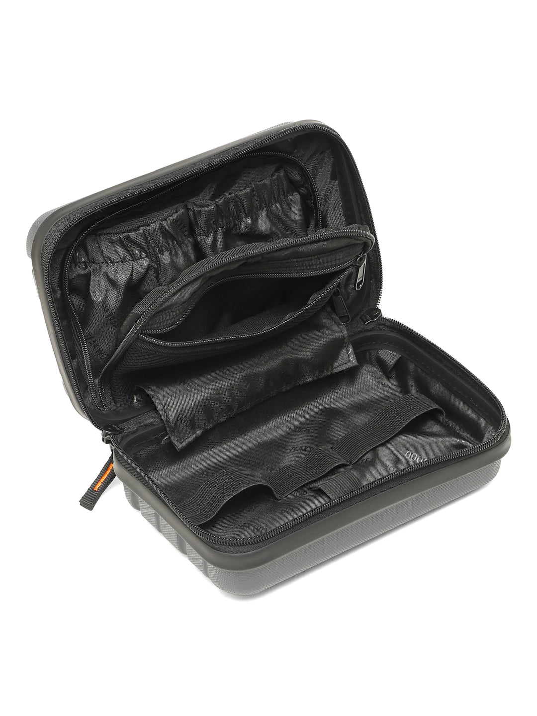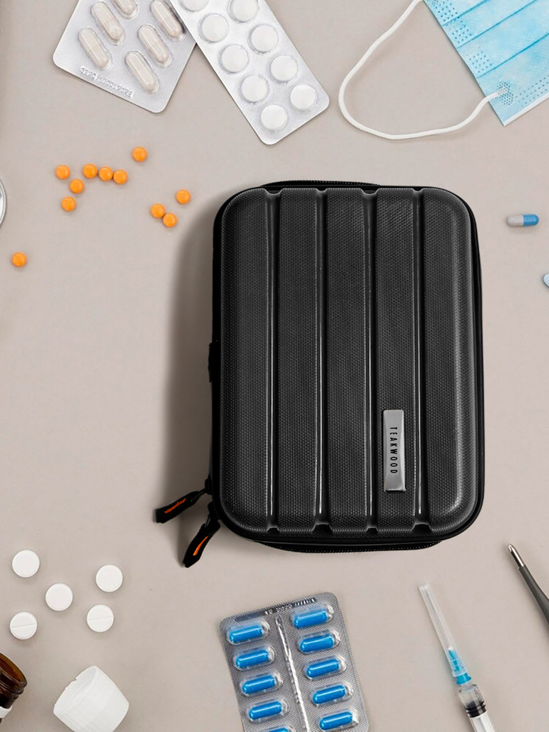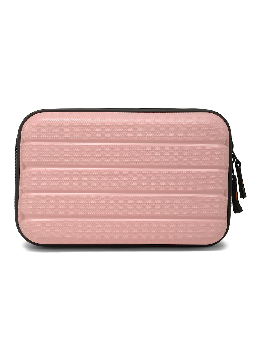 A small, rectangular hard-shell organizer case designed for travel and daily use. The case has ribbed exterior with a smooth, durable finish and a zipper closure. A black interior with multiple compartments. The top section includes a zippered mesh pocket holding small items such as a pen and a slim electronic device. The bottom section has elastic straps that securely hold a wall charger, a charging case, a USB cable, and wired earphones. The layout keeps all items separated and neatly arranged.