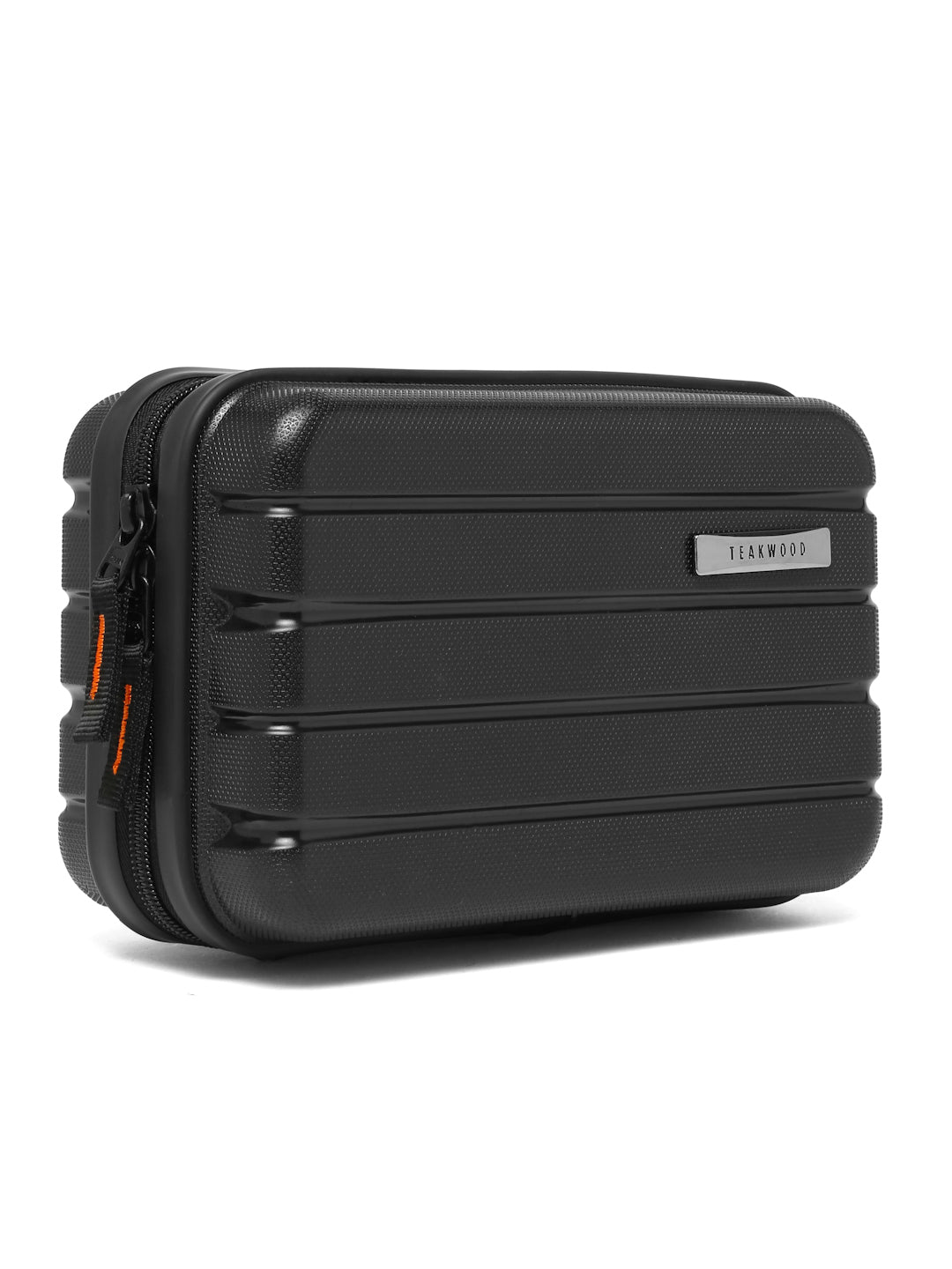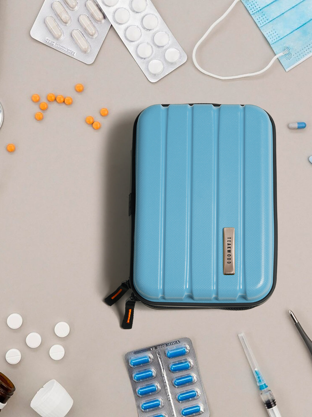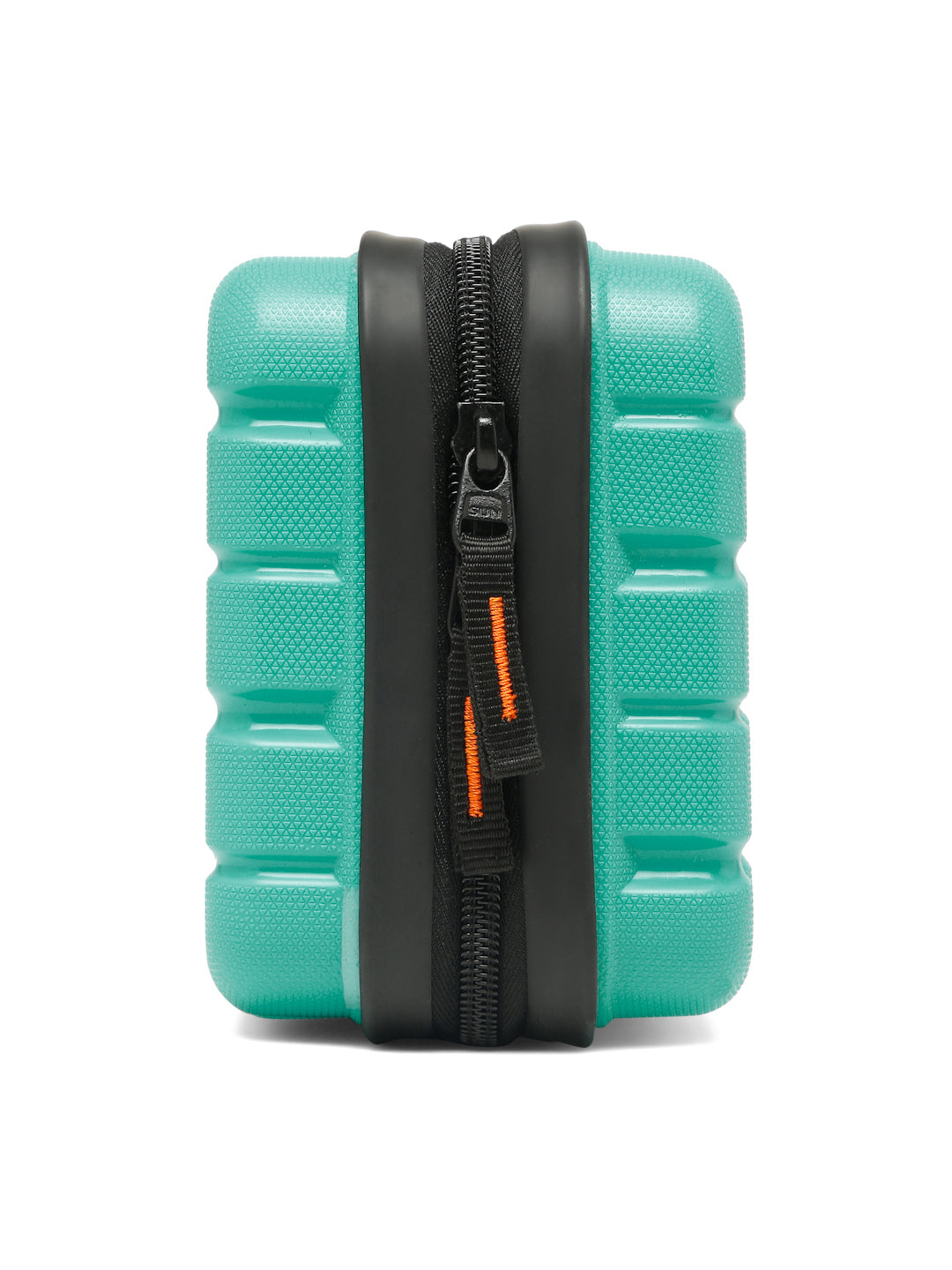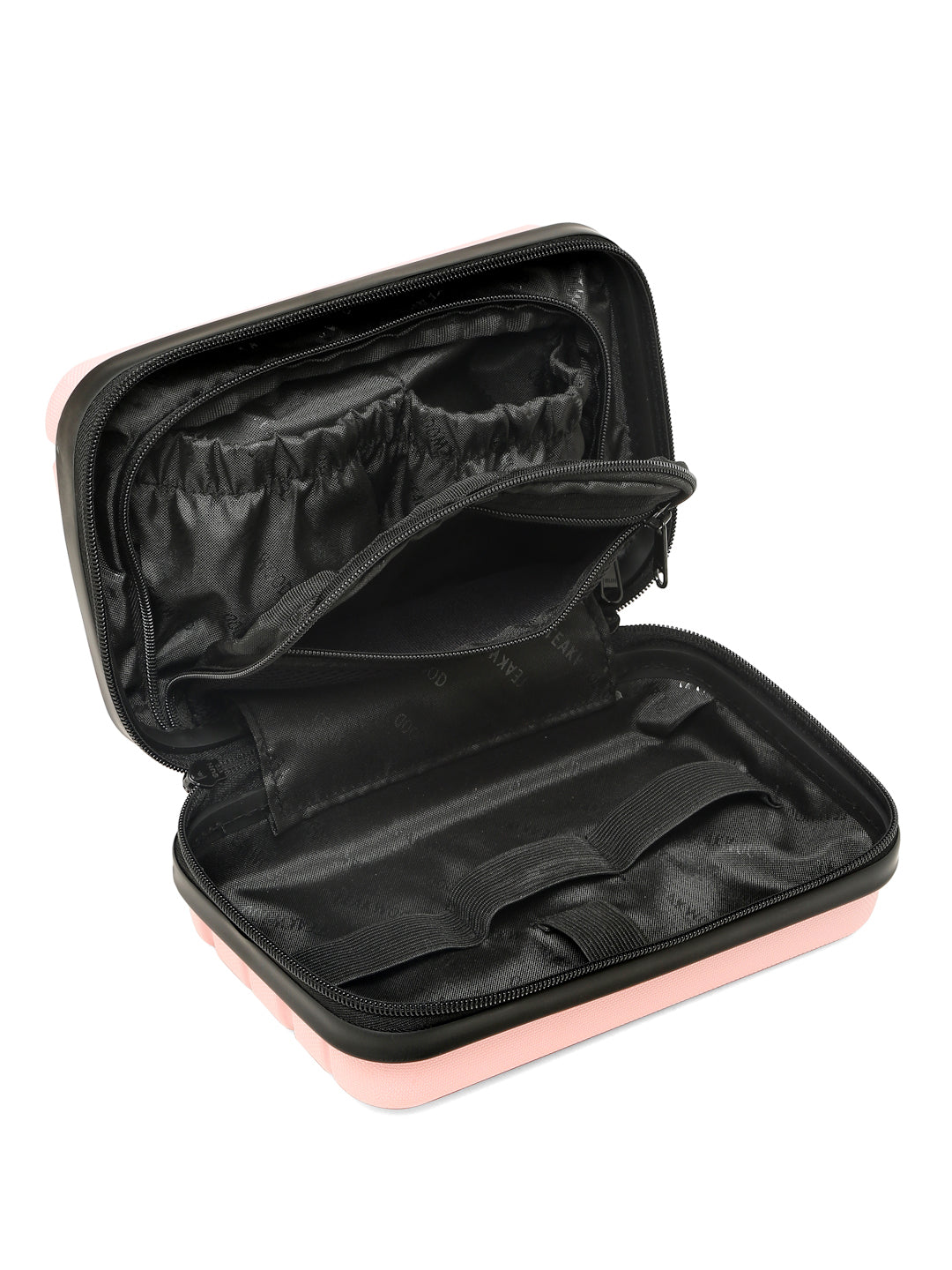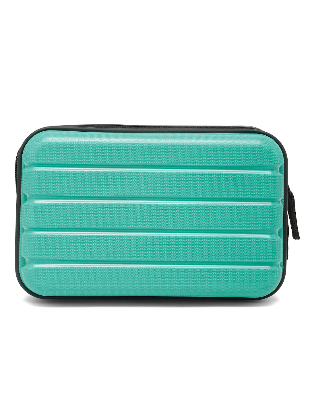 A small, rectangular hard-shell organizer case designed for travel and daily use. The case has ribbed exterior with a smooth, durable finish and a zipper closure. A black interior with multiple compartments. The top section includes a zippered mesh pocket holding small items such as a pen and a slim electronic device. The bottom section has elastic straps that securely hold a wall charger, a charging case, a USB cable, and wired earphones. The layout keeps all items separated and neatly arranged.