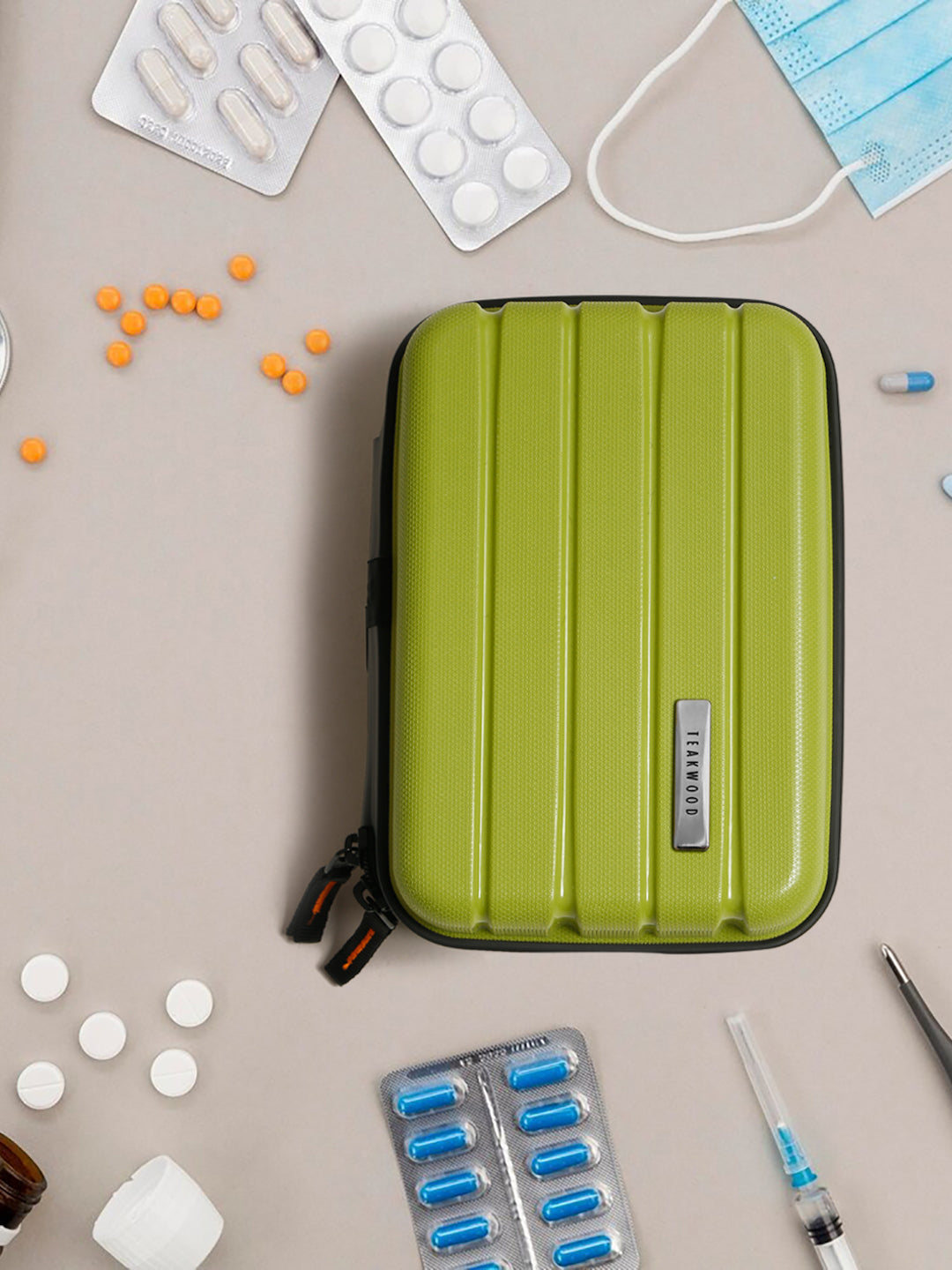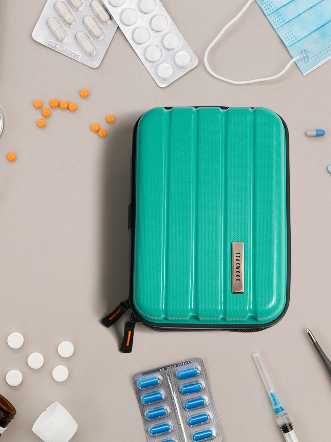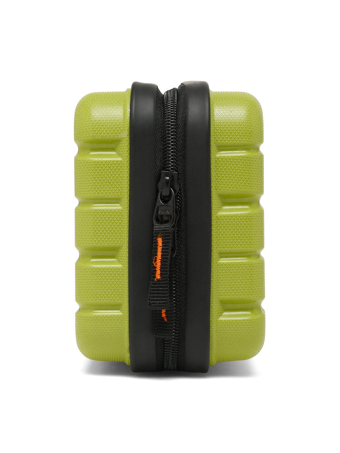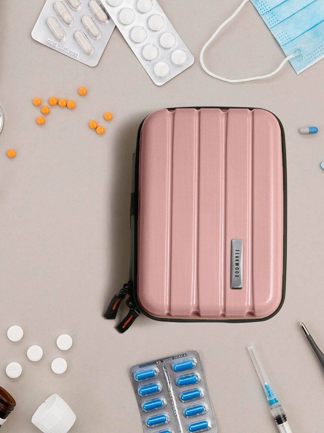 A small, rectangular hard-shell organizer case designed for travel and daily use. The case has ribbed exterior with a smooth, durable finish and a zipper closure. A black interior with multiple compartments. The top section includes a zippered mesh pocket holding small items such as a pen and a slim electronic device. The bottom section has elastic straps that securely hold a wall charger, a charging case, a USB cable, and wired earphones. The layout keeps all items separated and neatly arranged.