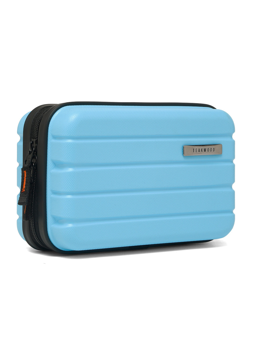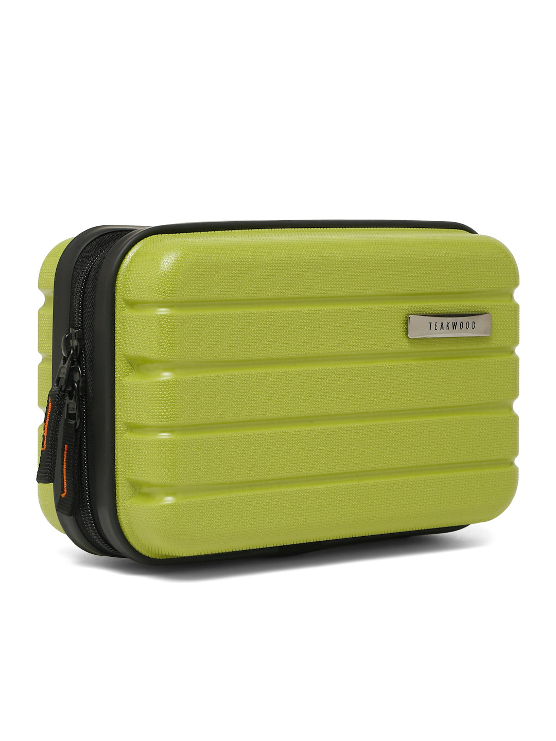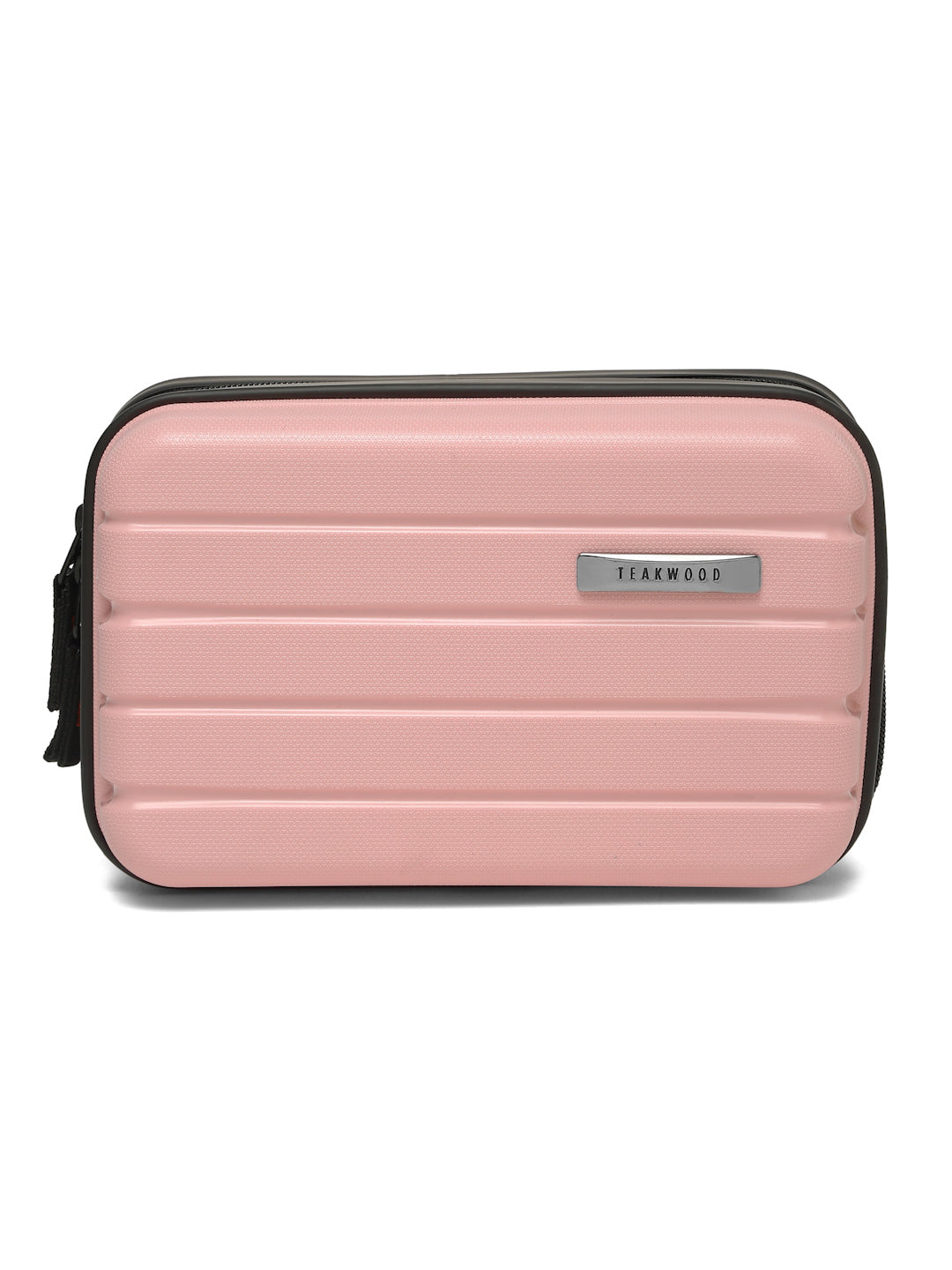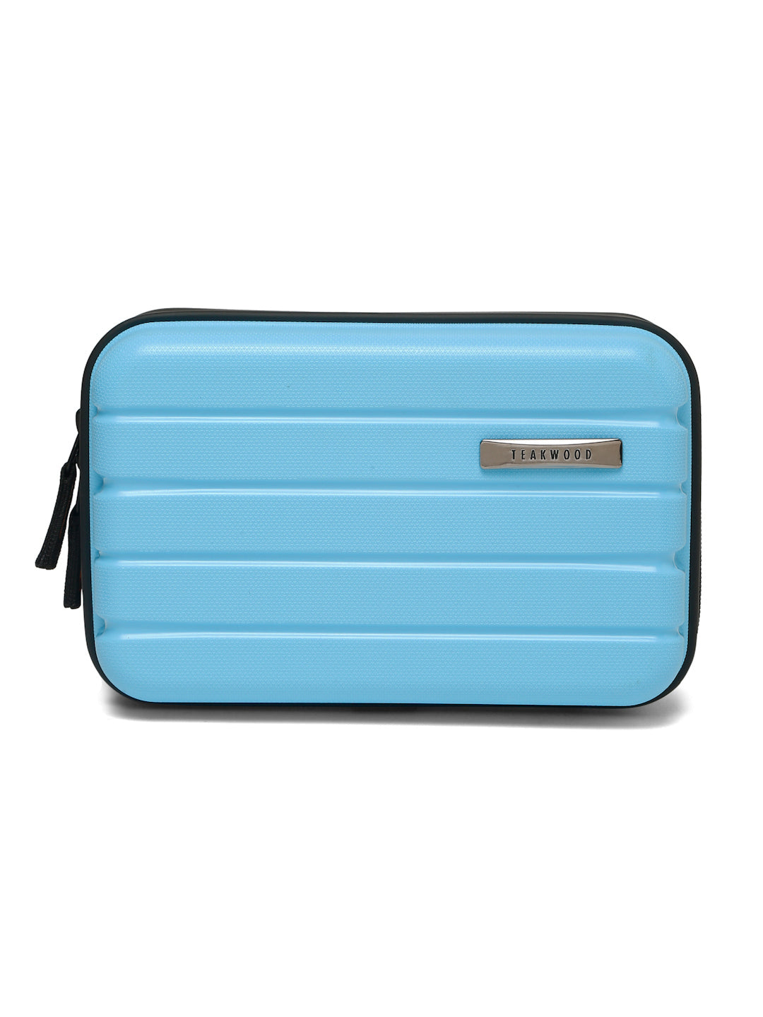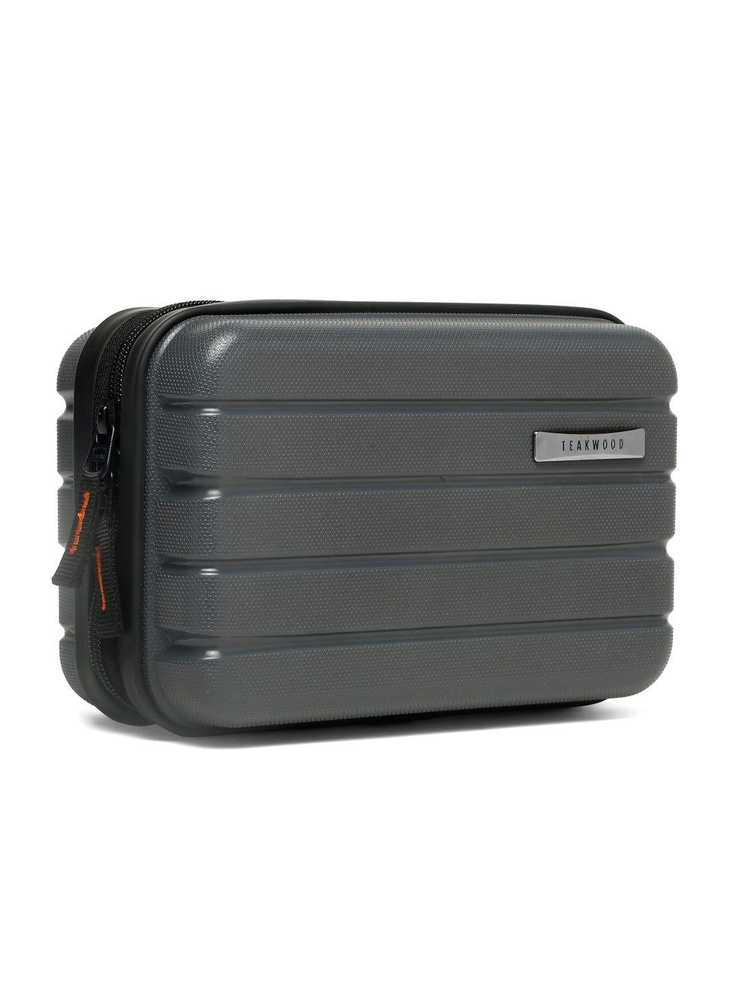 A small, rectangular hard-shell organizer case designed for travel and daily use. The case has ribbed exterior with a smooth, durable finish and a zipper closure. A black interior with multiple compartments. The top section includes a zippered mesh pocket holding small items such as a pen and a slim electronic device. The bottom section has elastic straps that securely hold a wall charger, a charging case, a USB cable, and wired earphones. The layout keeps all items separated and neatly arranged.