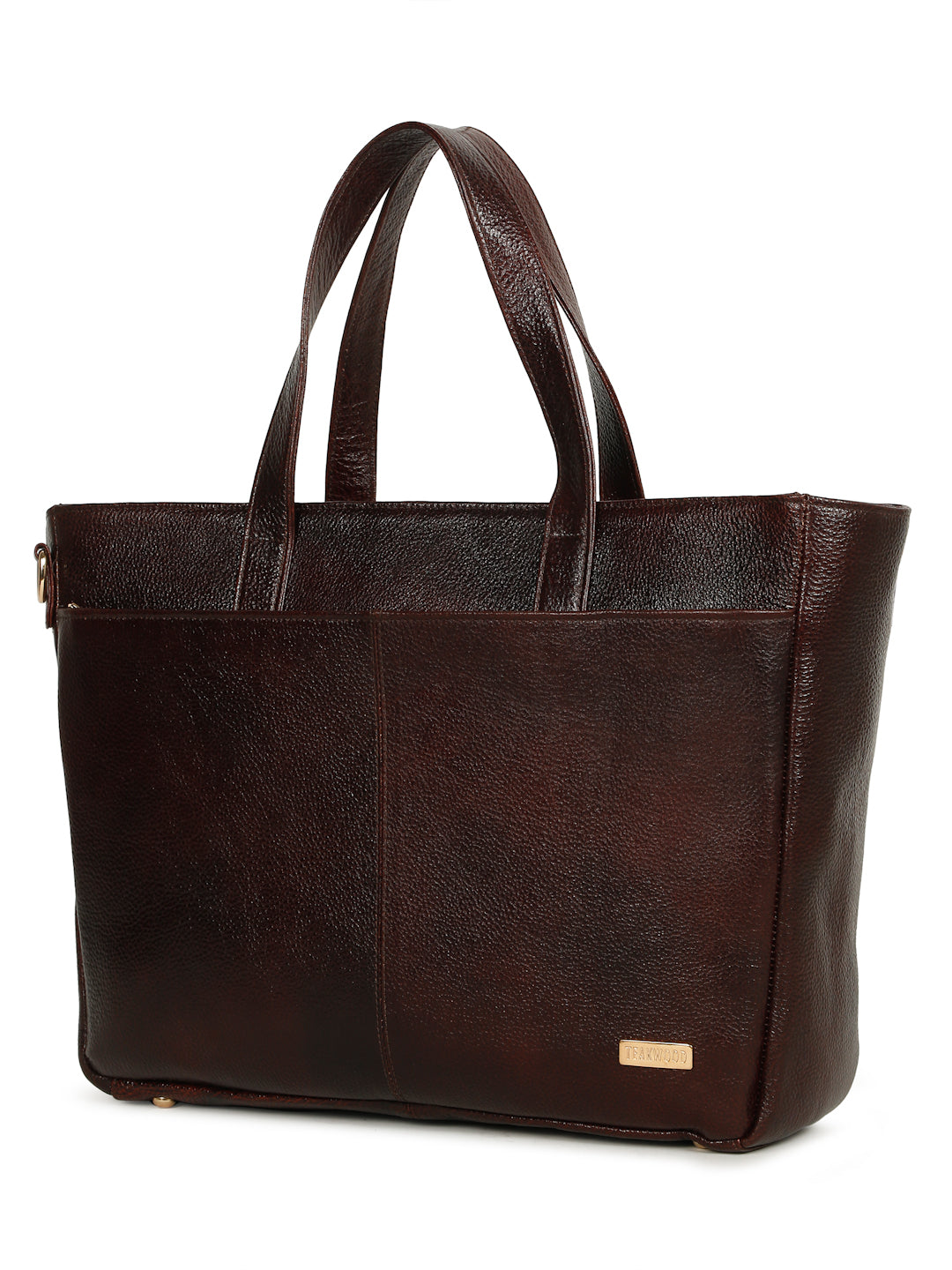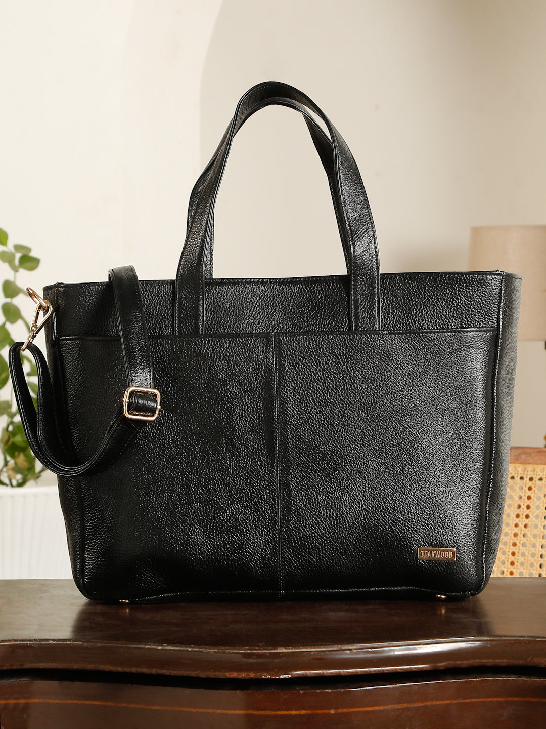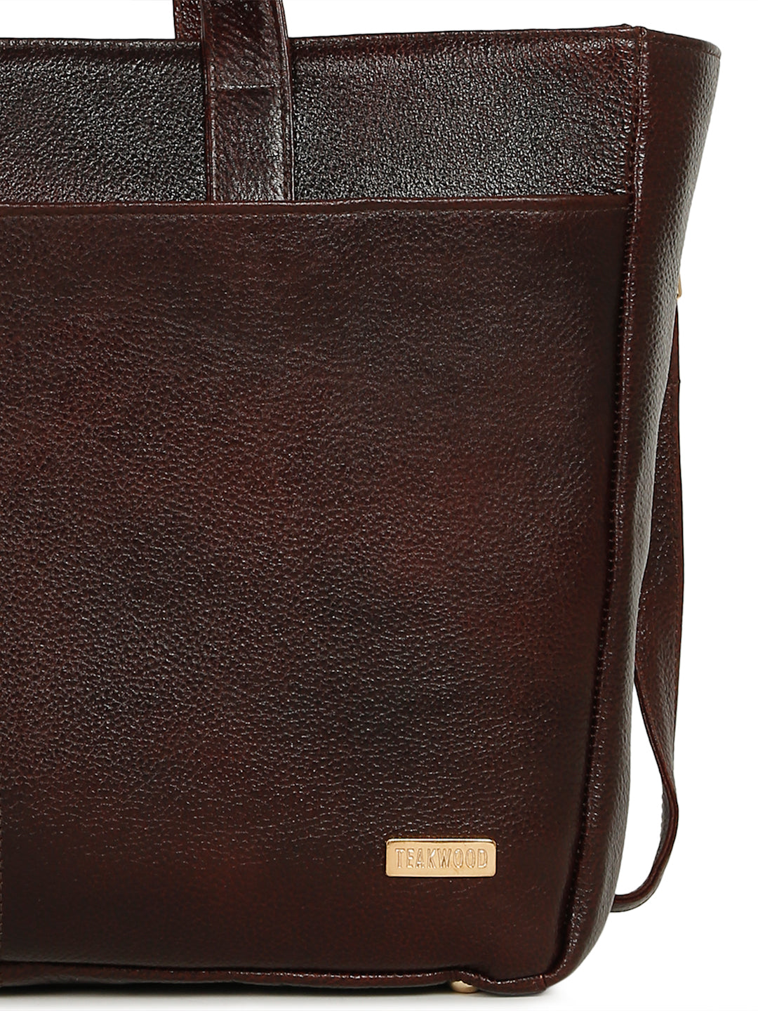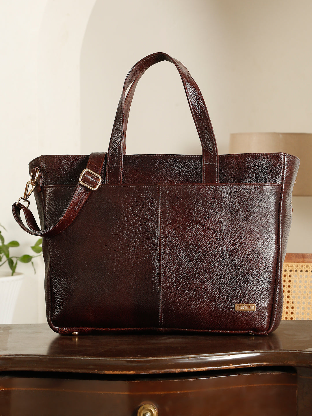 This teakwood leather tote bag is made of genuine leather, it have Clean, minimalistic front with straight stitching lines. in this bag have dual handles for hand- carry also have Detachable & adjustable long shoulder strap with a gold-tone buckle. in this bag have Large spacious main compartment. One padded laptop/tablet compartment with a securing strap and Side zipper pocket for essentials. Open slip pockets for phone, cosmetics, etc. Full top zipper closure for security.