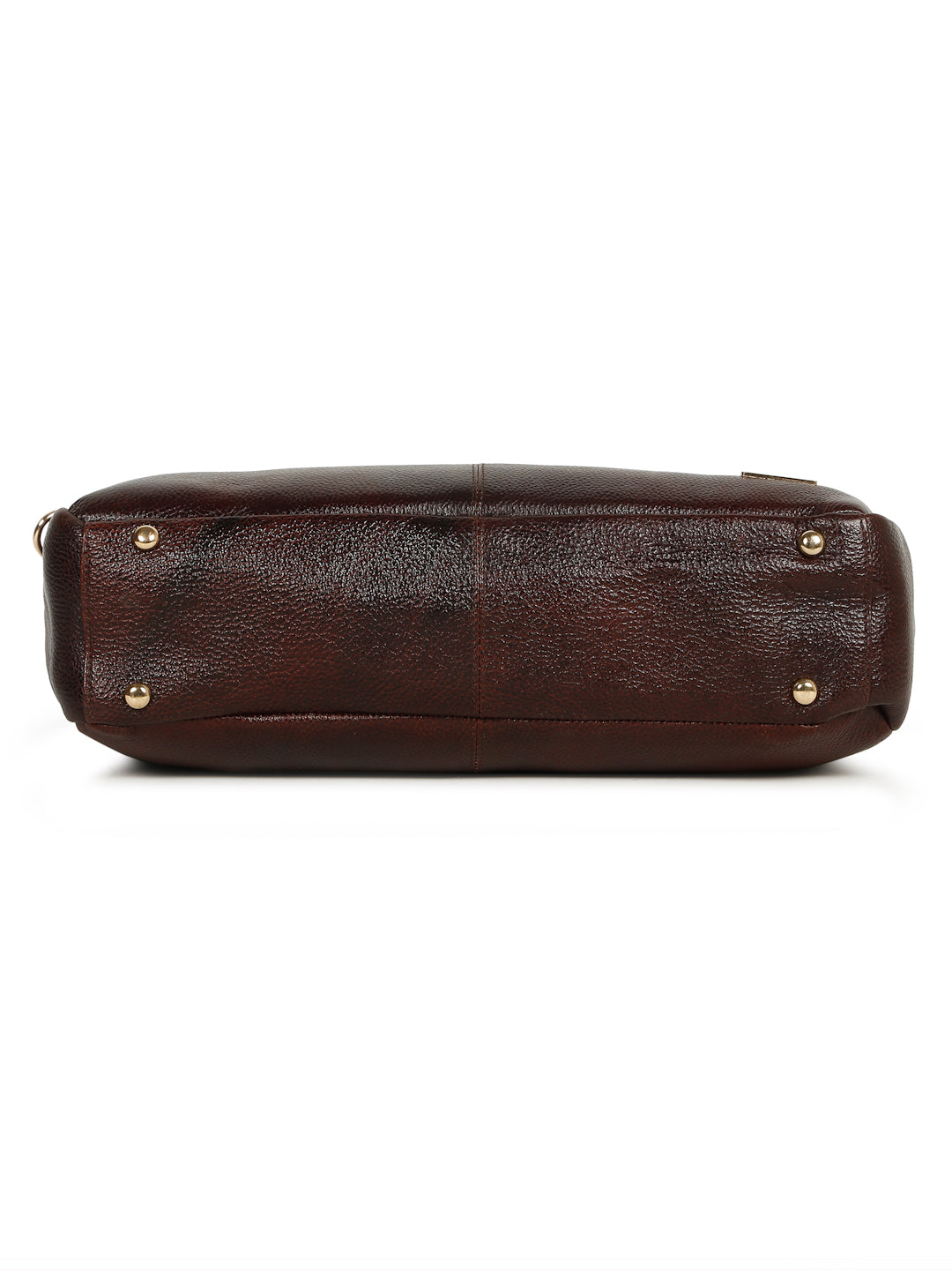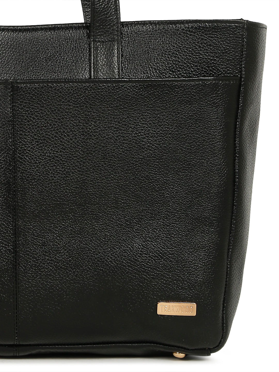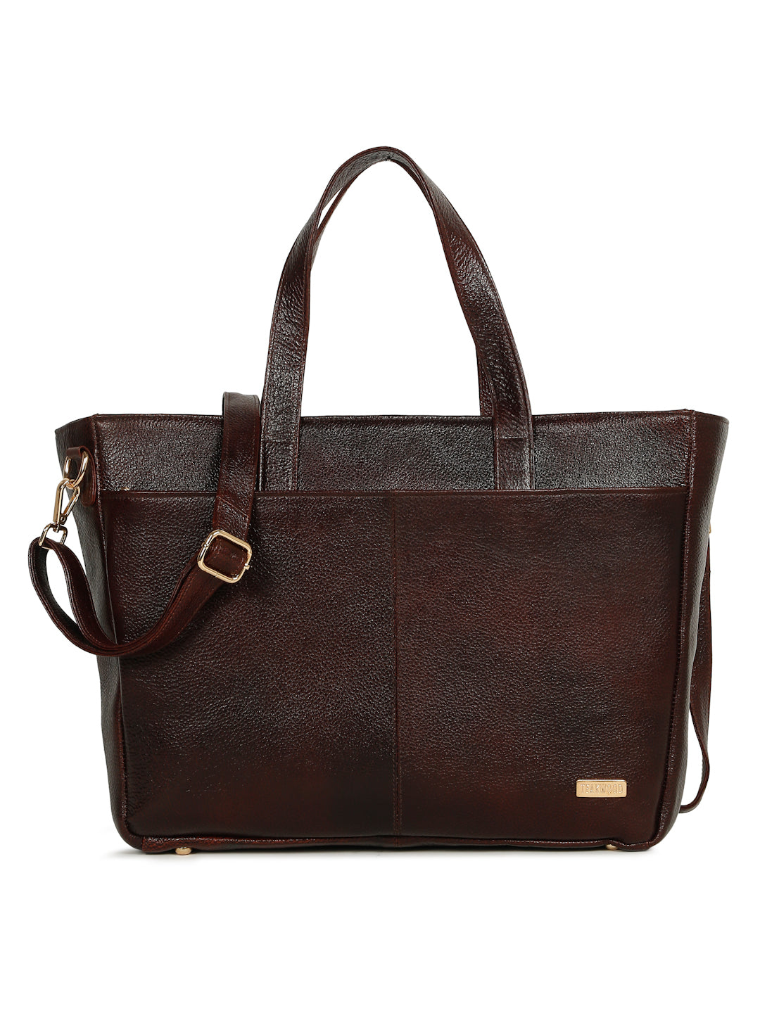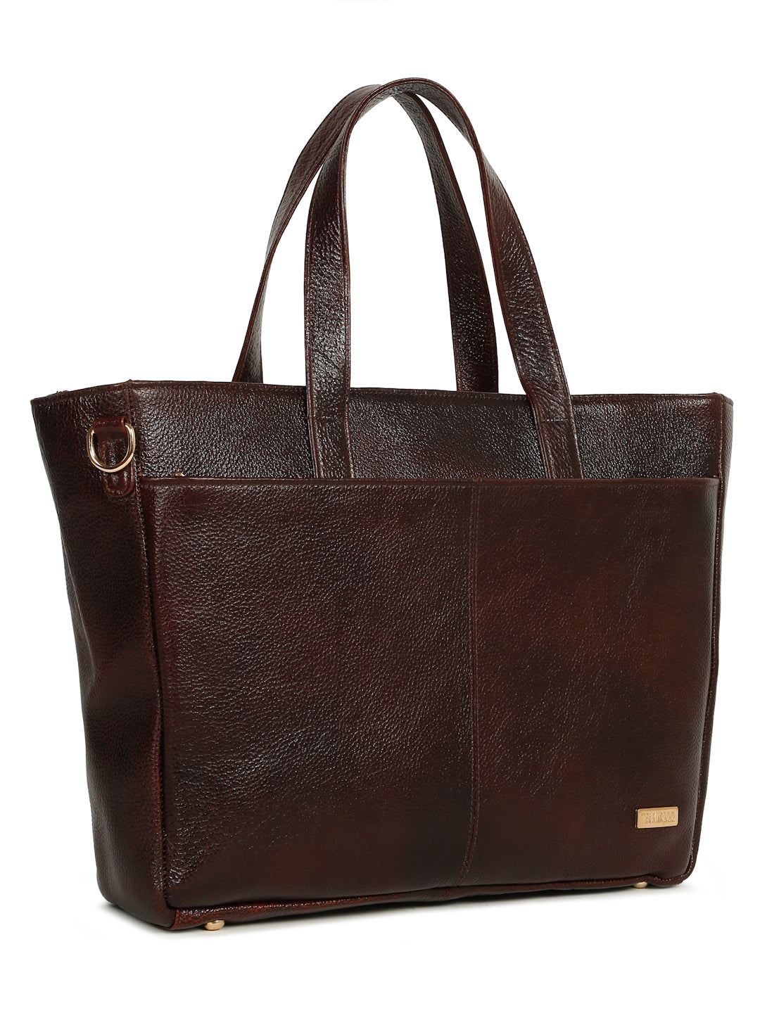This teakwood leather tote bag is made of genuine leather, it have Clean, minimalistic front with straight stitching lines. in this bag have dual handles for hand- carry also have Detachable & adjustable long shoulder strap with a gold-tone buckle. in this bag have Large spacious main compartment. One padded laptop/tablet compartment with a securing strap and Side zipper pocket for essentials. Open slip pockets for phone, cosmetics, etc. Full top zipper closure for security.