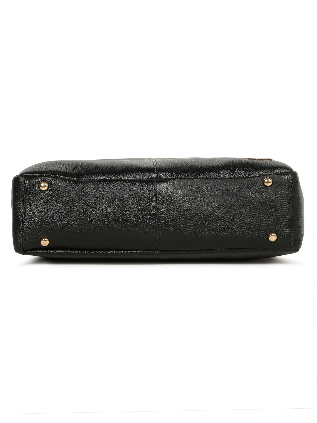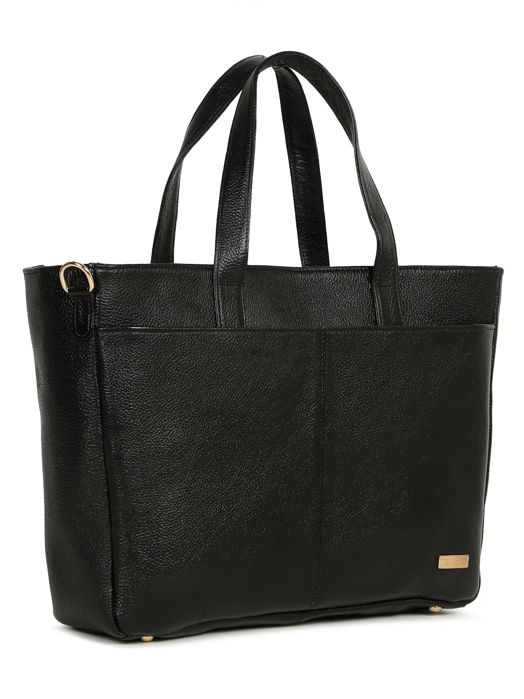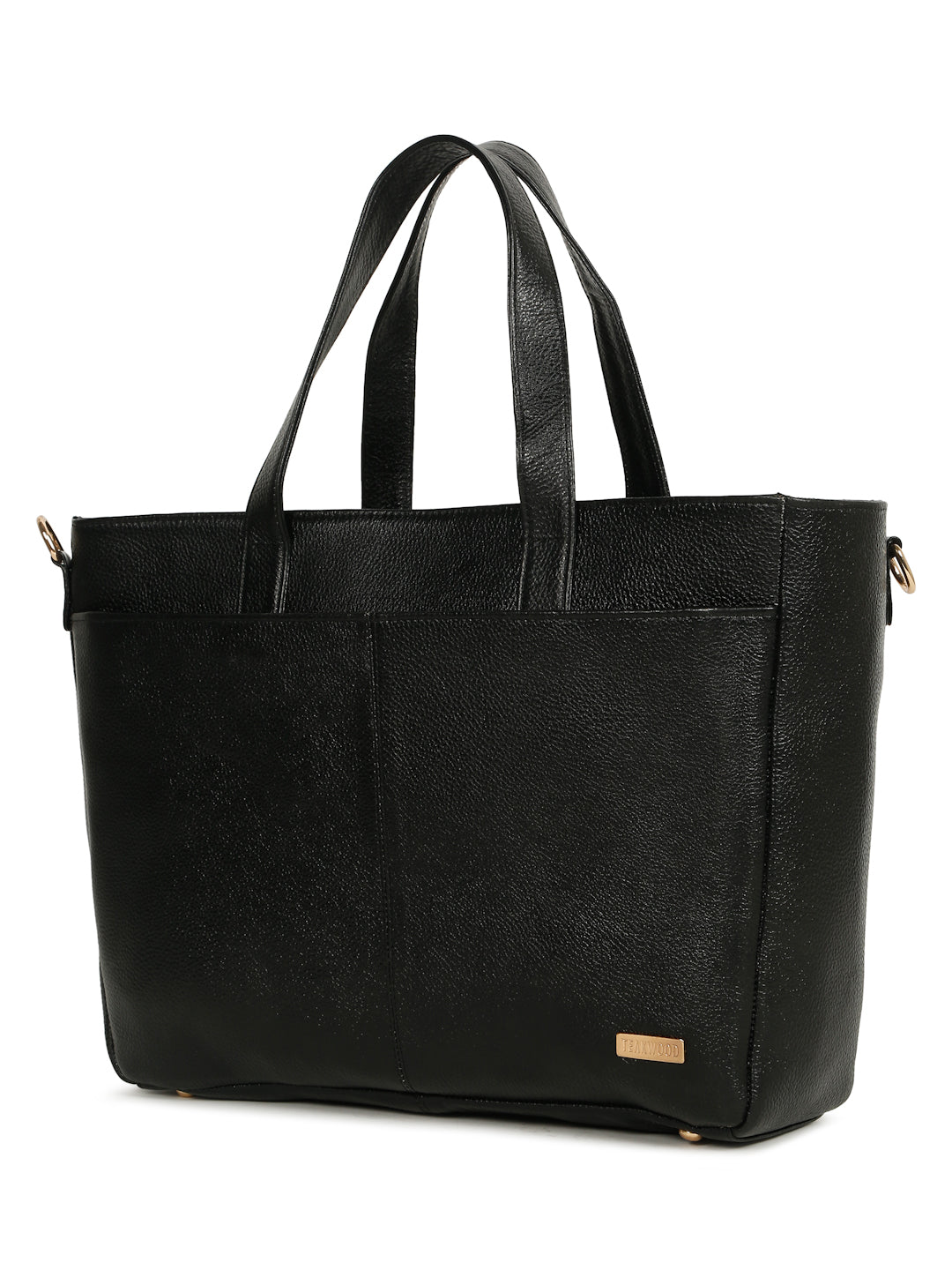 This is a leather tote bag with a sleek, structured design. It has a polished, textured leather exterior that gives it a classy and professional look, making it suitable for office, daily use, and travel.