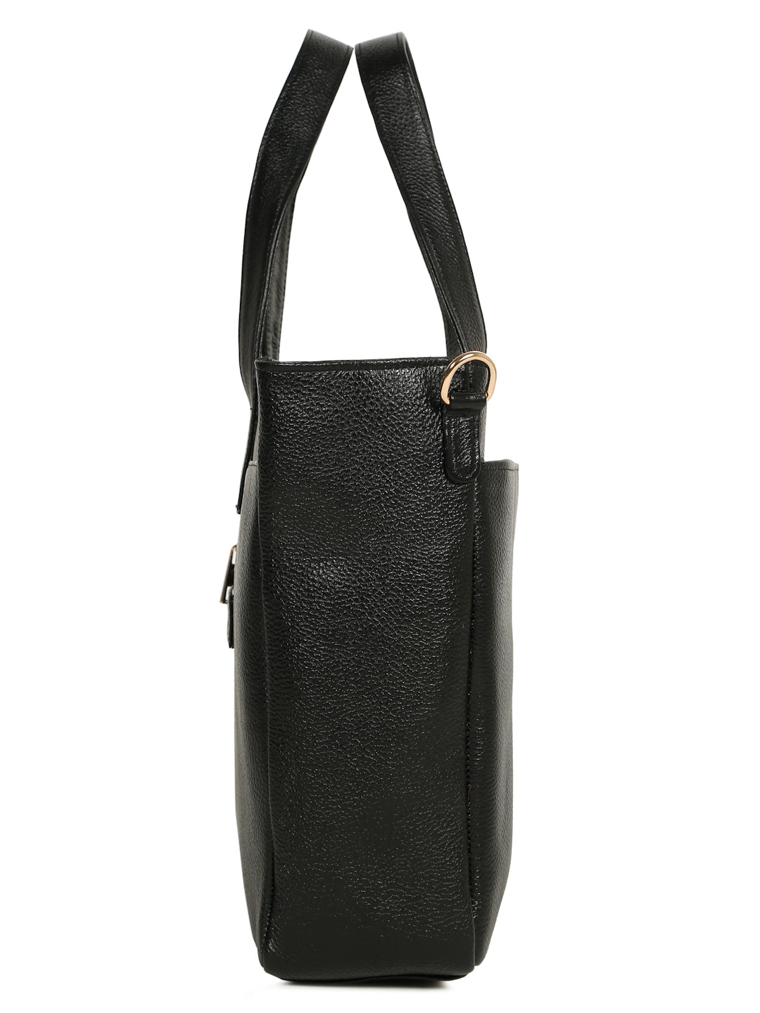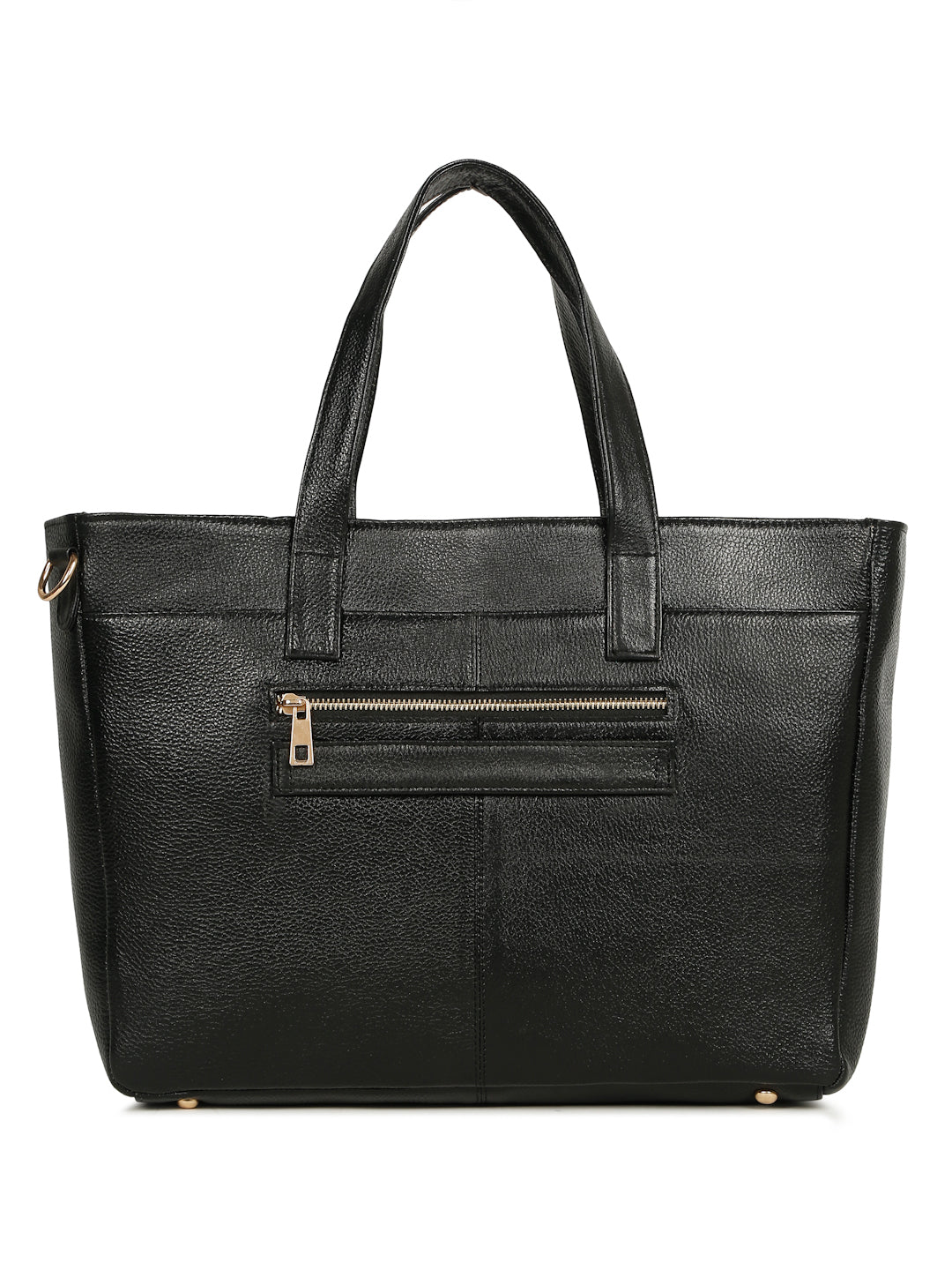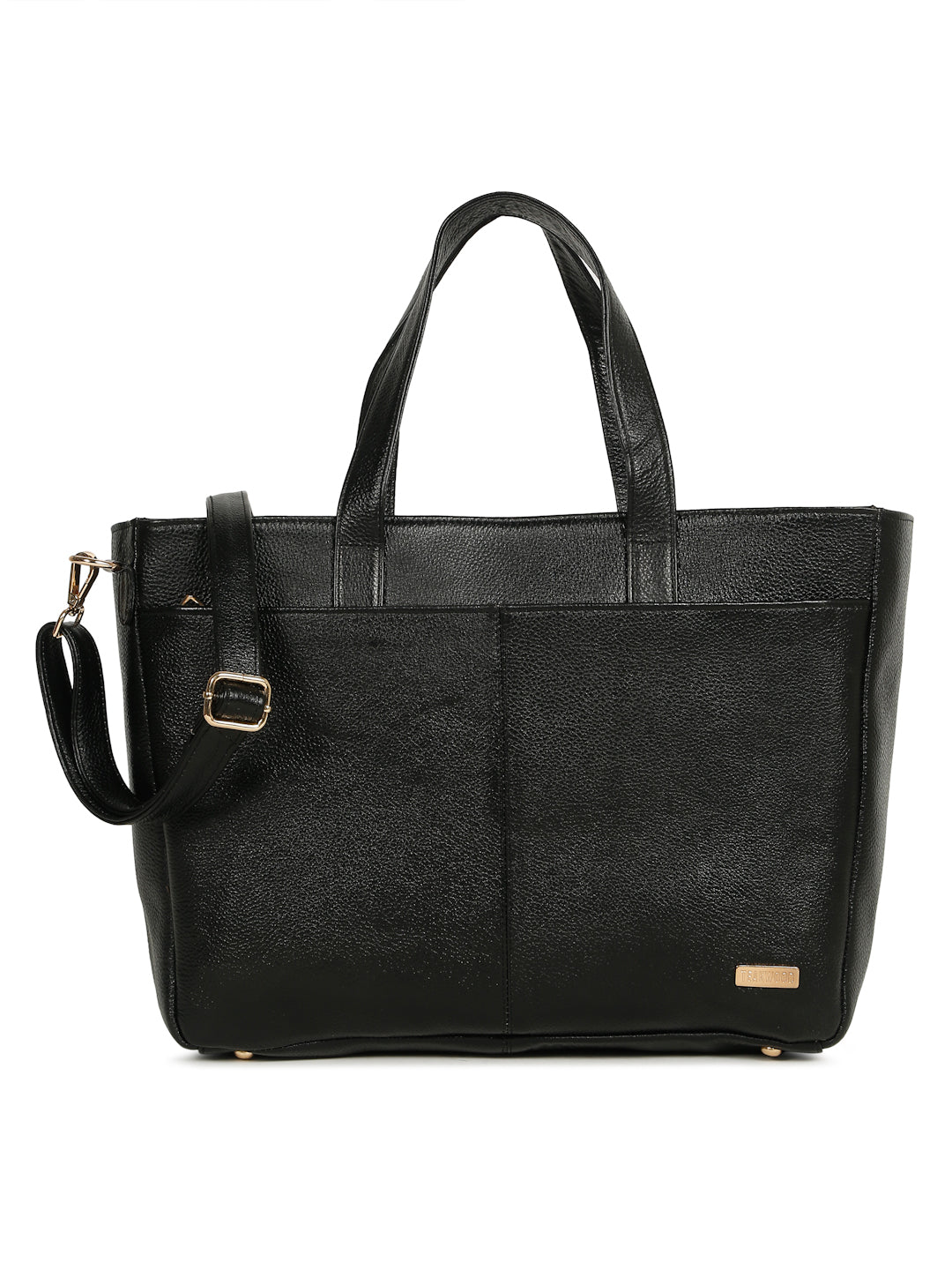 This is a leather tote bag with a sleek, structured design. It has a polished, textured leather exterior that gives it a classy and professional look, making it suitable for office, daily use, and travel.