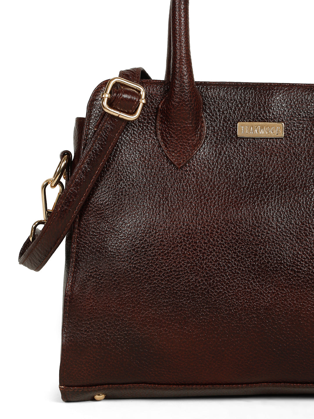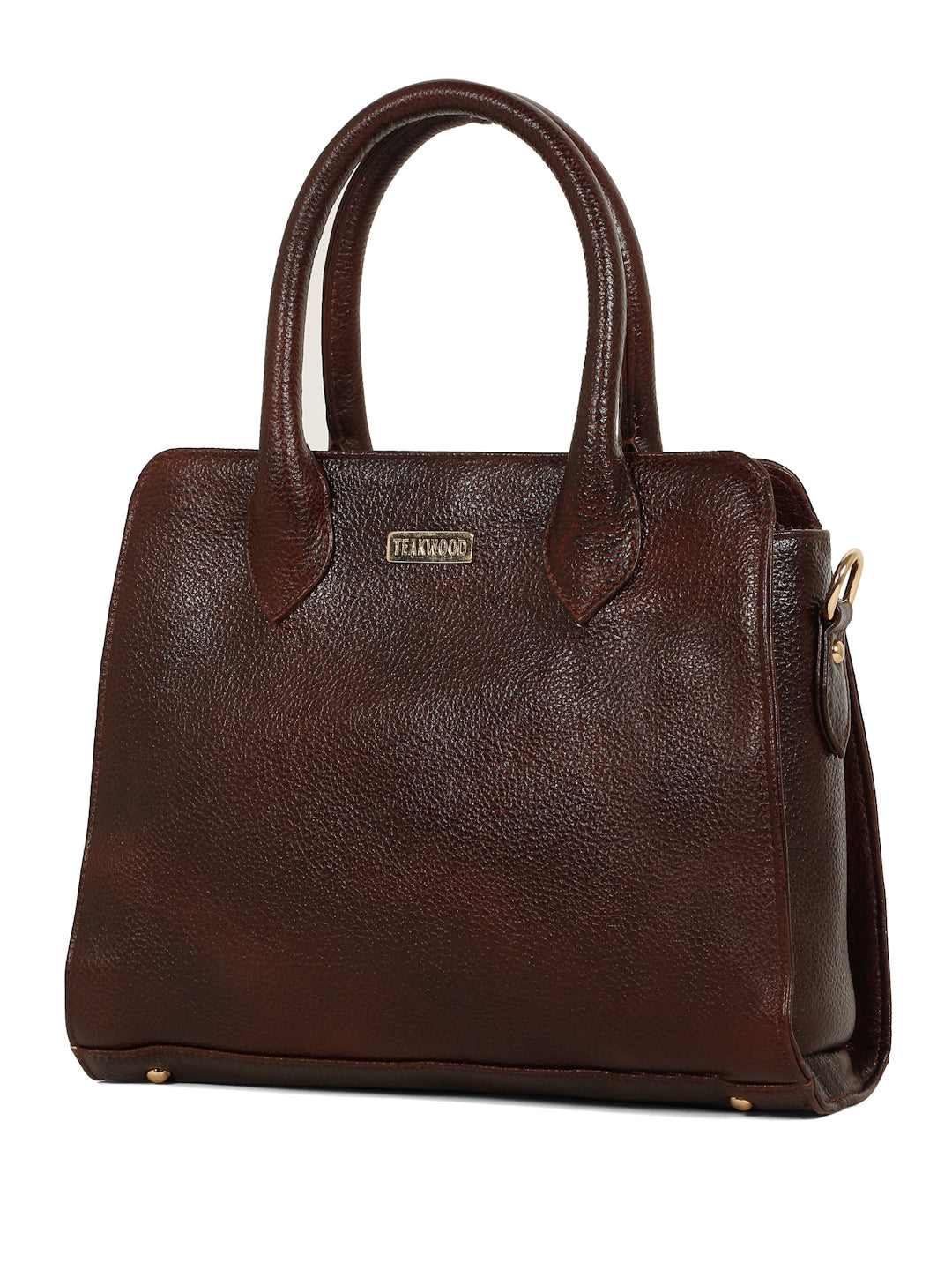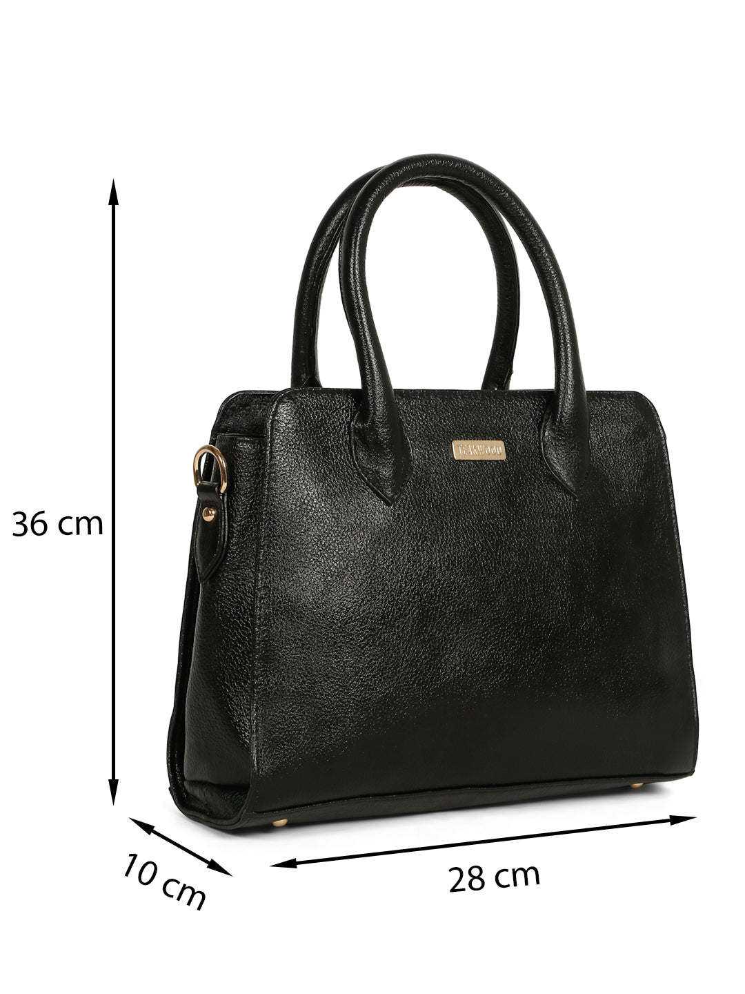This teakwood leather hand bag made of high quality leather with a lightly textured finish, Clean and classy look with a smooth, semi-gloss texture, Sturdy dual top handles, Adjustable & detachable shoulder strap with gold-tone hardware, Compact yet roomy shape for everyday essentials. Inner zip pocket and slip pockets for organizing small items, Zipper-closure main compartment, Fully lined interior with TEAKWOOD branding.this hand bag is best for Office, casual outings, daily use, and semi-formal occasions.
