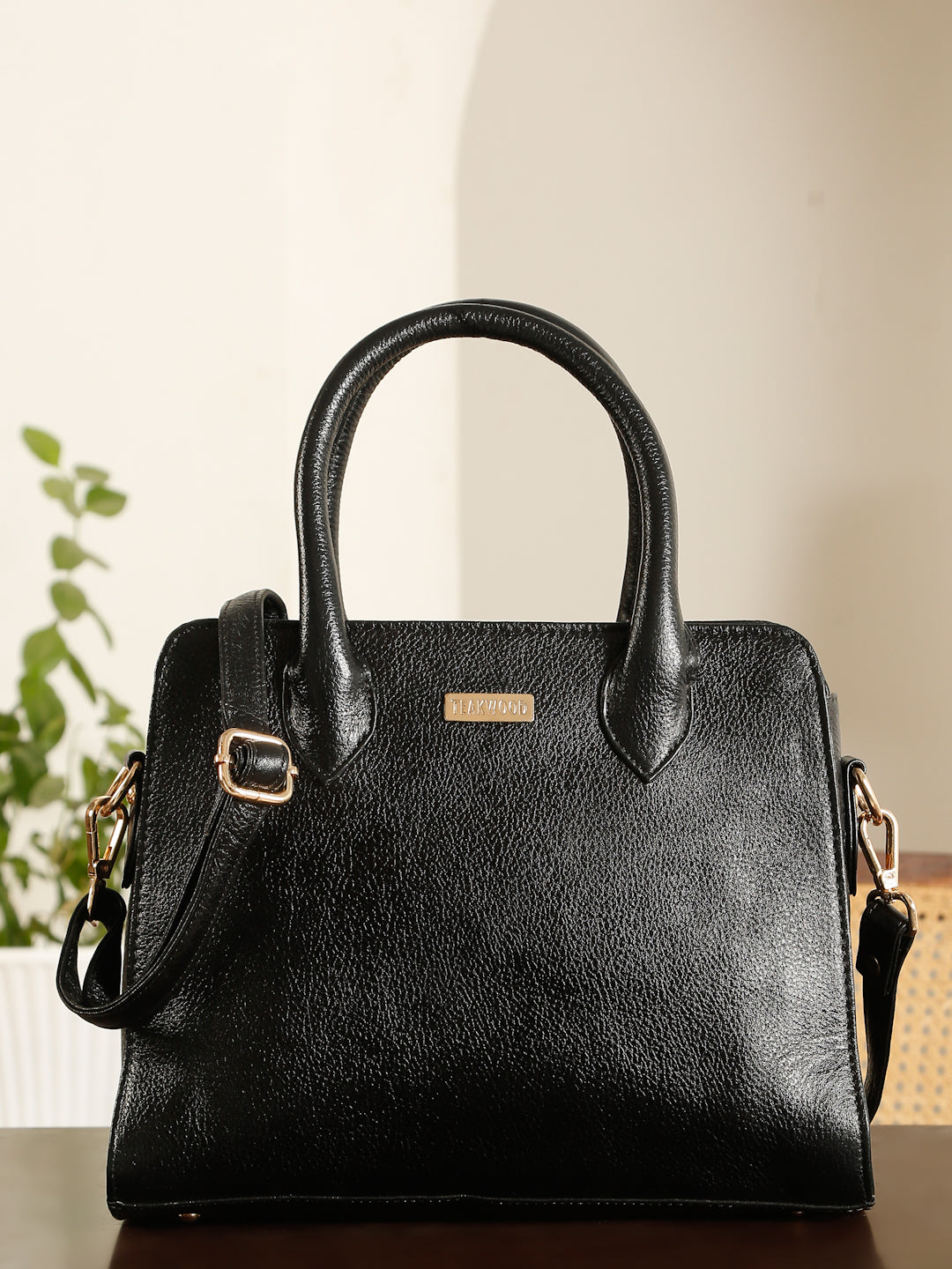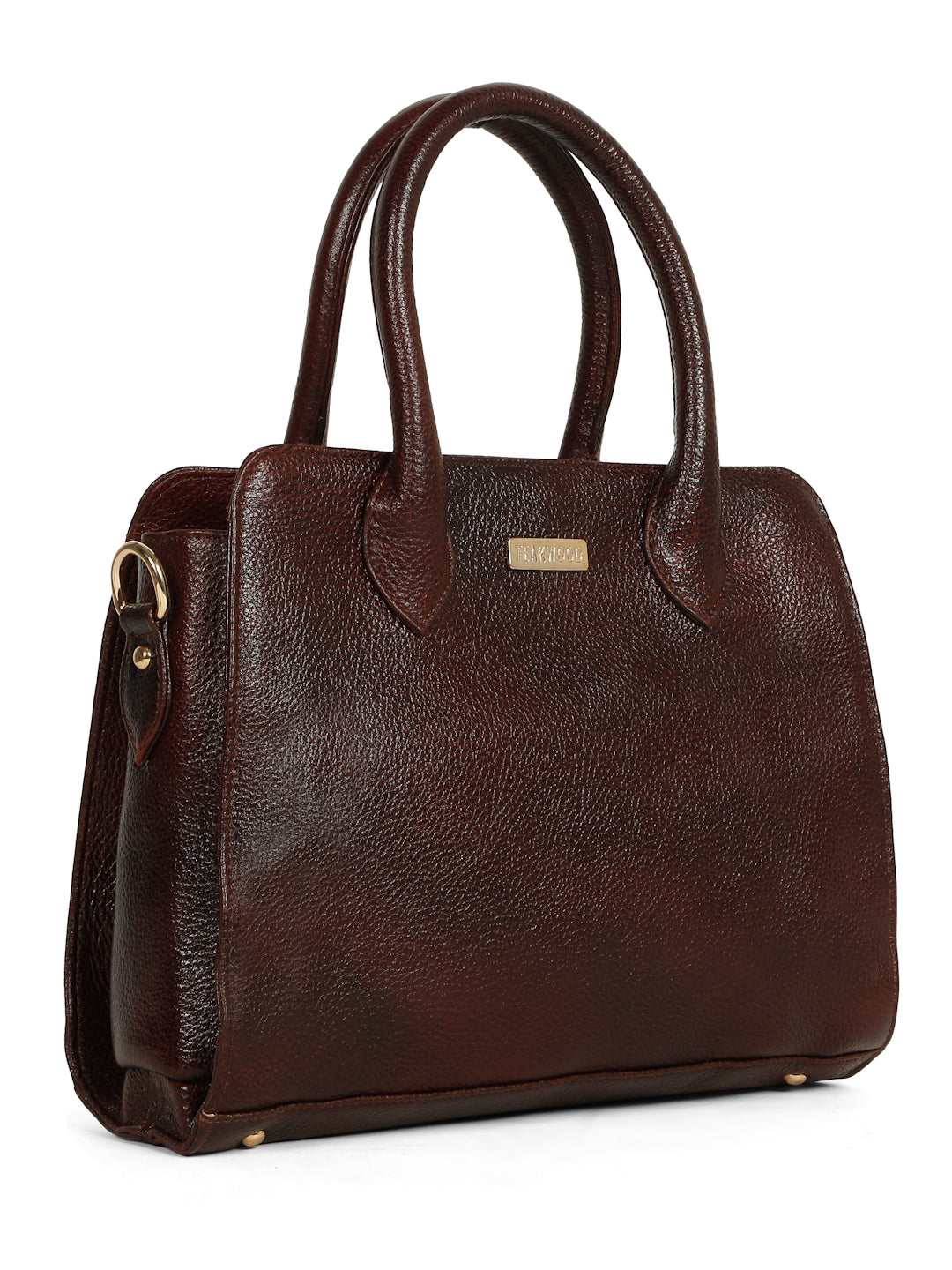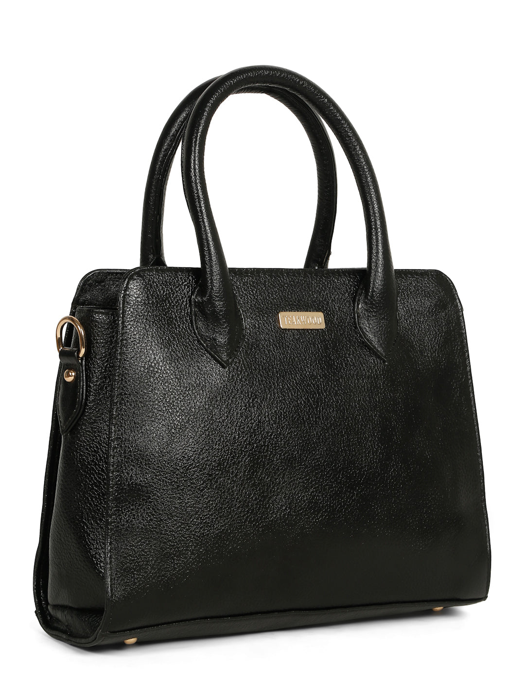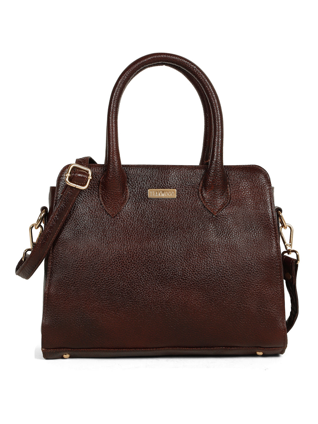 This teakwood leather hand bag made of high quality leather with a lightly textured finish, Clean and classy look with a smooth, semi-gloss texture, Sturdy dual top handles, Adjustable & detachable shoulder strap with gold-tone hardware, Compact yet roomy shape for everyday essentials. Inner zip pocket and slip pockets for organizing small items, Zipper-closure main compartment, Fully lined interior with TEAKWOOD branding.this hand bag is best for Office, casual outings, daily use, and semi-formal occasions.
