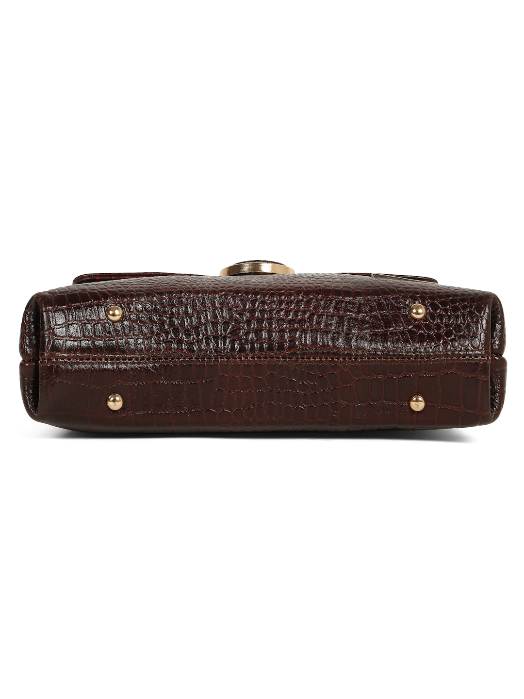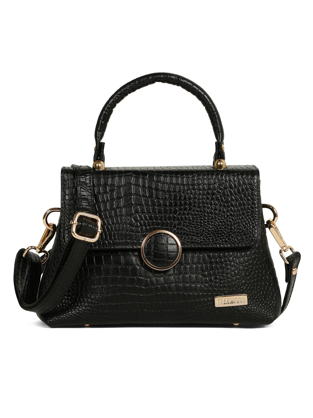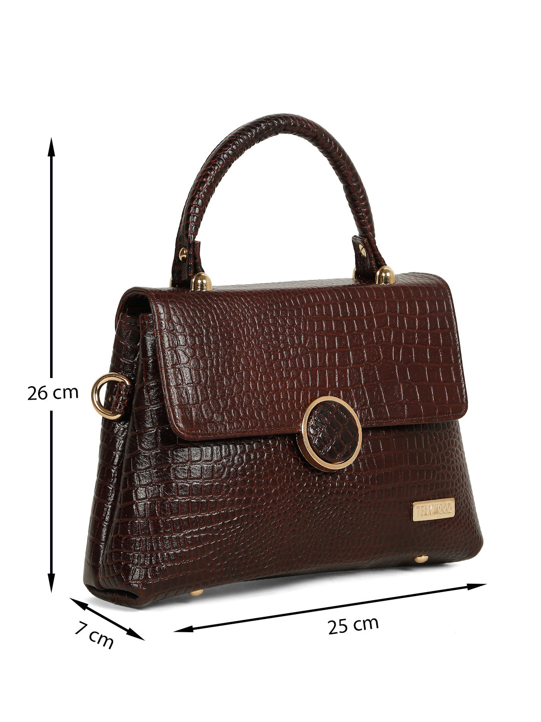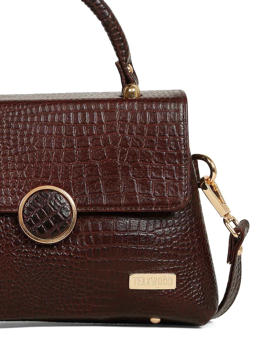 This Teakwood leather hand bag is made of genuine leather the of this bag gives a rich look, The main flap closure features a prominent round metallic clasp which also has the croc texture detail in the center. Gold-toned metallic hardware is used throughout, providing a luxurious contrast to the dark brown material. It has a single, rigid top handle and an adjustable/detachable shoulde strap secured with gold-toned clasps. it have multiple zippered compartments, this hand bag is best for Office, casual outings, daily use, and semi-formal occasions.