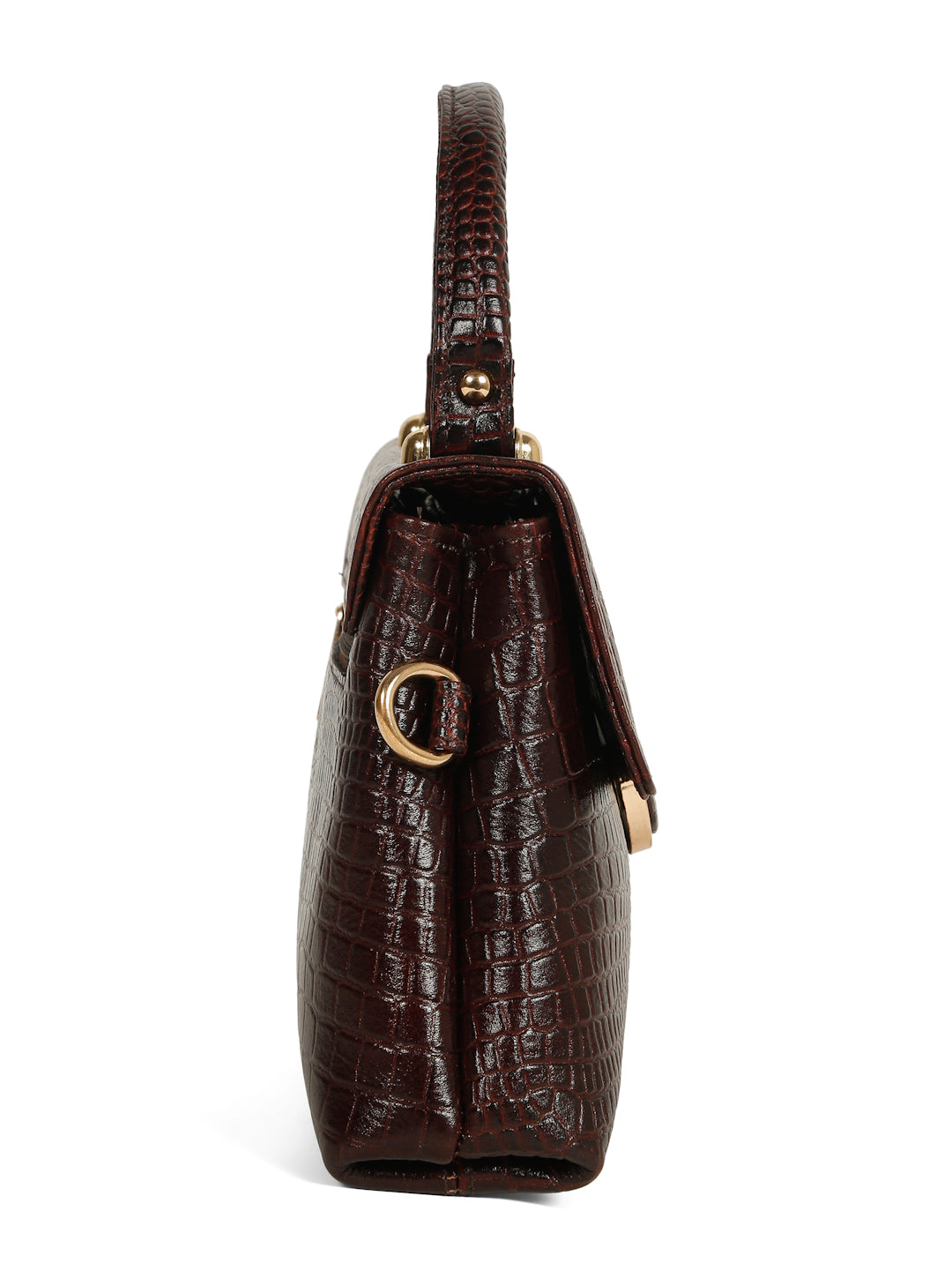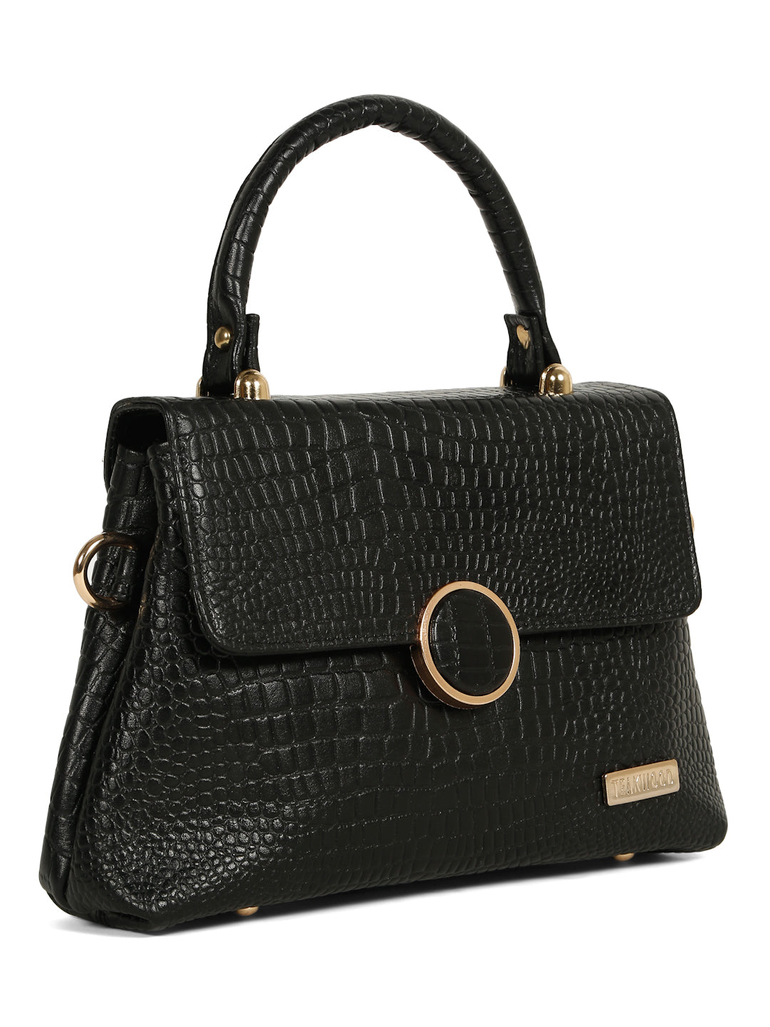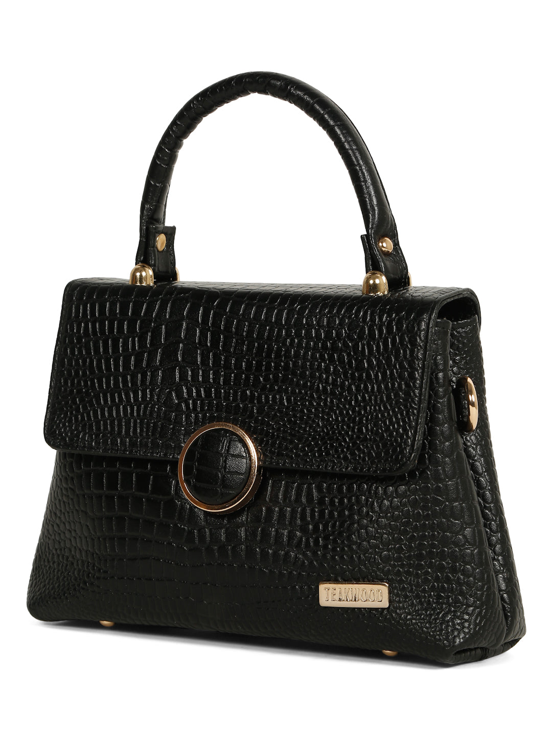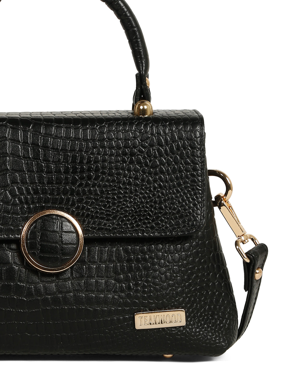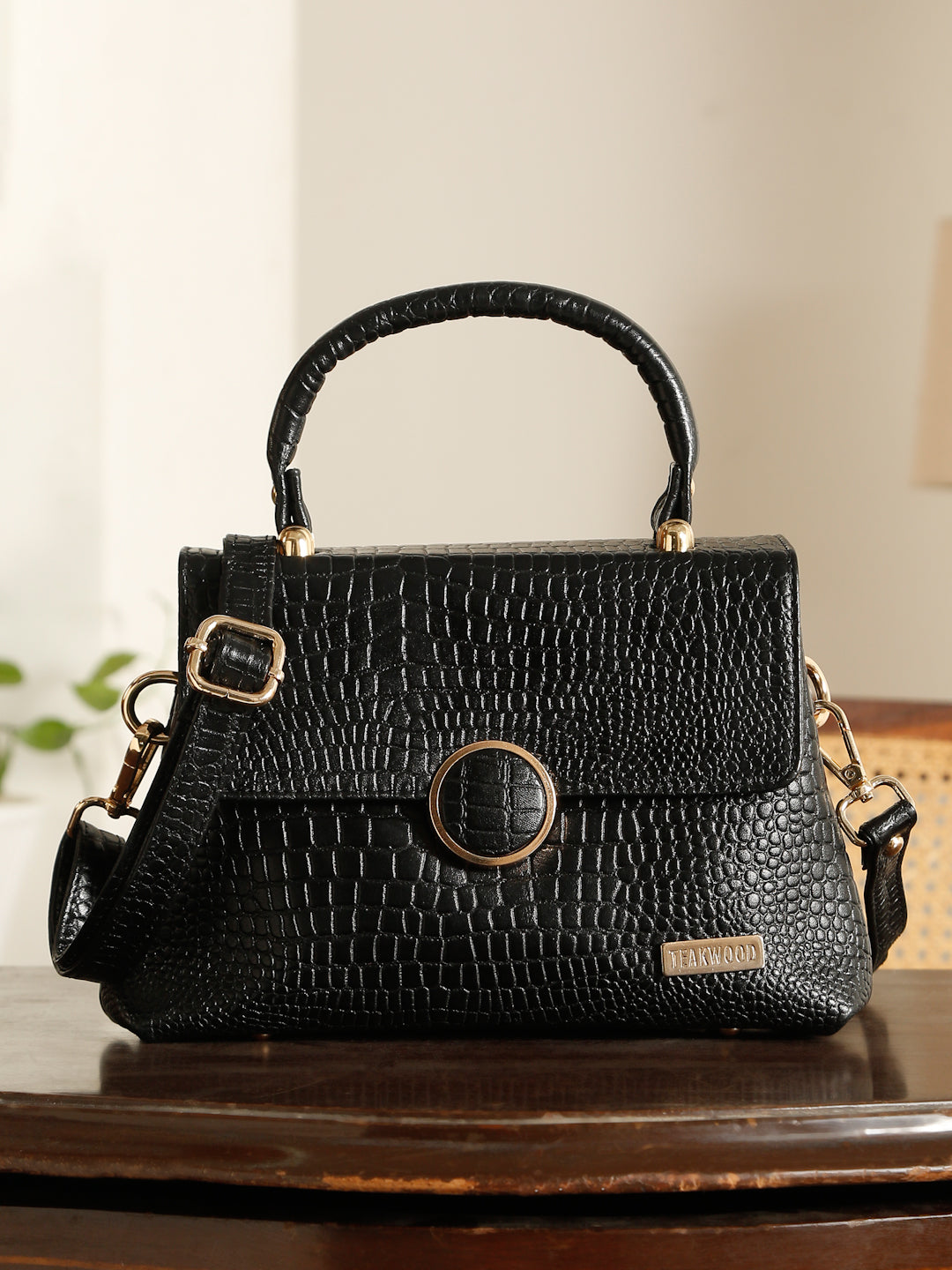 This Teakwood leather hand bag is made of genuine leather the of this bag gives a rich look, The main flap closure features a prominent round metallic clasp which also has the croc texture detail in the center. Gold-toned metallic hardware is used throughout, providing a luxurious contrast to the dark brown material. It has a single, rigid top handle and an adjustable/detachable shoulde strap secured with gold-toned clasps. it have multiple zippered compartments, this hand bag is best for Office, casual outings, daily use, and semi-formal occasions.