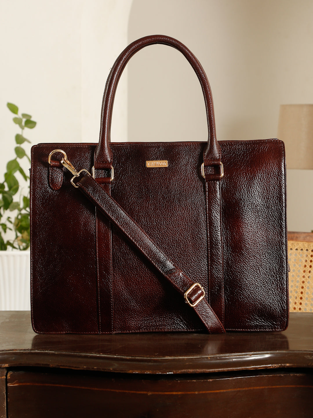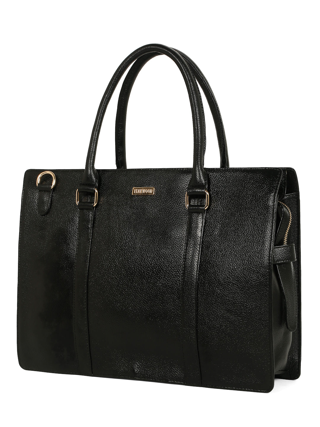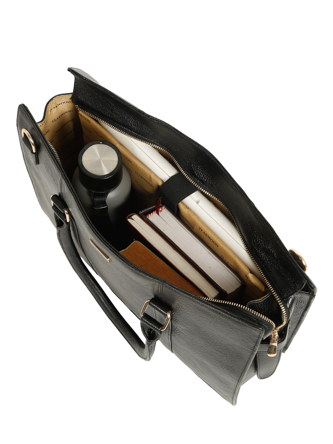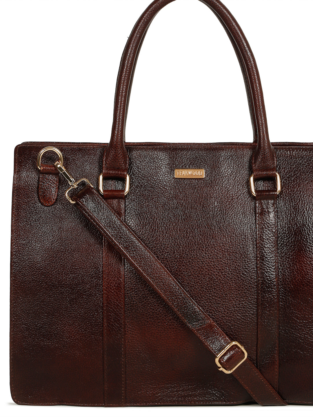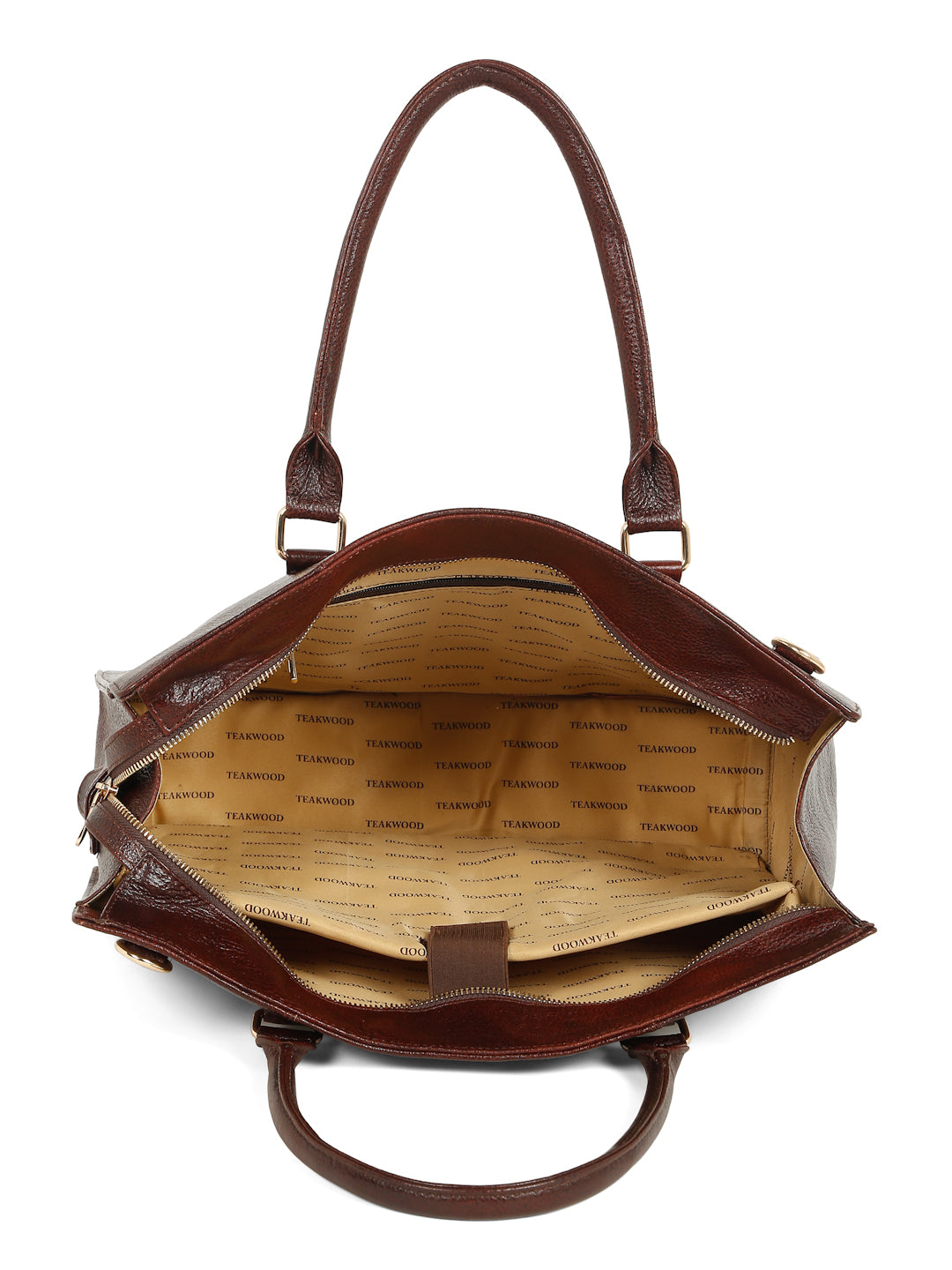 This teakwood leather tote bag is made of genuine leather, The material has a subtle, fine-grained pebbled, ld-toned metallic hardware is used for a sophisticated accent. t features two sturdy, rounded top handles An adjustable, detachable shoulder or crossbody strap is included, secured by gold clasps. A small, horizontal gold-toned metallic plaque is positioned prominently near the top center of the bag that bearing the brand name Teakwood. The bag has a wide-opening, top-zip closure, indicating a secure main compartment. It is designed for high capacity and organization the item it holds A laptop, Tablet, Notebook etc.The spacious nature suggests it can hold other daily necessities and is likely intended as a laptop bag or professional tote.