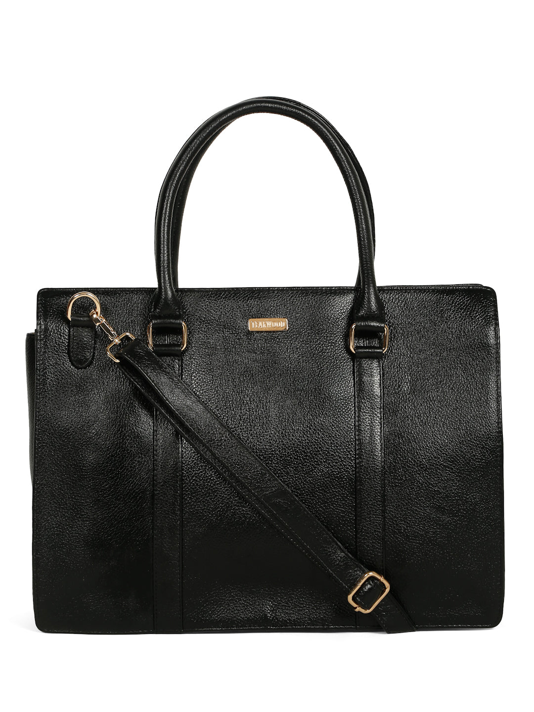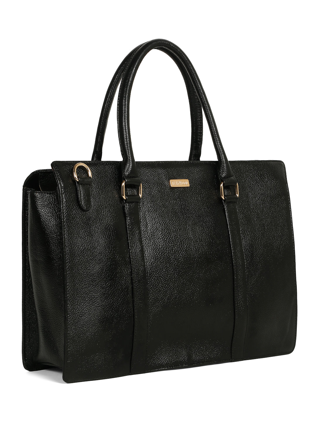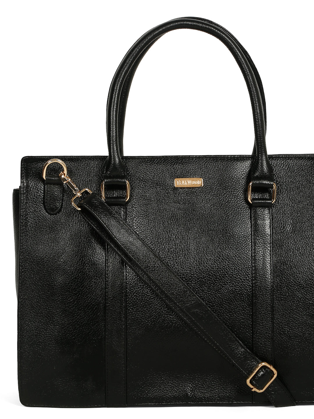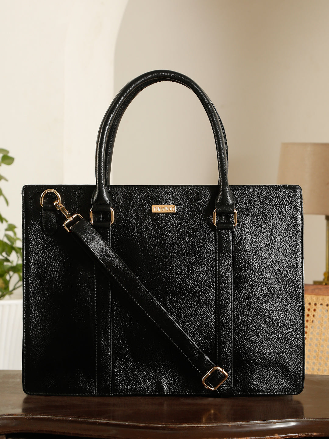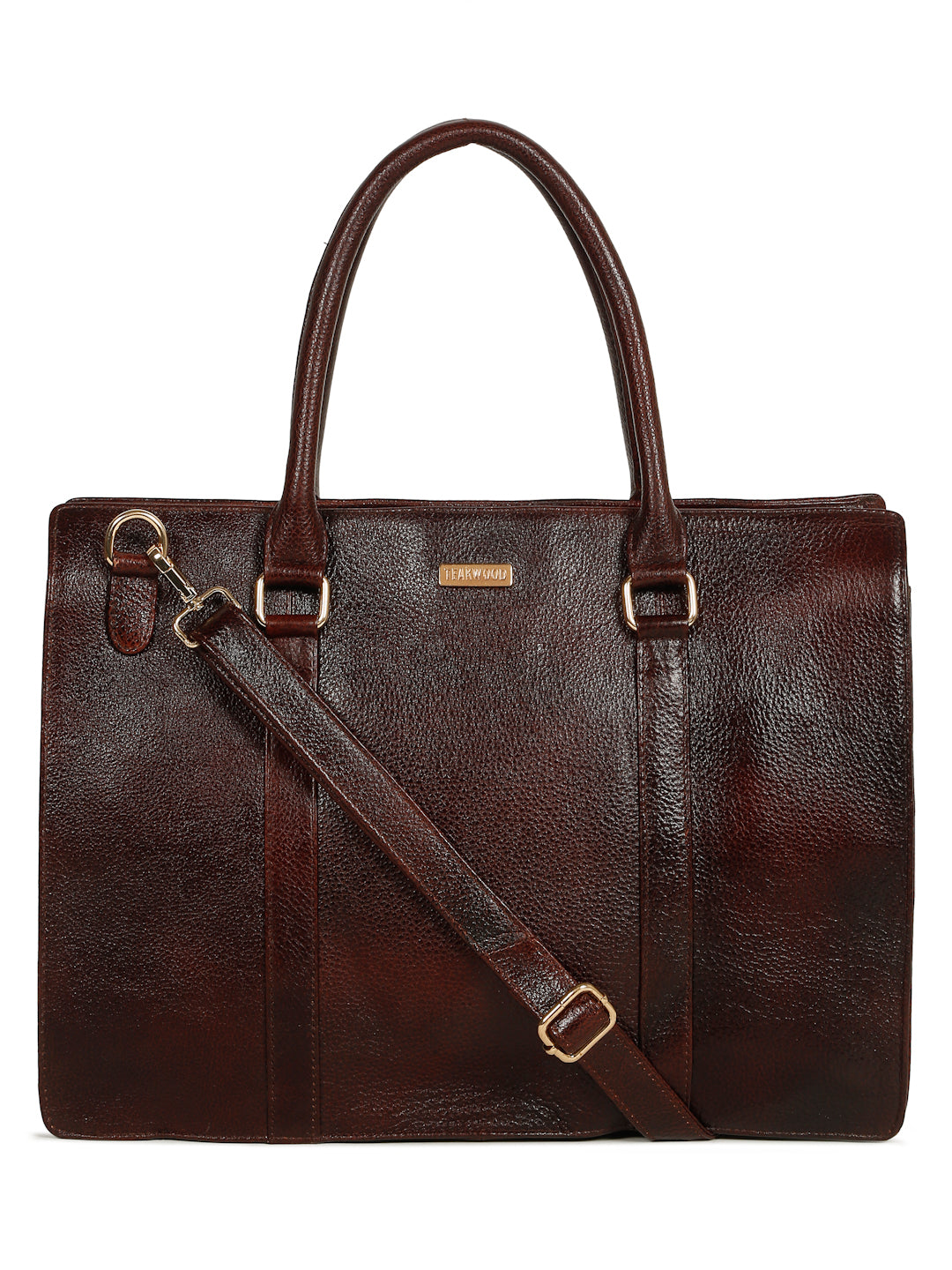 This teakwood leather tote bag is made of genuine leather, The material has a subtle, fine-grained pebbled, ld-toned metallic hardware is used for a sophisticated accent. t features two sturdy, rounded top handles An adjustable, detachable shoulder or crossbody strap is included, secured by gold clasps. A small, horizontal gold-toned metallic plaque is positioned prominently near the top center of the bag that bearing the brand name Teakwood. The bag has a wide-opening, top-zip closure, indicating a secure main compartment. It is designed for high capacity and organization the item it holds A laptop, Tablet, Notebook etc.The spacious nature suggests it can hold other daily necessities and is likely intended as a laptop bag or professional tote.