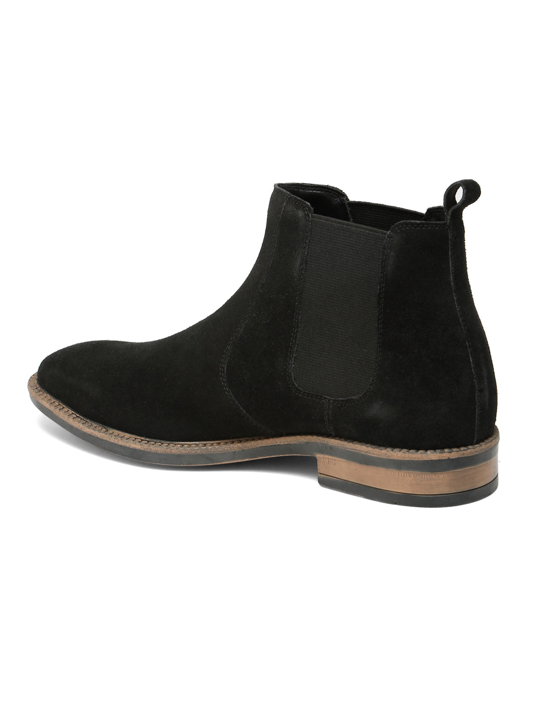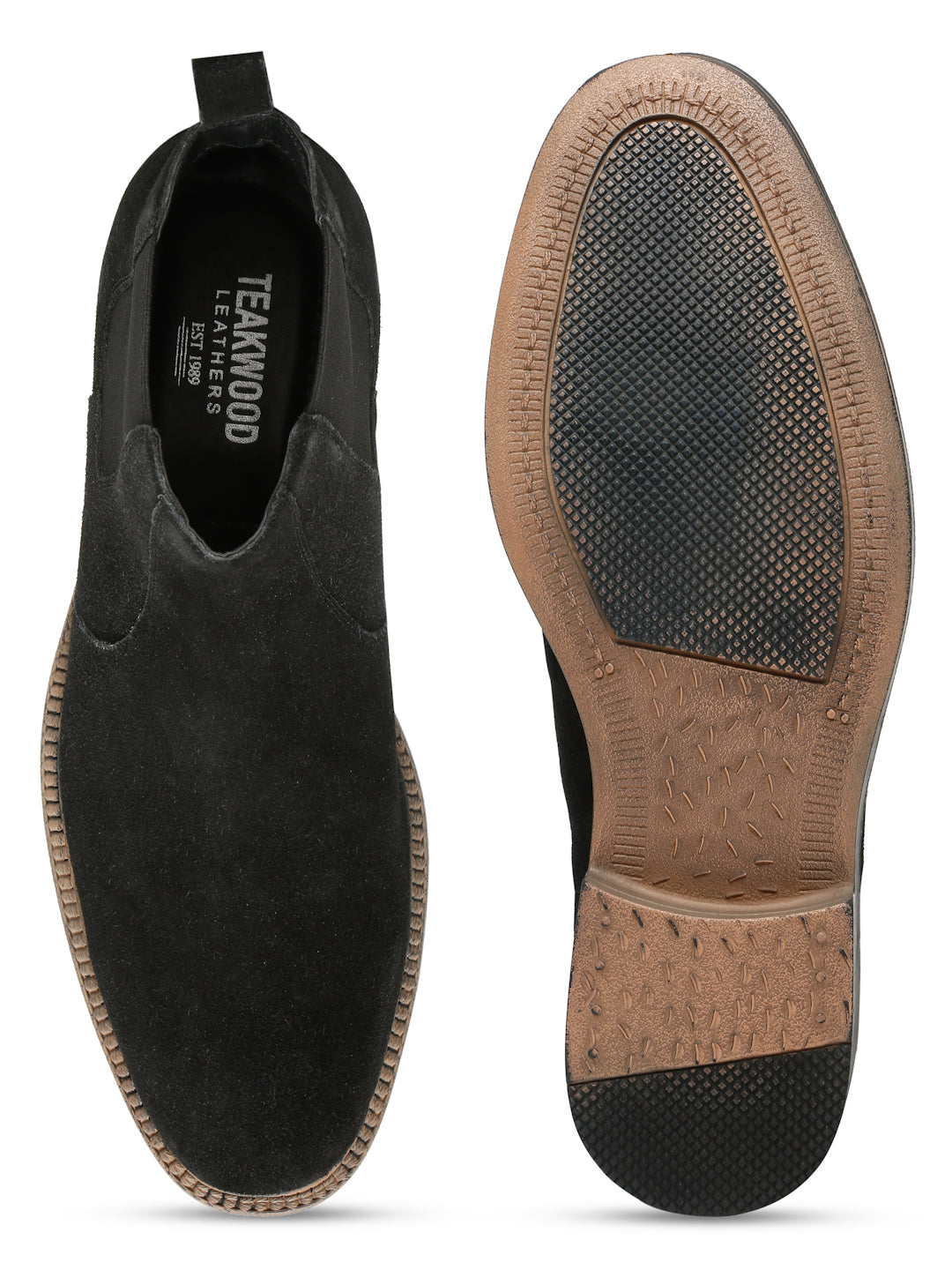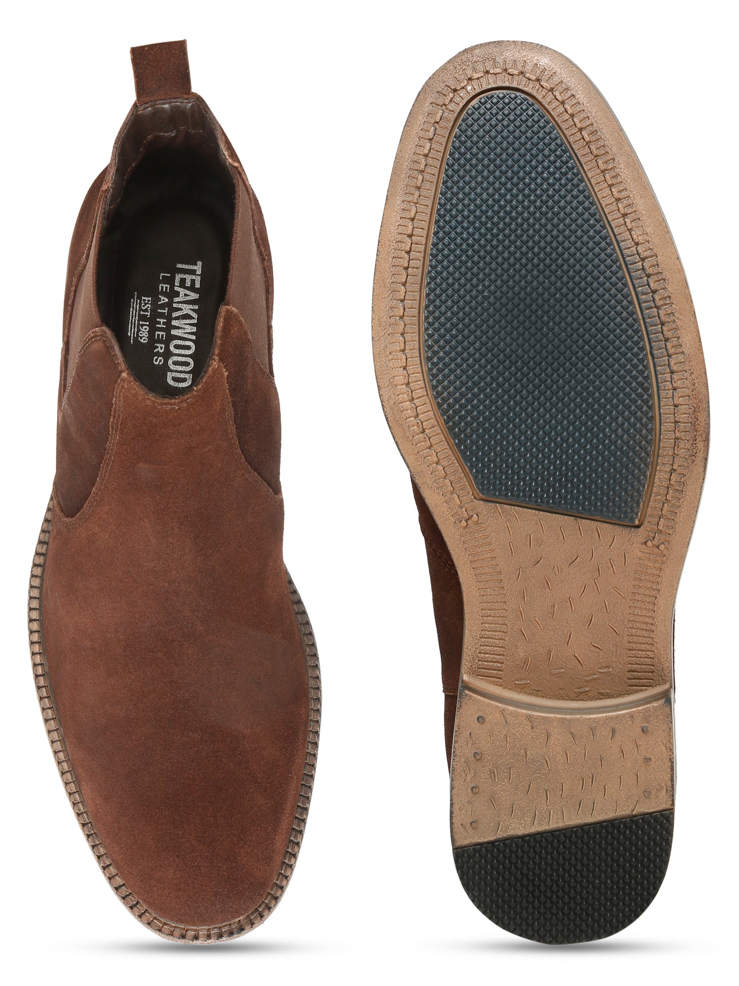 This pair of Teakwood Leather classic Chelsea boots for men, designed for the modern gentleman. Crafted from high-quality genuine leather, these boots offer a rich texture and durable wear. The signature elastic side panels and rear pull tab ensure easy slip-on access and a snug fit. The cushioned insole and soft lining make them ideal for extended wear, while the sturdy TPR sole delivers grip and stability on every step. Whether you're dressing up for a night out or heading to the office, these Chelsea boots bring effortless sophistication to any outfit.