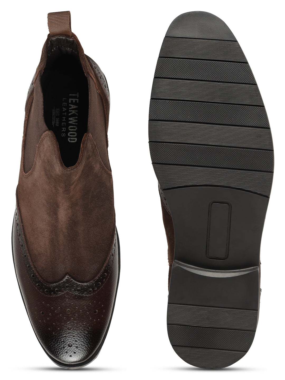 Details: This Teakwood Leathers A pair of brown suede Chelsea boots Featuring laser cut work for a refined and sophisticated look with round toe, mid-top Chelsea boot style with elastic side panels and a pull tab for easy on and off, leather upper, Soft cushioned insole for all-day comfort, has Textured and patterned TPR outsole, has block-heeled