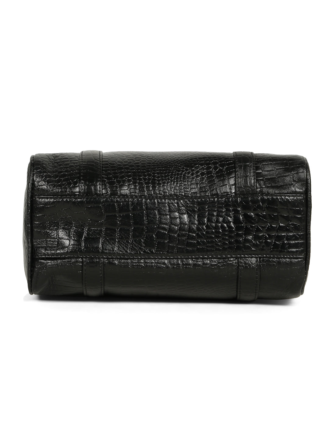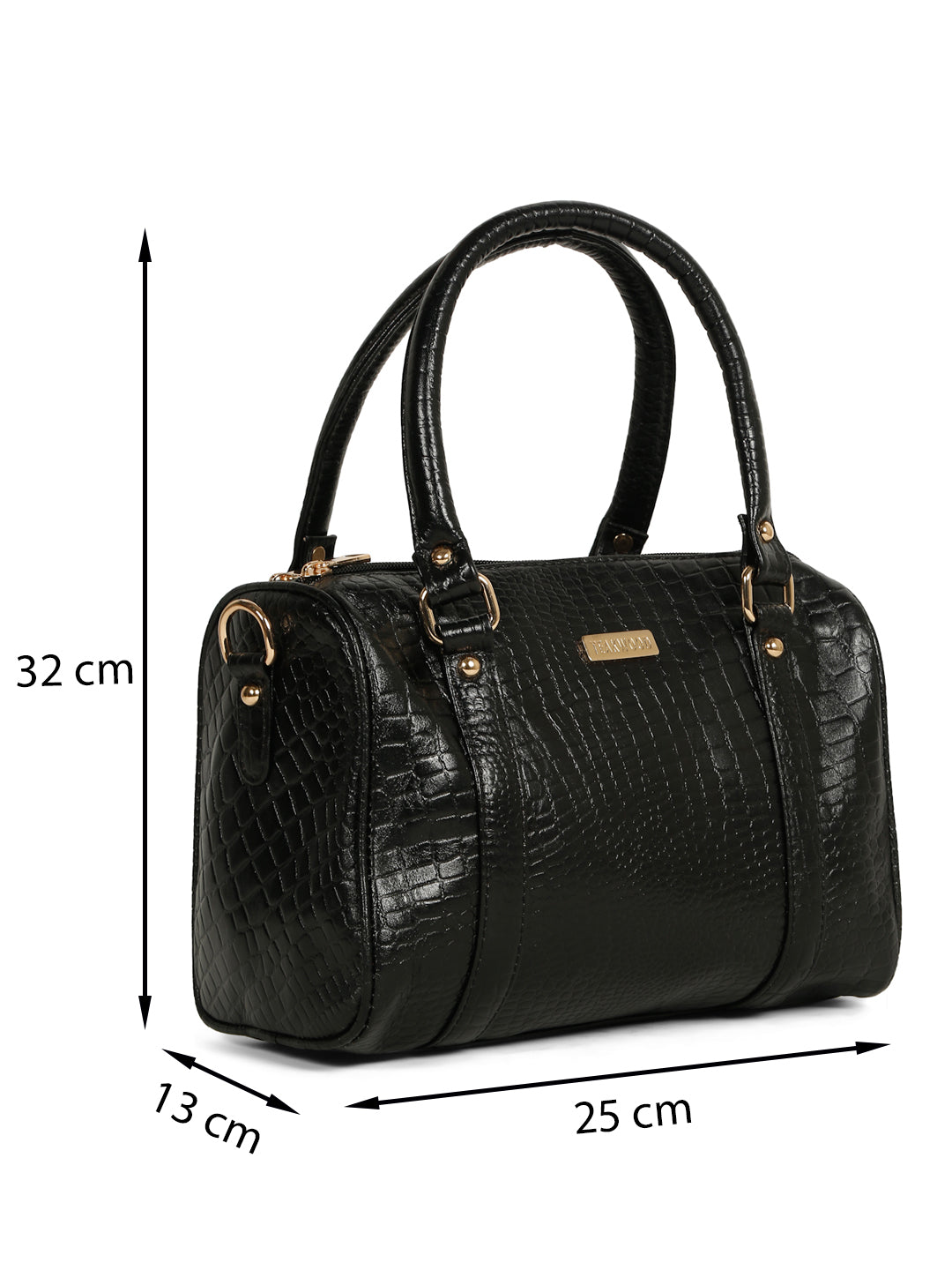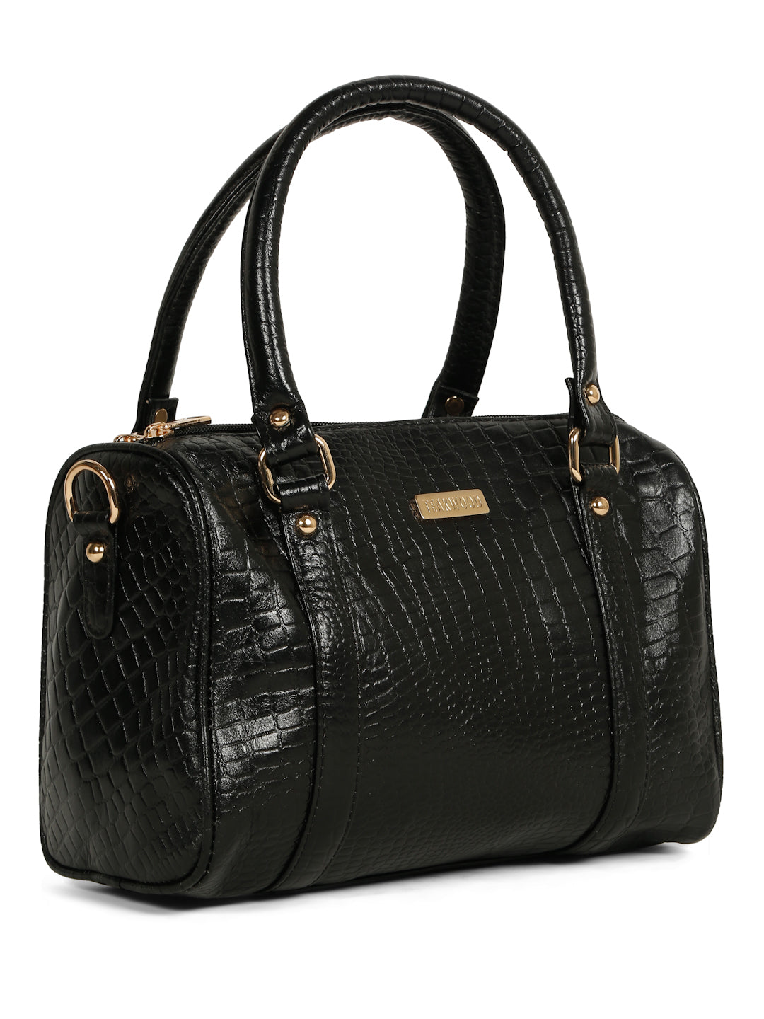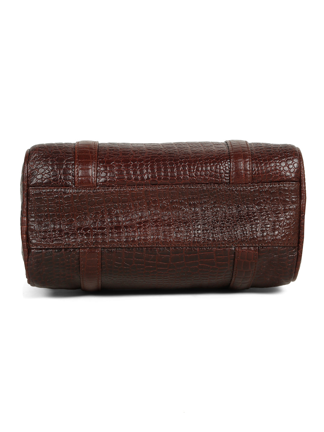 A stylish and compact structured handbag with an all-over crocodile-texture finish. It features a classic barrel/duffle-style silhouette, dual top handles, and gold-tone hardware, giving it a premium and elegant look suitable for everyday use.