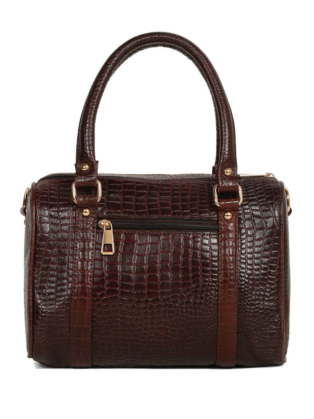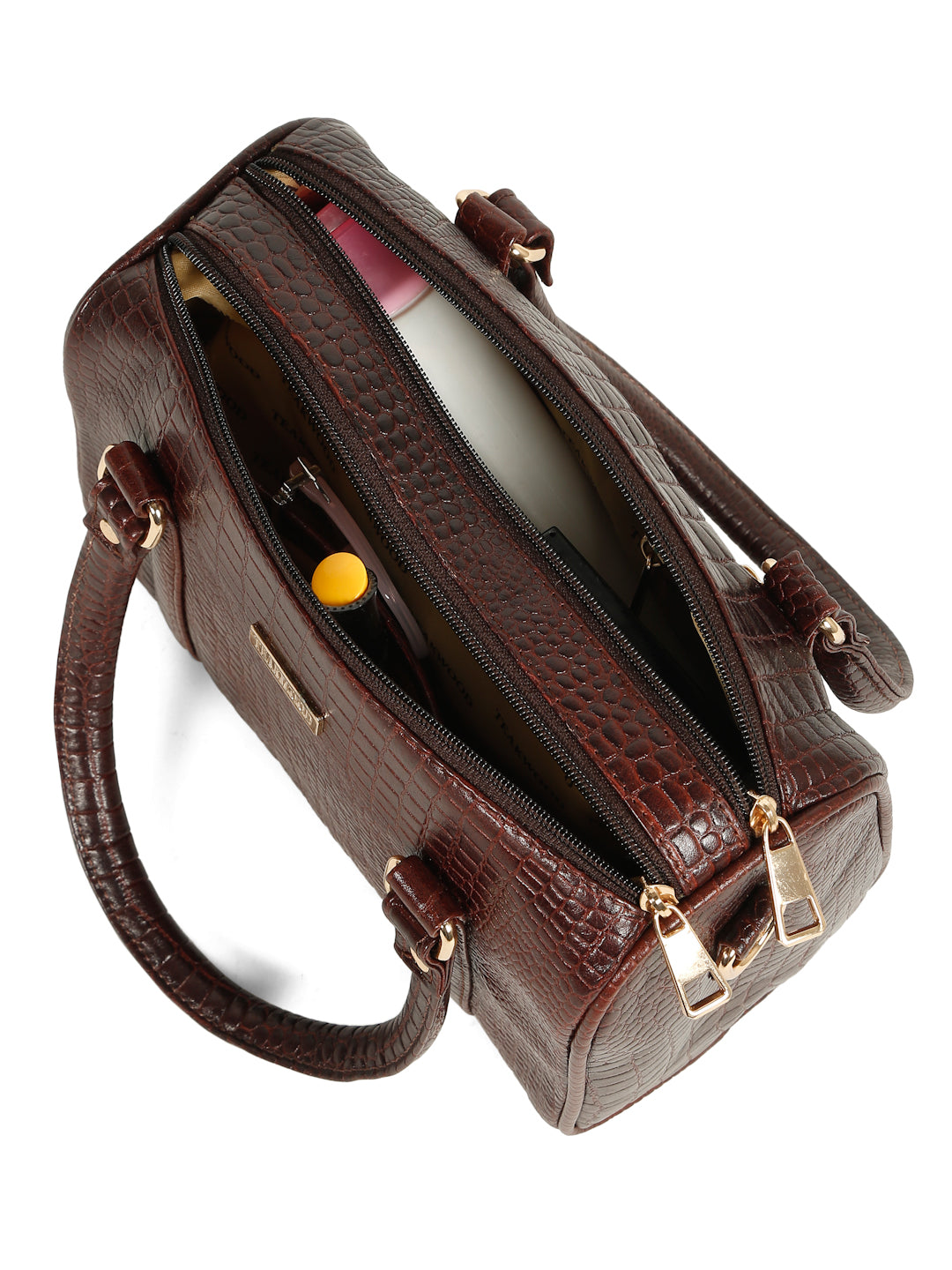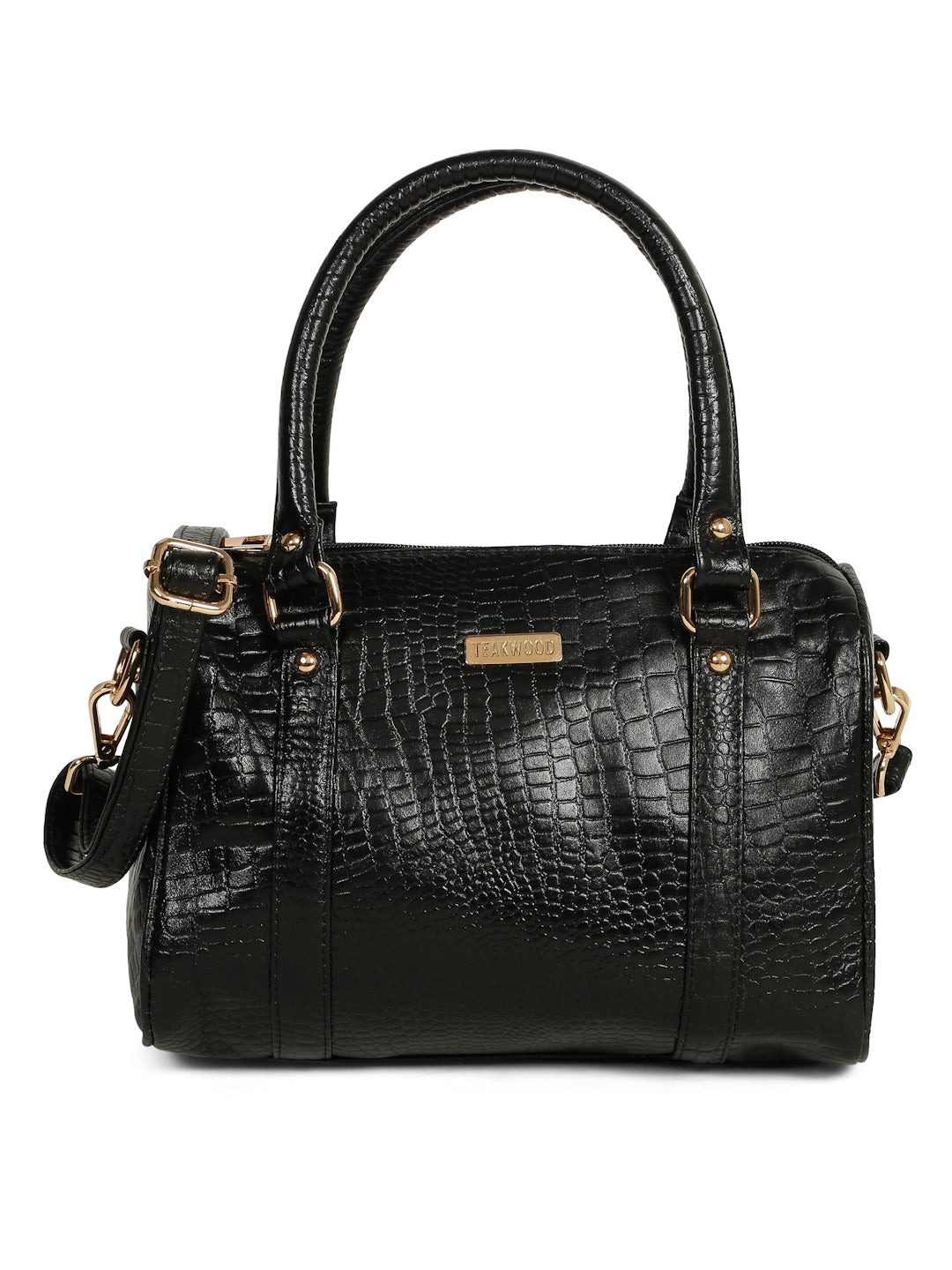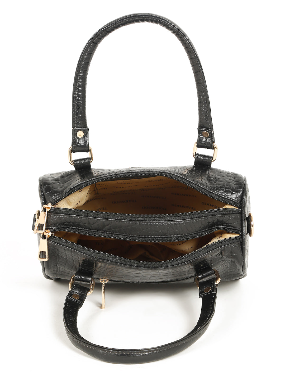 A stylish and compact structured handbag with an all-over crocodile-texture finish. It features a classic barrel/duffle-style silhouette, dual top handles, and gold-tone hardware, giving it a premium and elegant look suitable for everyday use.