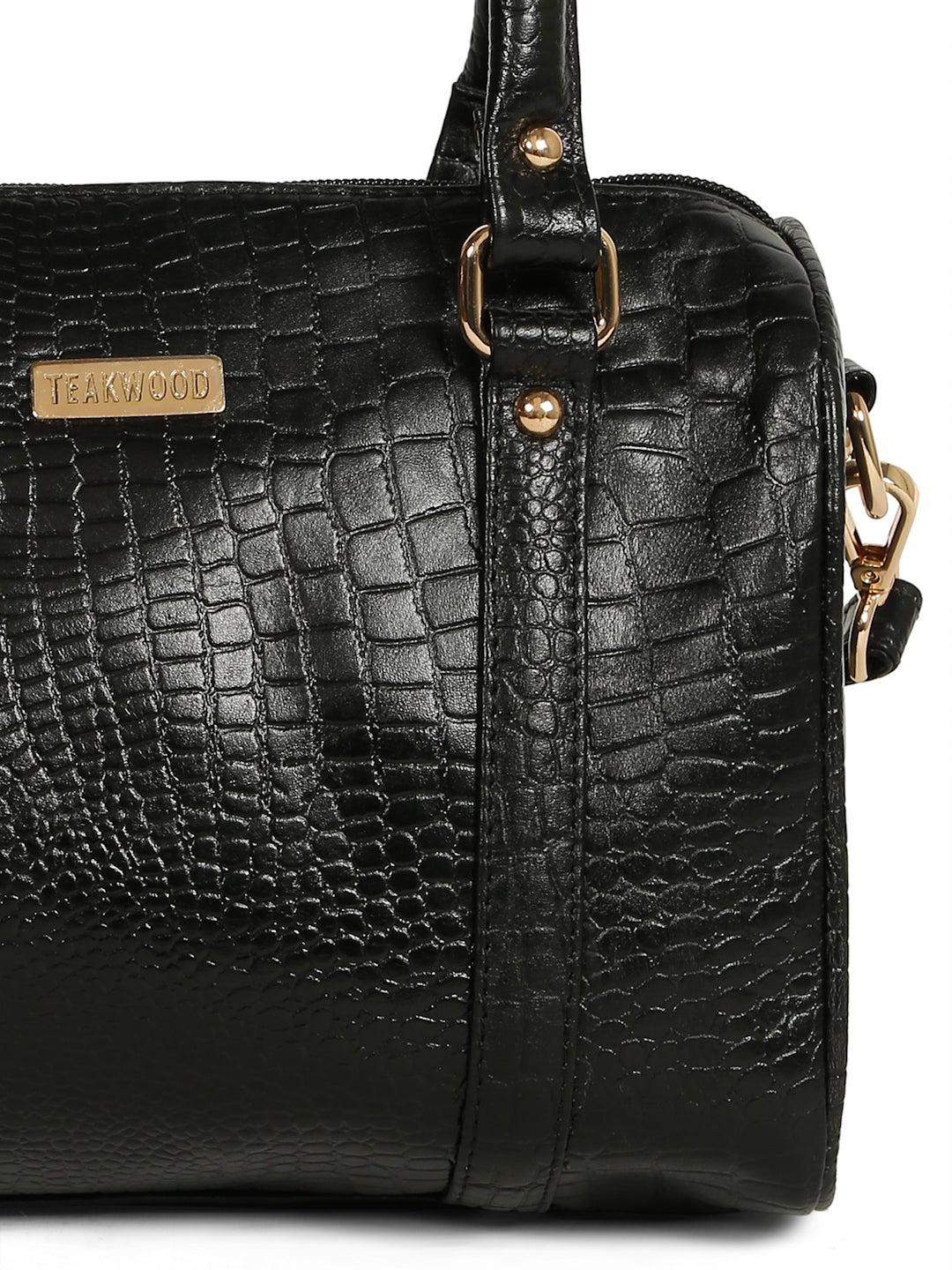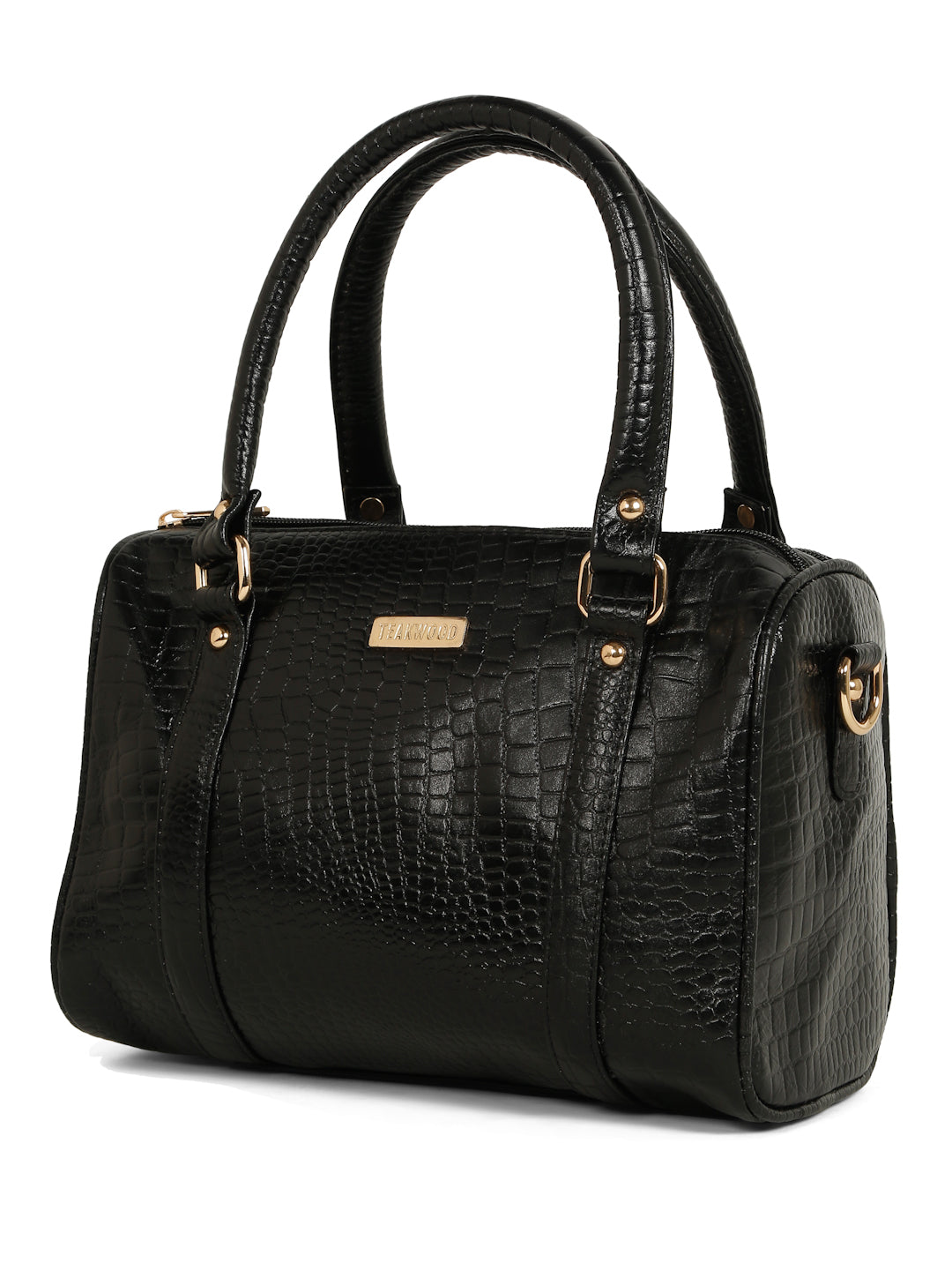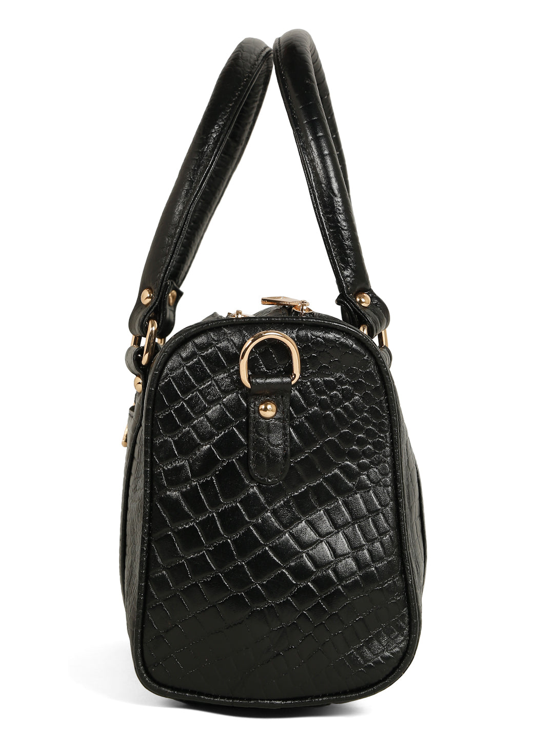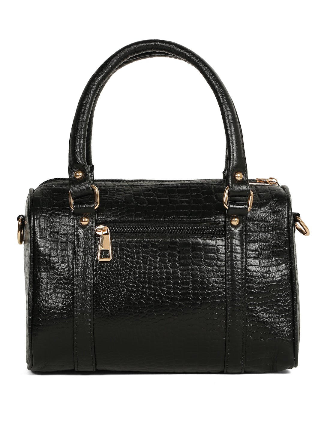 A stylish and compact structured handbag with an all-over crocodile-texture finish. It features a classic barrel/duffle-style silhouette, dual top handles, and gold-tone hardware, giving it a premium and elegant look suitable for everyday use.