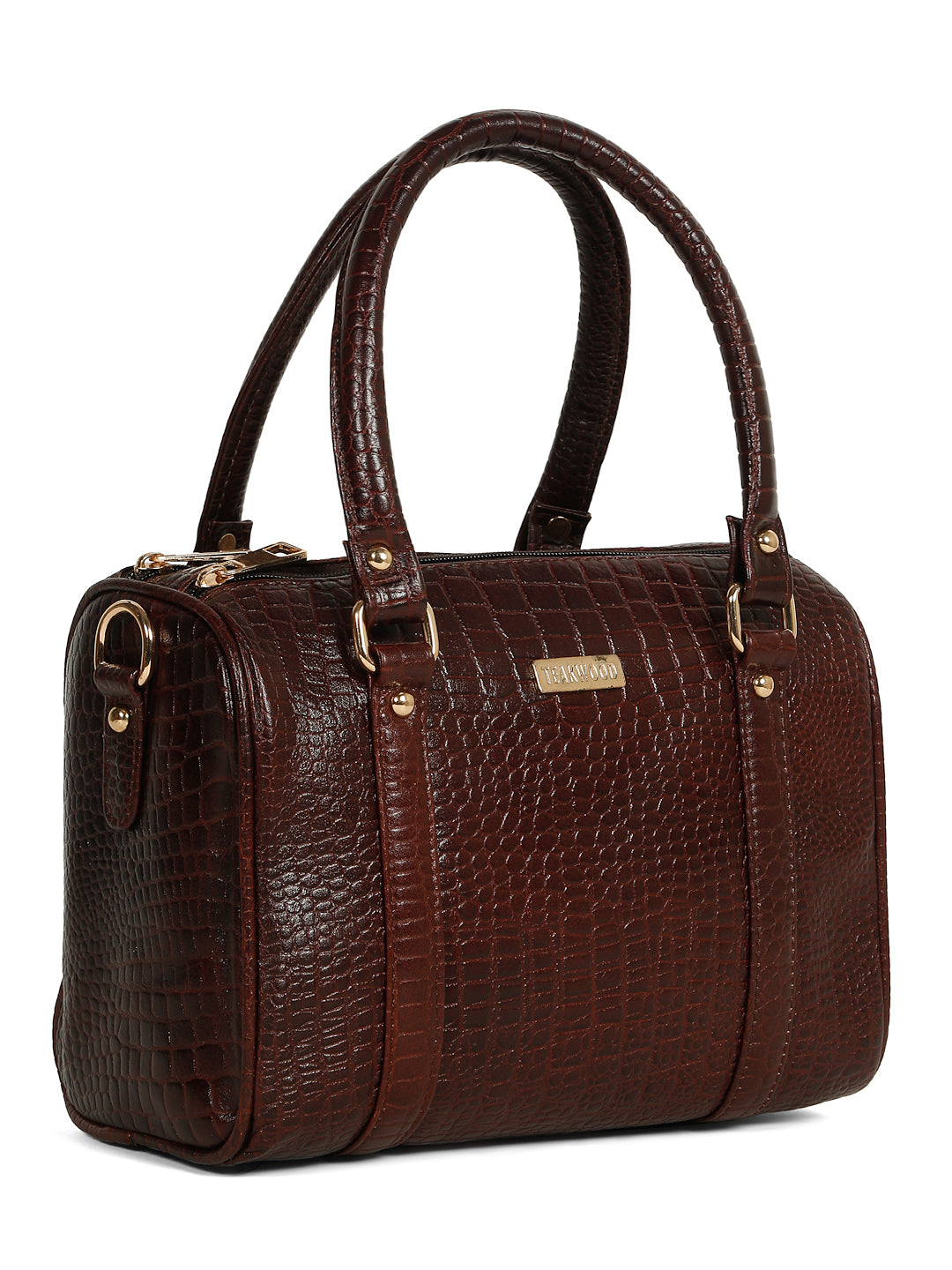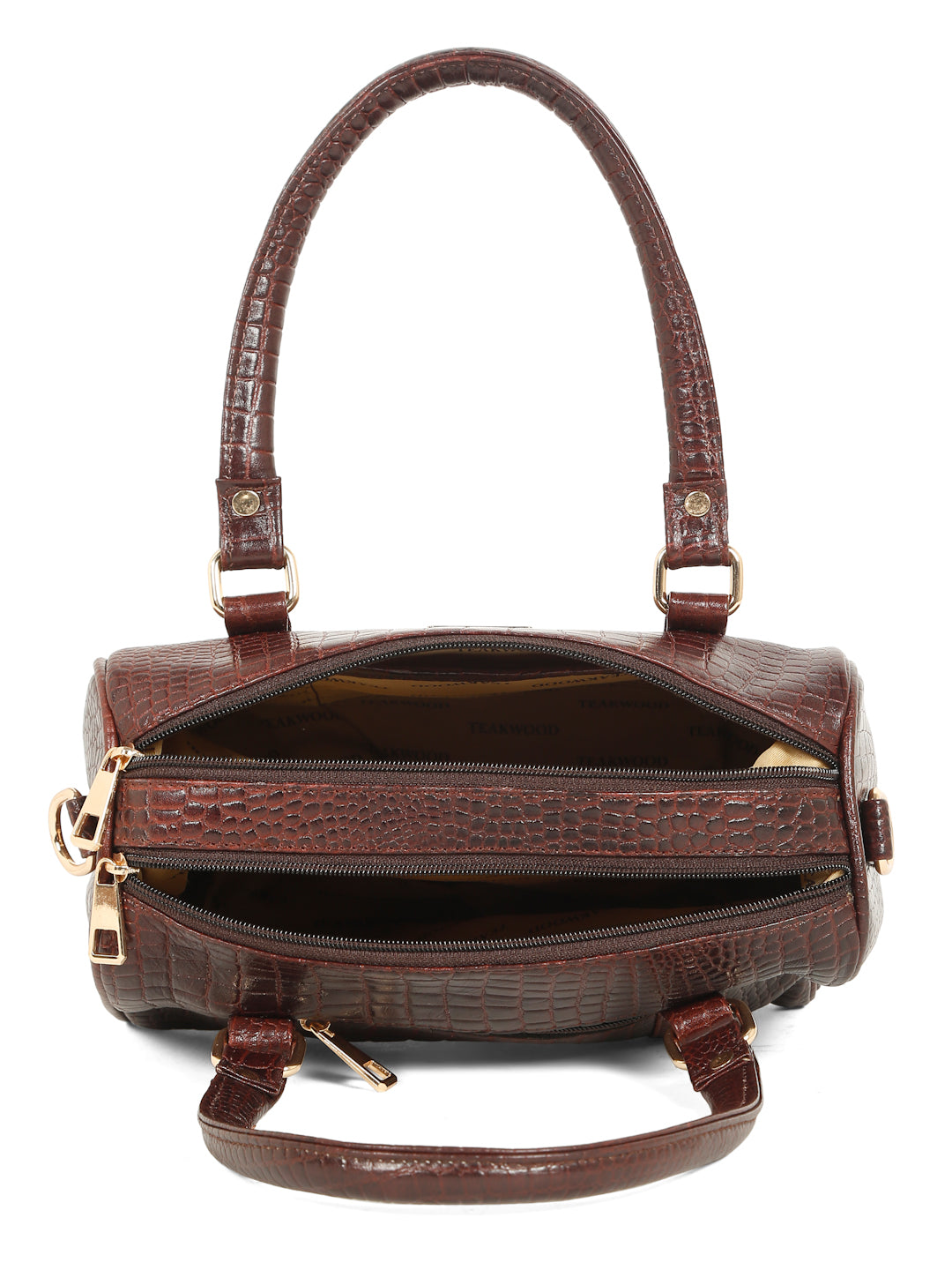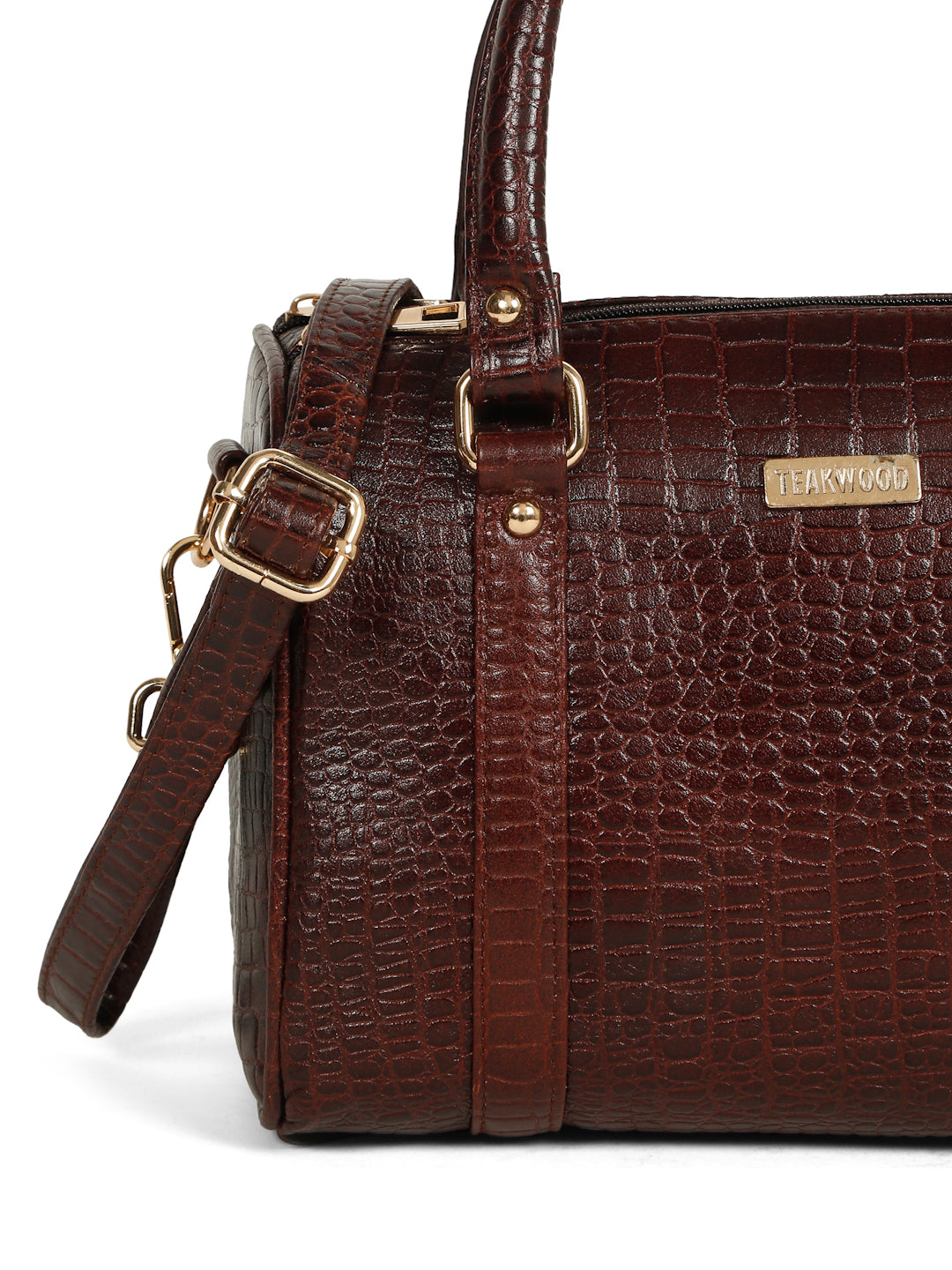 This teakwood leather hand bag made of genuine leather. Rich textured surface for a luxury appearance it have Gold-tone metal fittings and zippers, Sturdy double top handles, Adjustable and detachable shoulder strap,Dual main compartments with zipper closure, Spacious interior for essentials like phone, wallet, cosmetics, small notebook, etc.Double zipper closure on top, best for Daily use, office, outings, casual wear, and short travel.