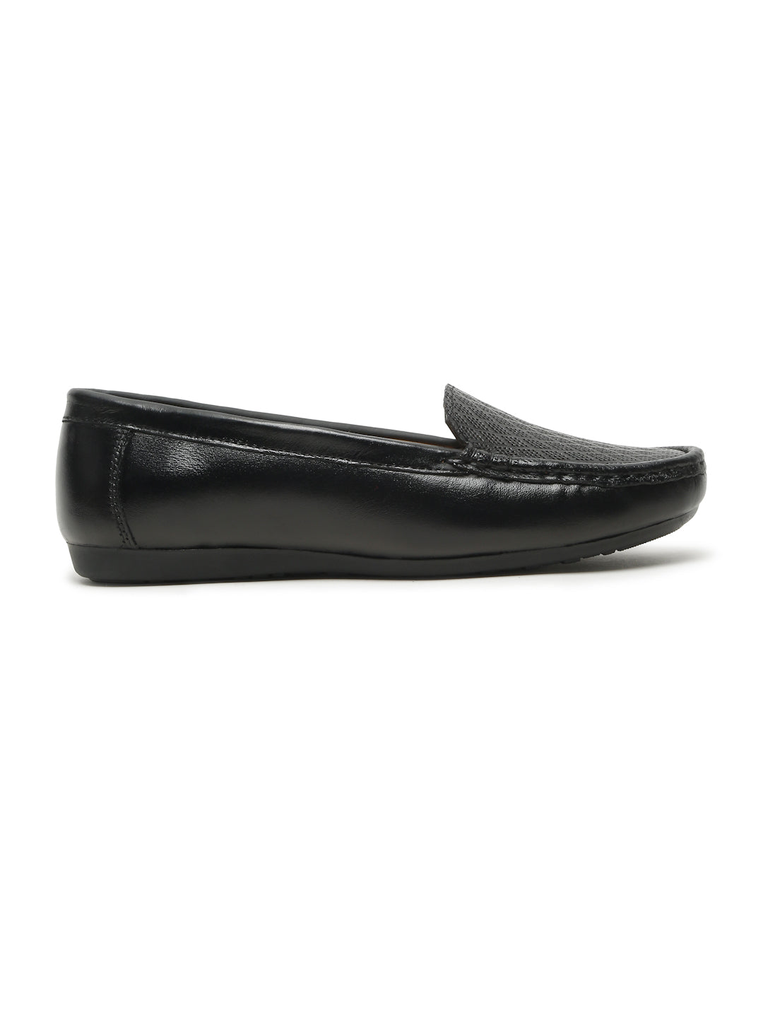 These Teakwood Leathers Black / Brown printed Loafers are a stylish and comfortable choice for modern women. A pair of round toe black printed women loafers, has regualr styling, Slip-on closure, Leather upper, Cushioned footbed, Textured and Patterned TPR outsole. Its suitable for office, casual, and semi-formal occasions.